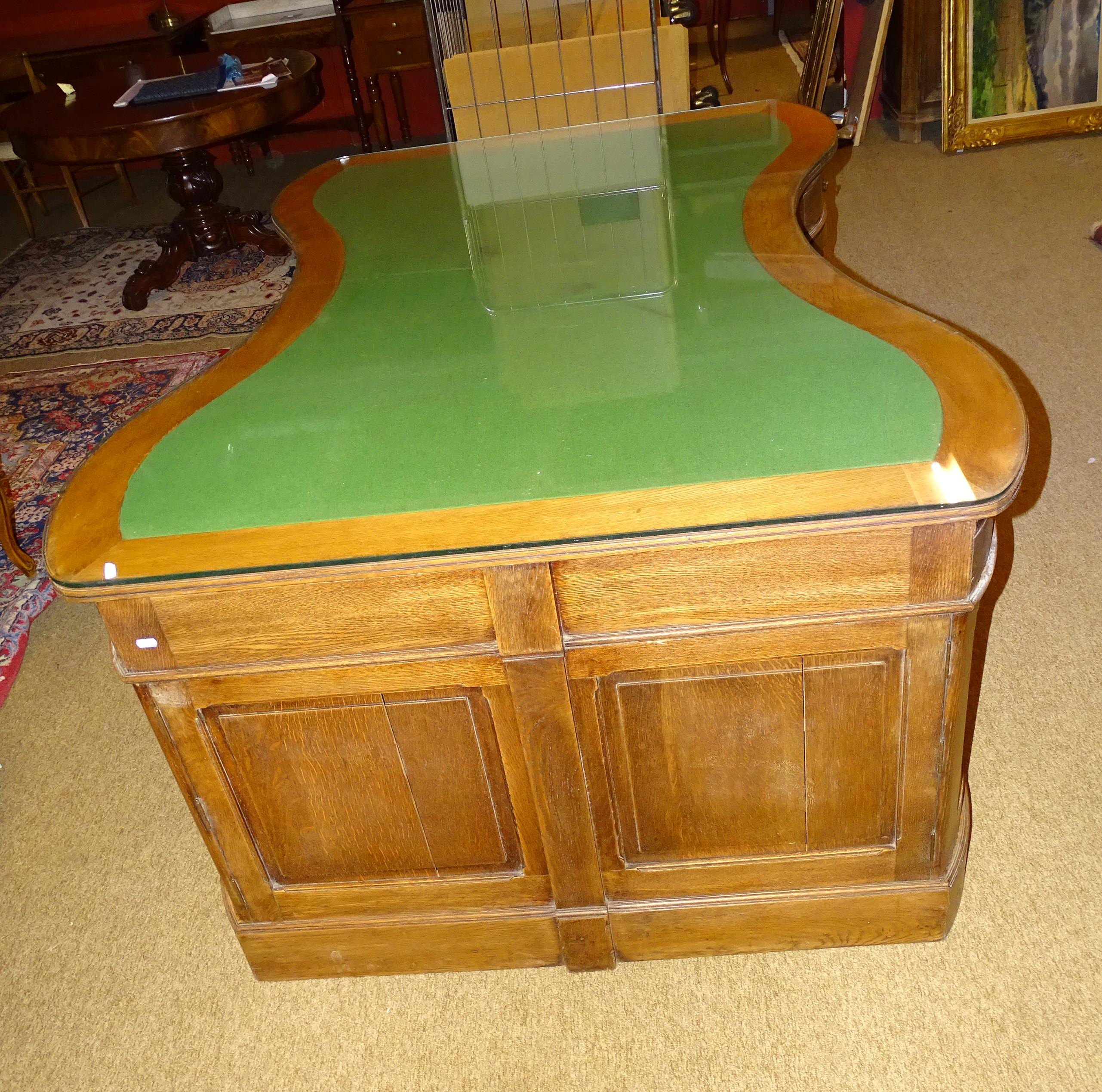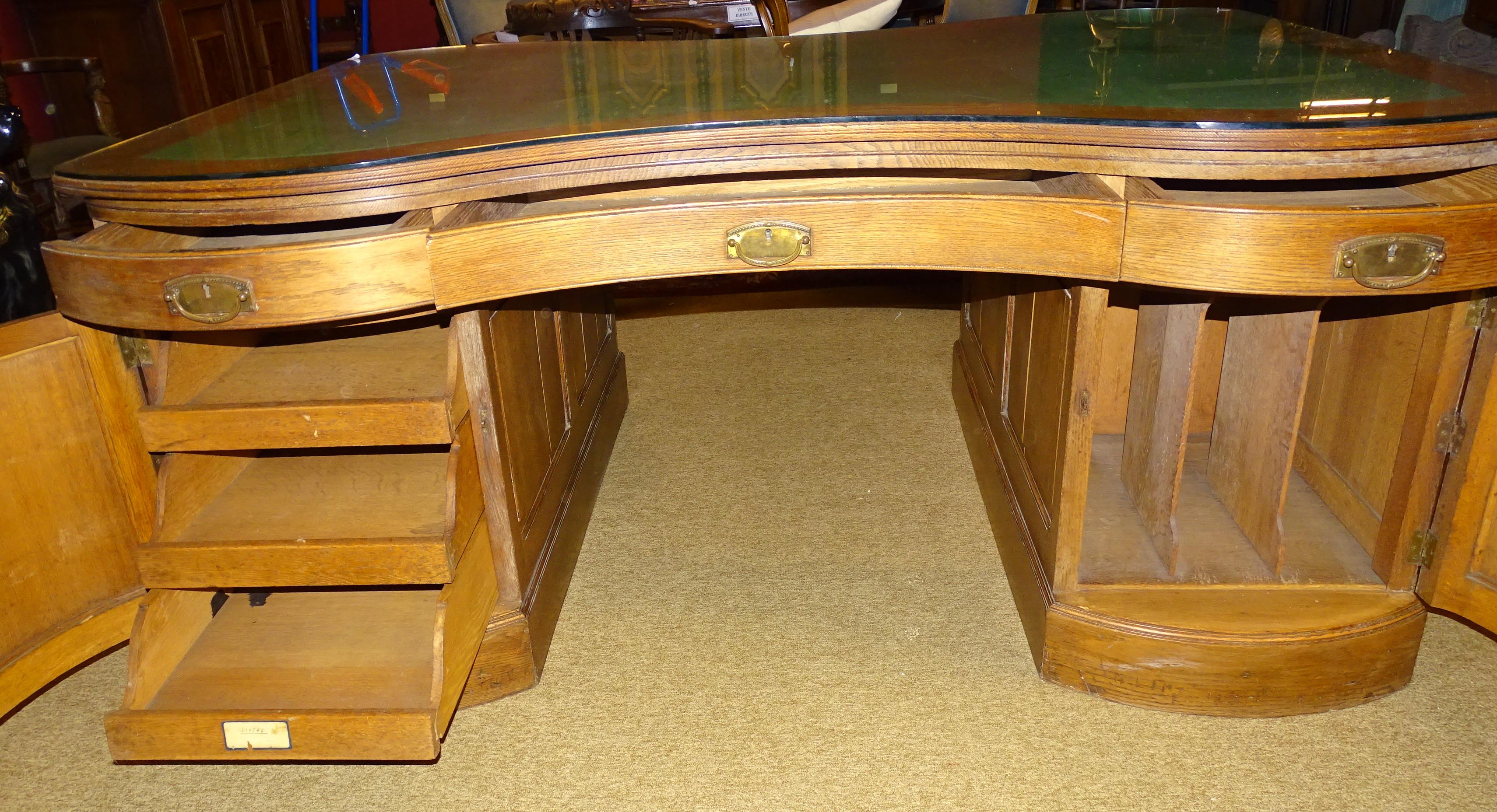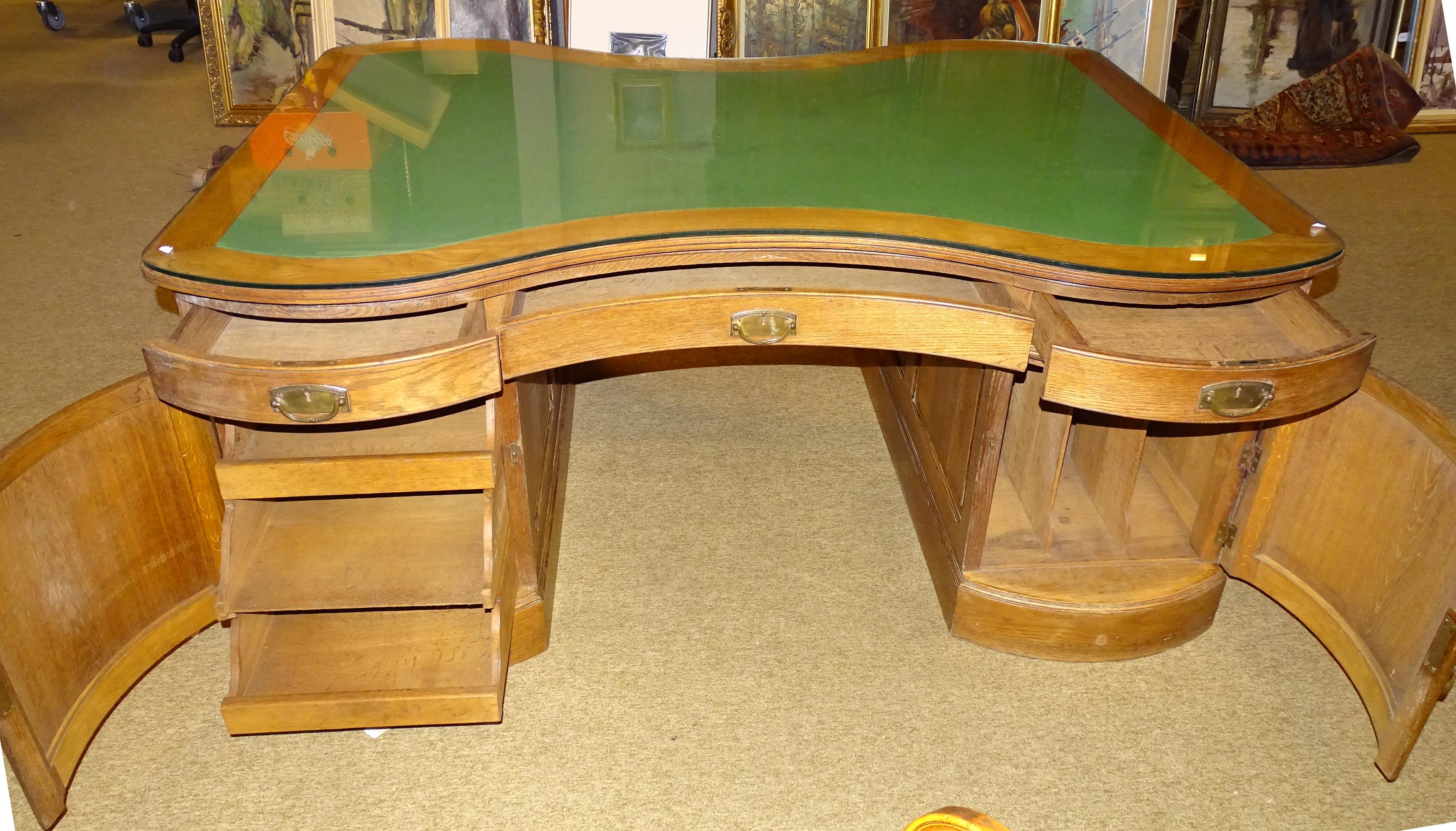 Meuble: Bureau double face/ notaire galbé ARTS and CRAFTS en chêne (mq) vers 1910 dessus verre (1ecl) 3T 2Px2 incrust. nacre filet de marqueterie 80x179x127cm expert Noel HOSTENS