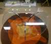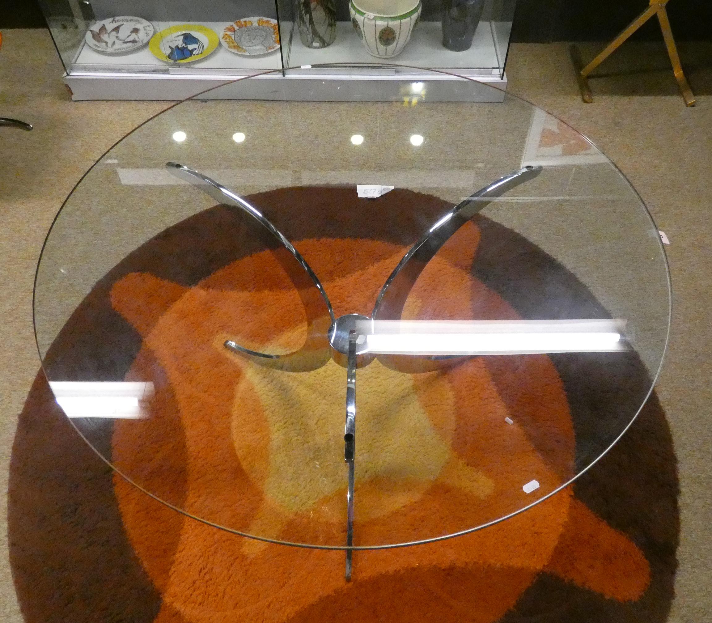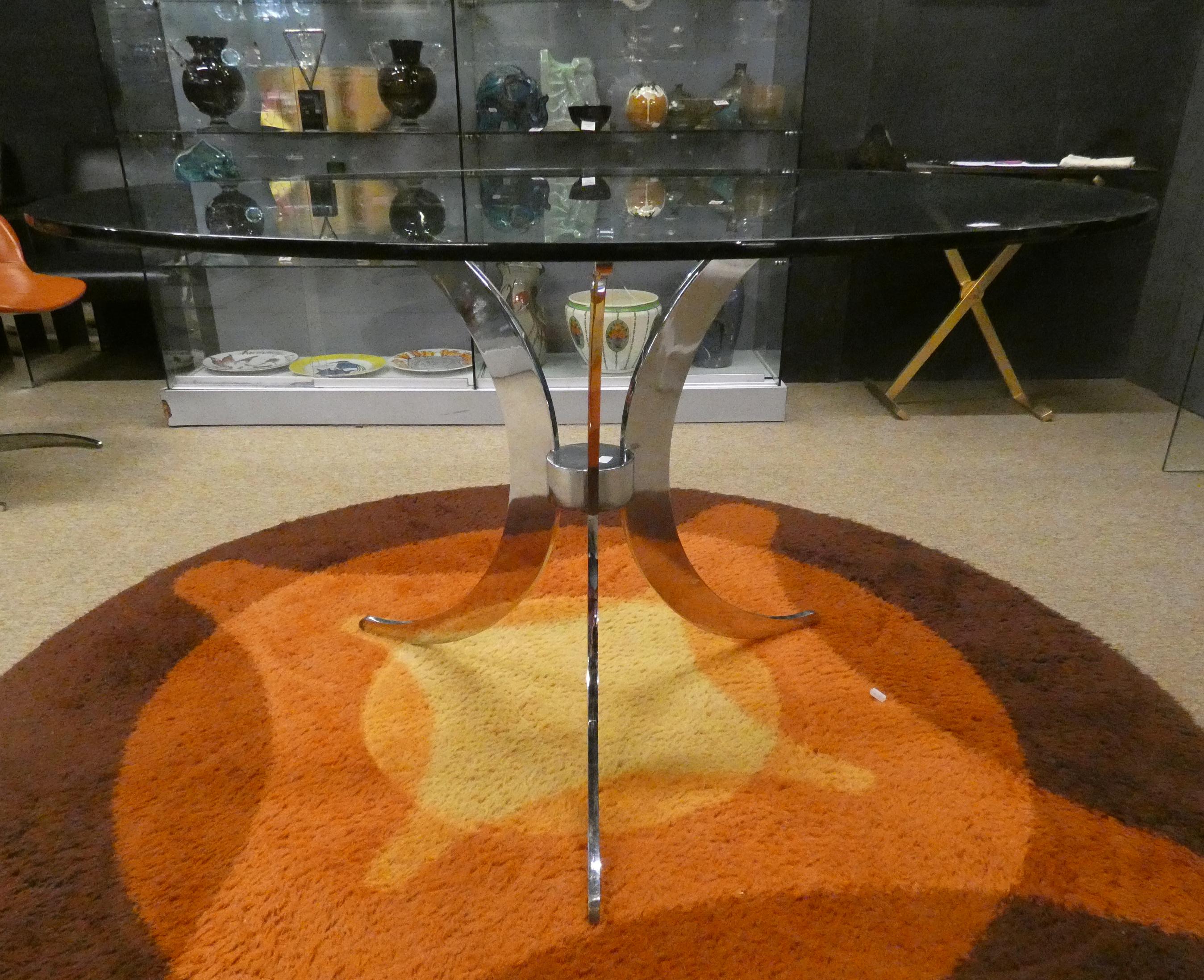 Meuble: Table de salle à manger en verre attribuée à *RINALDI G.* (Gastone) (1920, 2006) piètement chromé H:73cm Diam:120cm