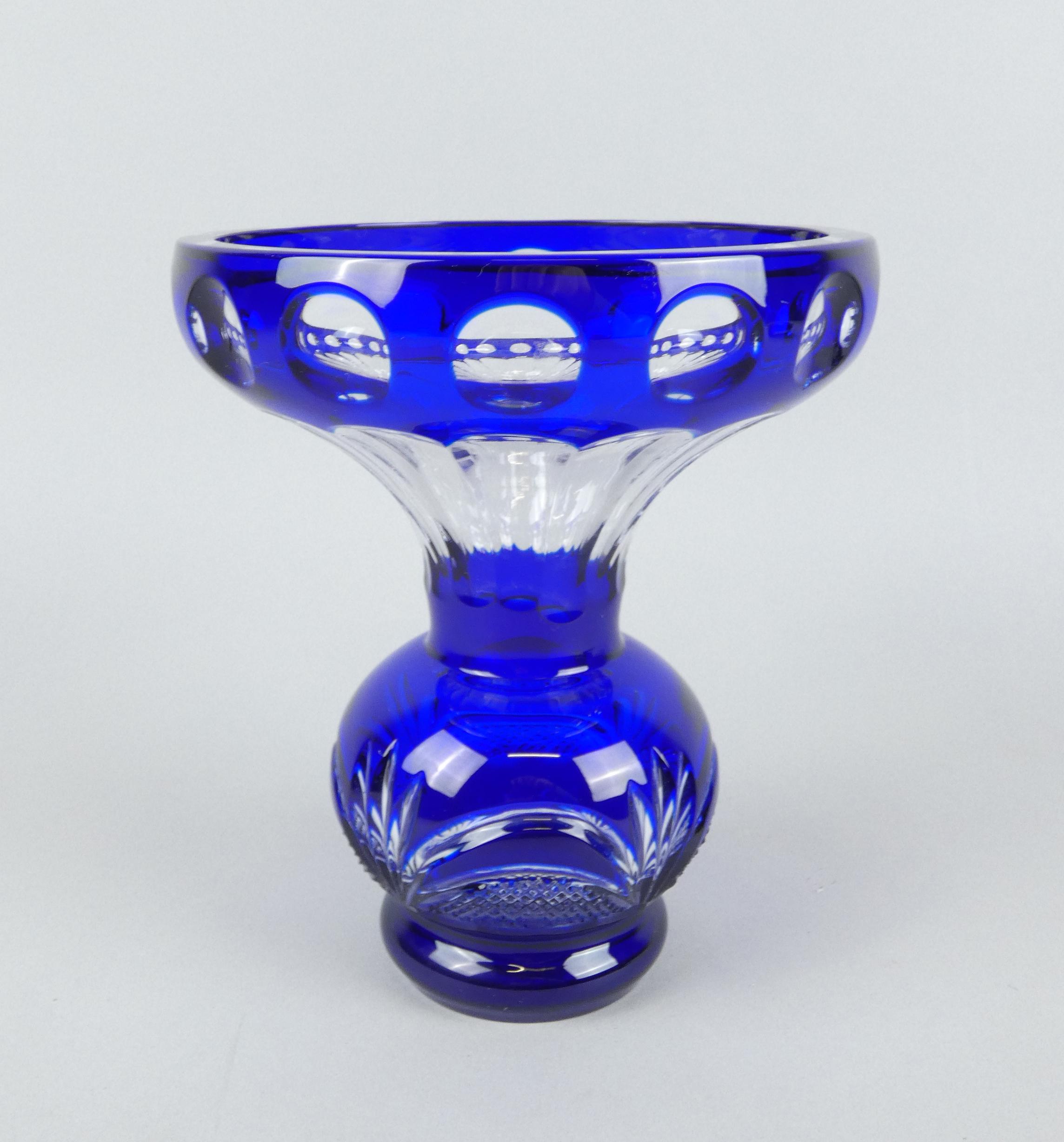 Verrerie: Vase en cristal taillé signé Val Saint Lambert monogrammé PU (pièce unique) bleu et incolore H:20cm
