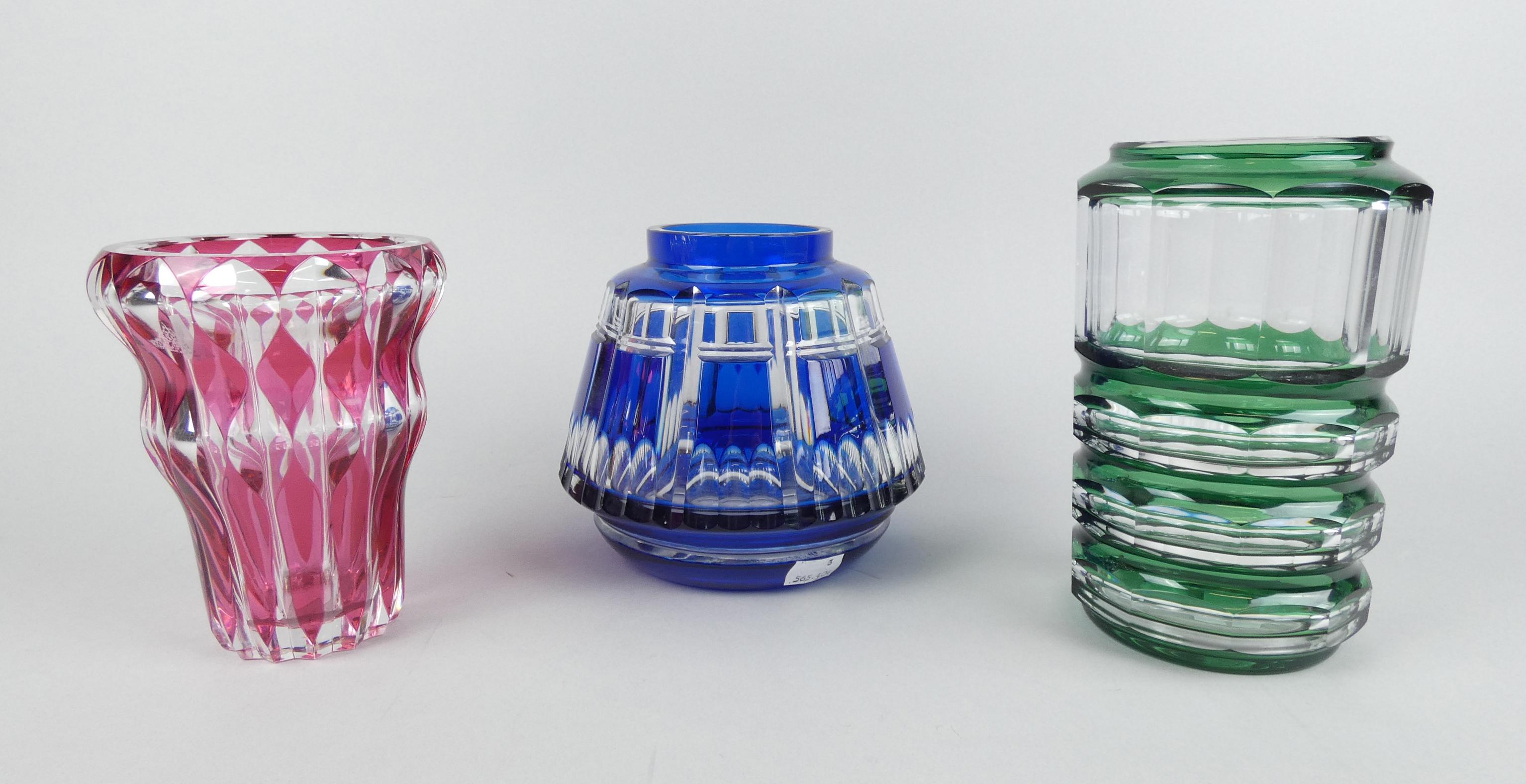 Verrerie: Vase en cristal taillé Val saint Lambert (égrenures sur le bleu) (3) H: 15 / 15 / 18cm
