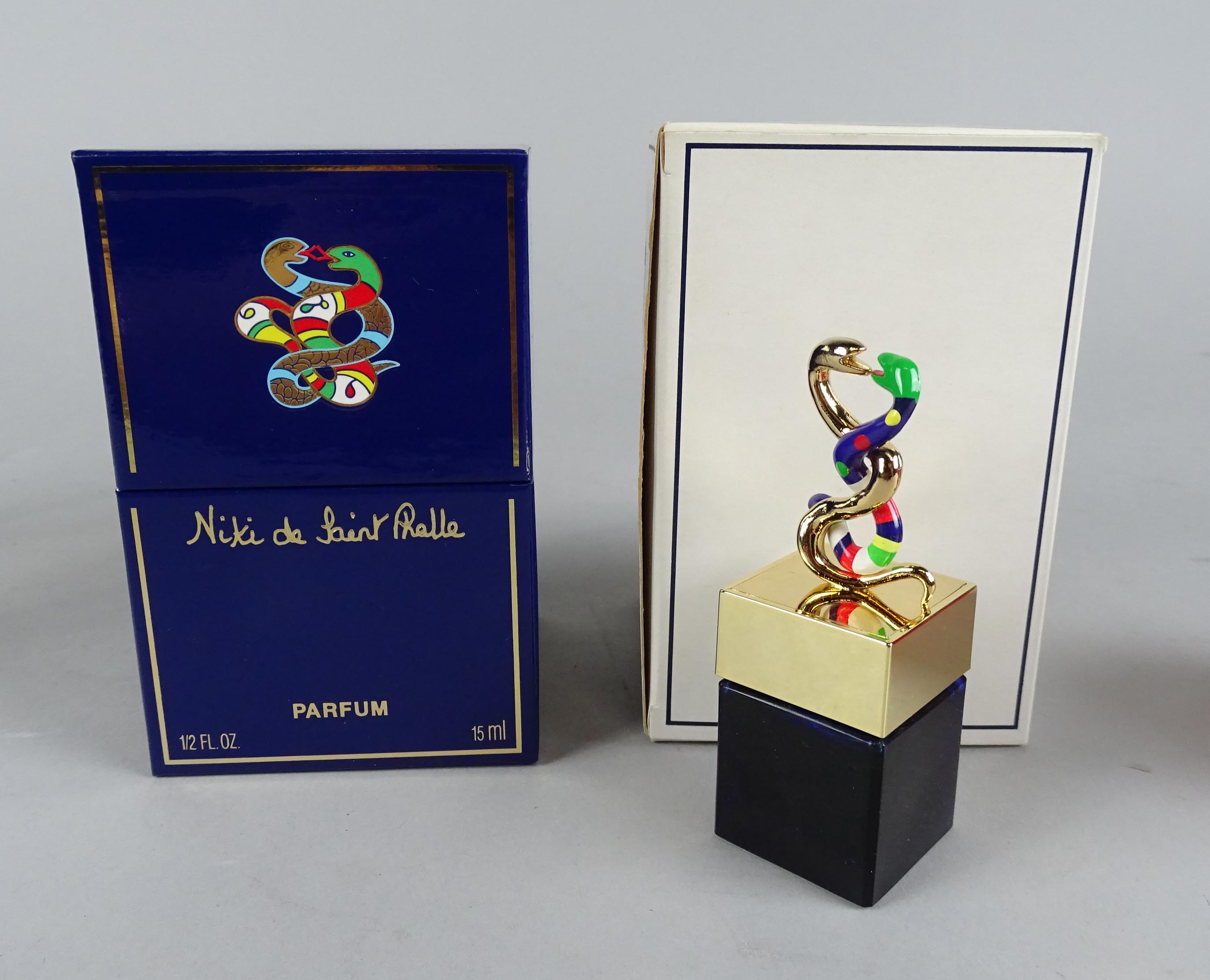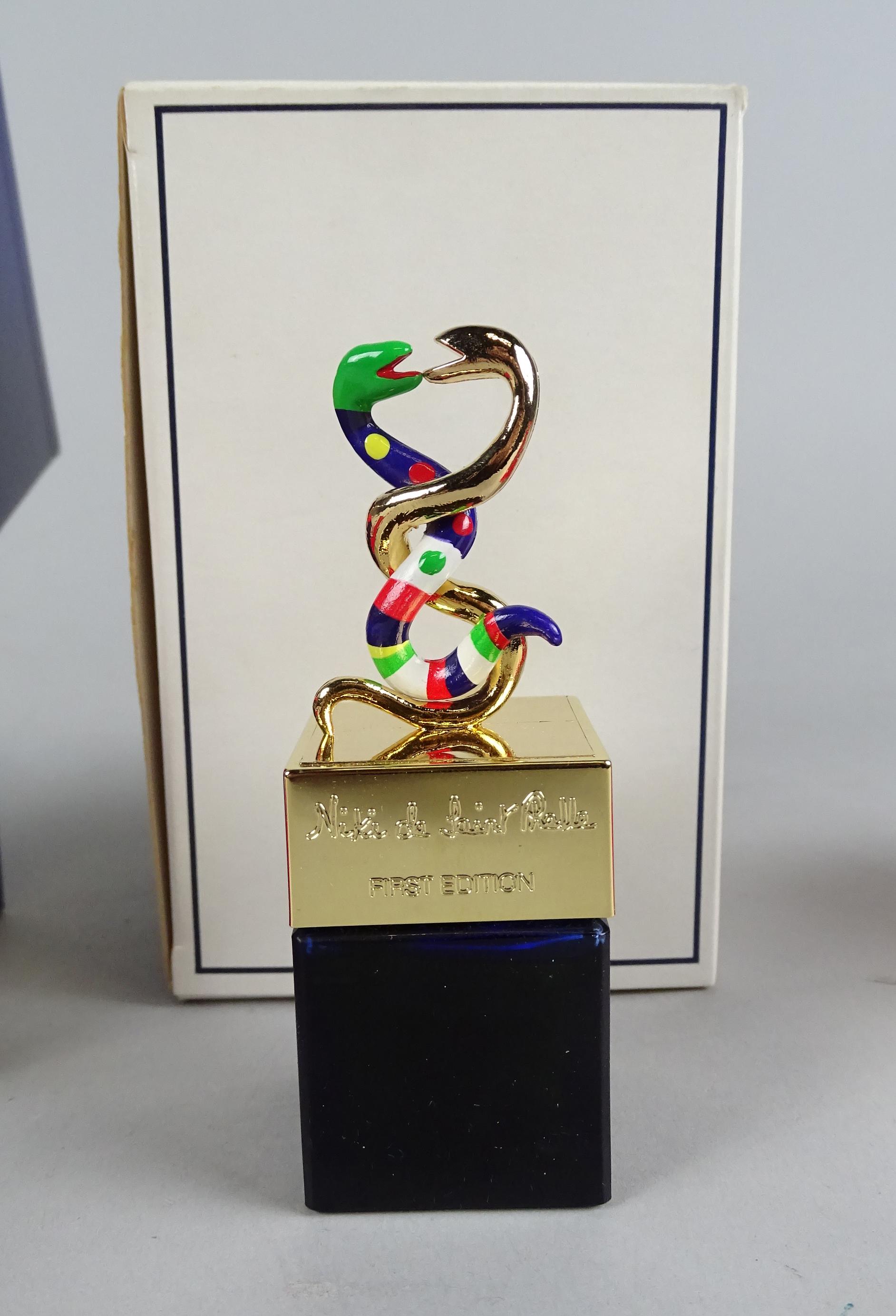 Objet: Flacon de parfum -aux deux Serpents- 1ere édition signé *DE SAINT PHALLE N.* (Niki) (1930. 2002) H: 12cm dans sa boite