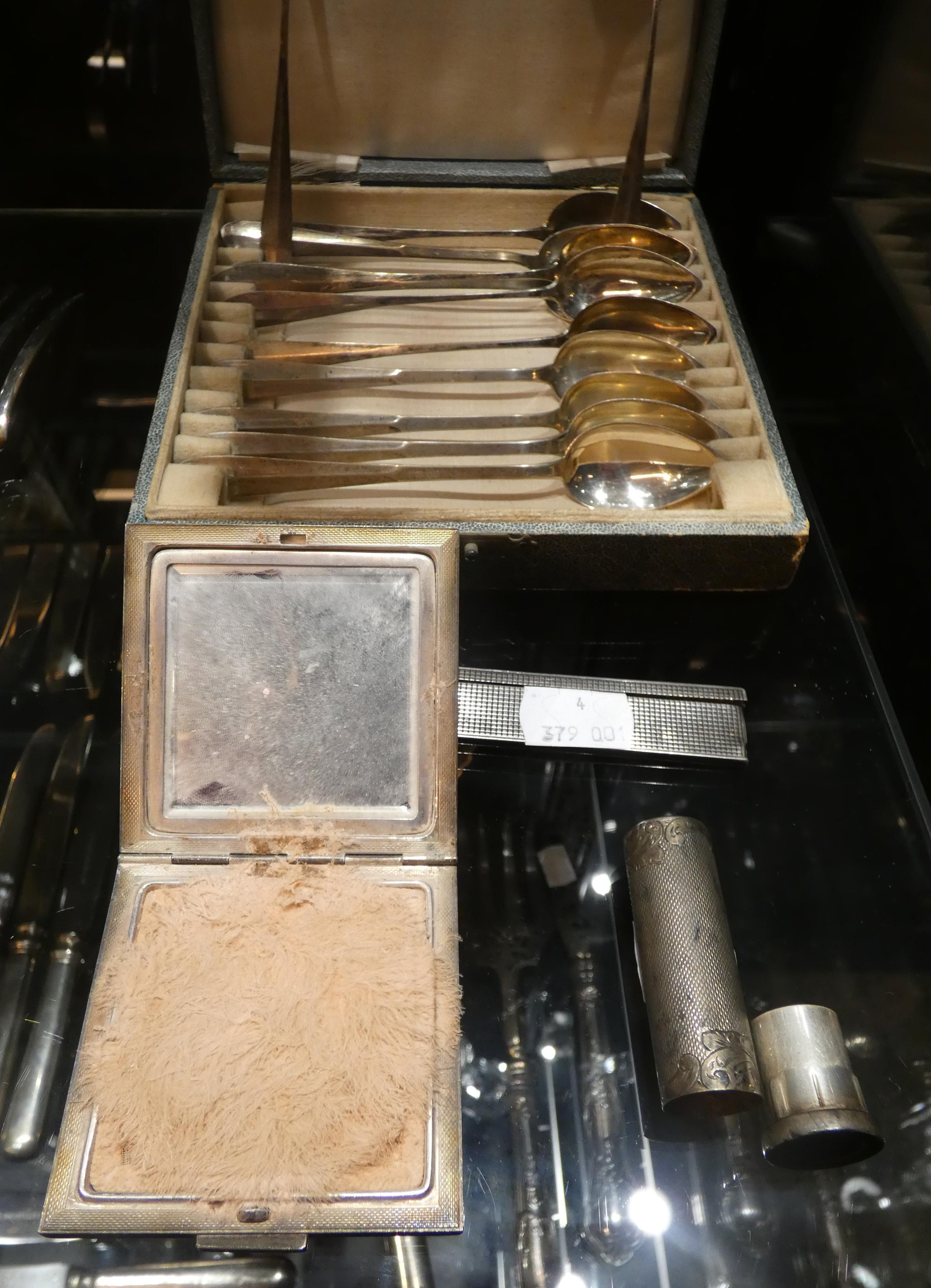Argenterie: lot en argent (4pcs) Pbrut:263g: 12 cuillères en 105g + peigne et son étui 24g + étui à rouge à lèvres 14g + poudrier 115g