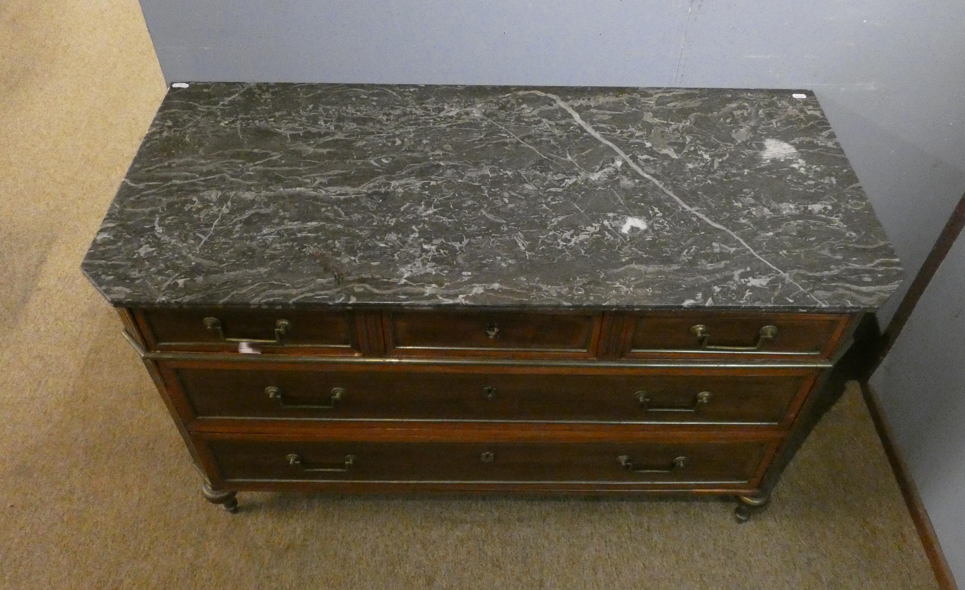 Meuble : Commode Louis XVI 5 tiroirs (mq 1 quincaillerie) appliques dessus marbre St Anne fin 18eS début 19eS