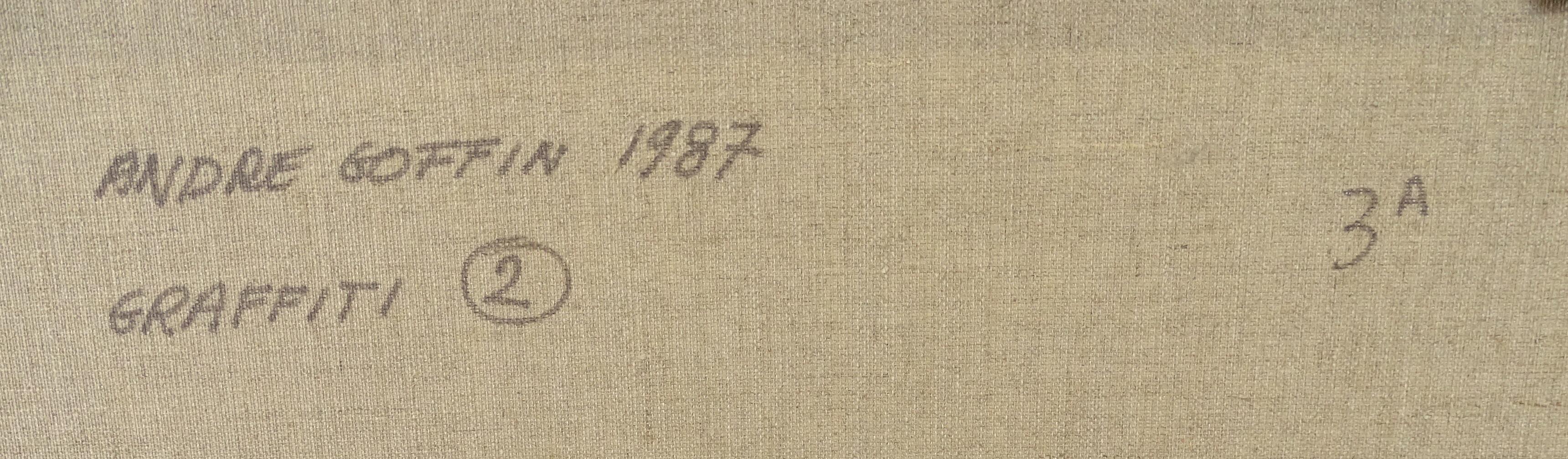 Tableau: Acrylique/toile (taches, usure bords) -Graffiti 2 3a- daté 1987 signé au dos *GOFFIN A.* (André) (1930, 2018) 90x60cm sans cadre