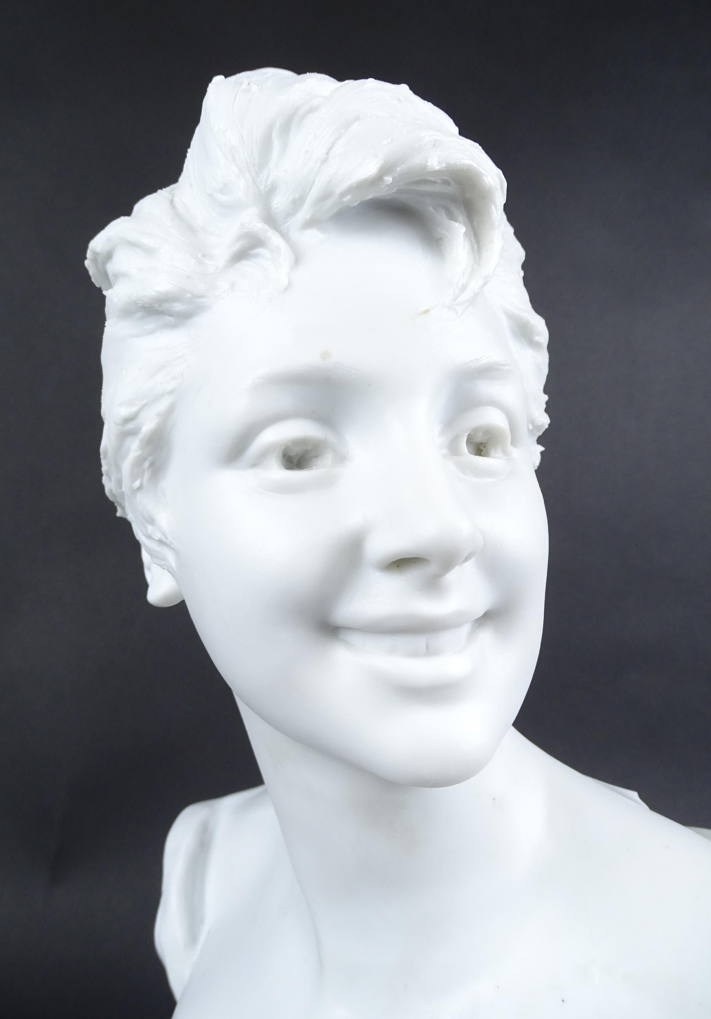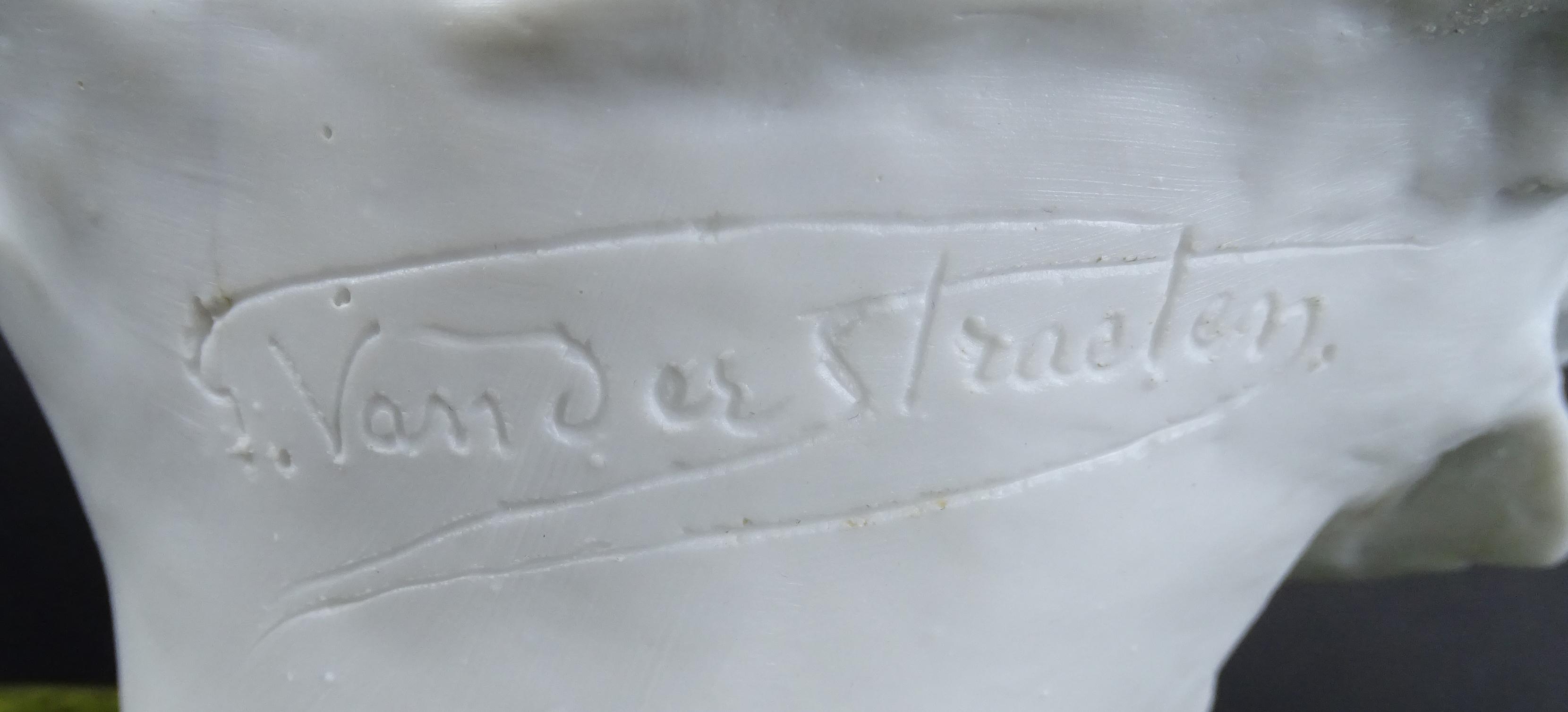 Sculpture: Buste en porcelaine / biscuit glaçuré -La femme au sourire- signé *VAN DER STRAETEN G.* (Georges) (1856, 1928) H:37cm sur socle