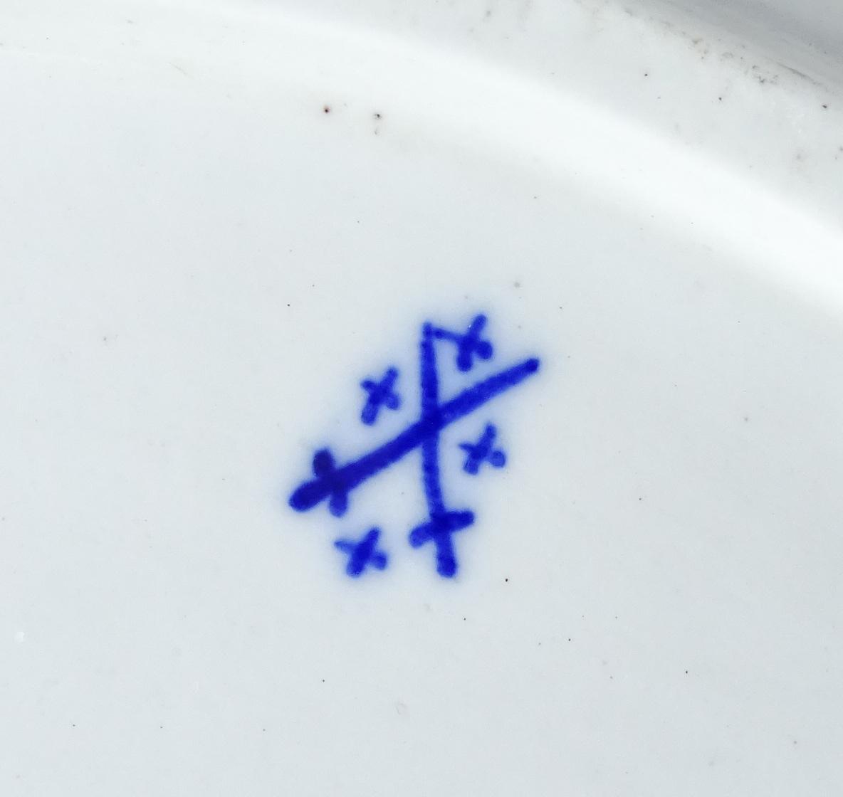 Céramique : Plat en porcelaine de Tournai (pt défaut cuisson) à bord chantourné milles côtes décor Ronda cachet épées croisées et croisettes