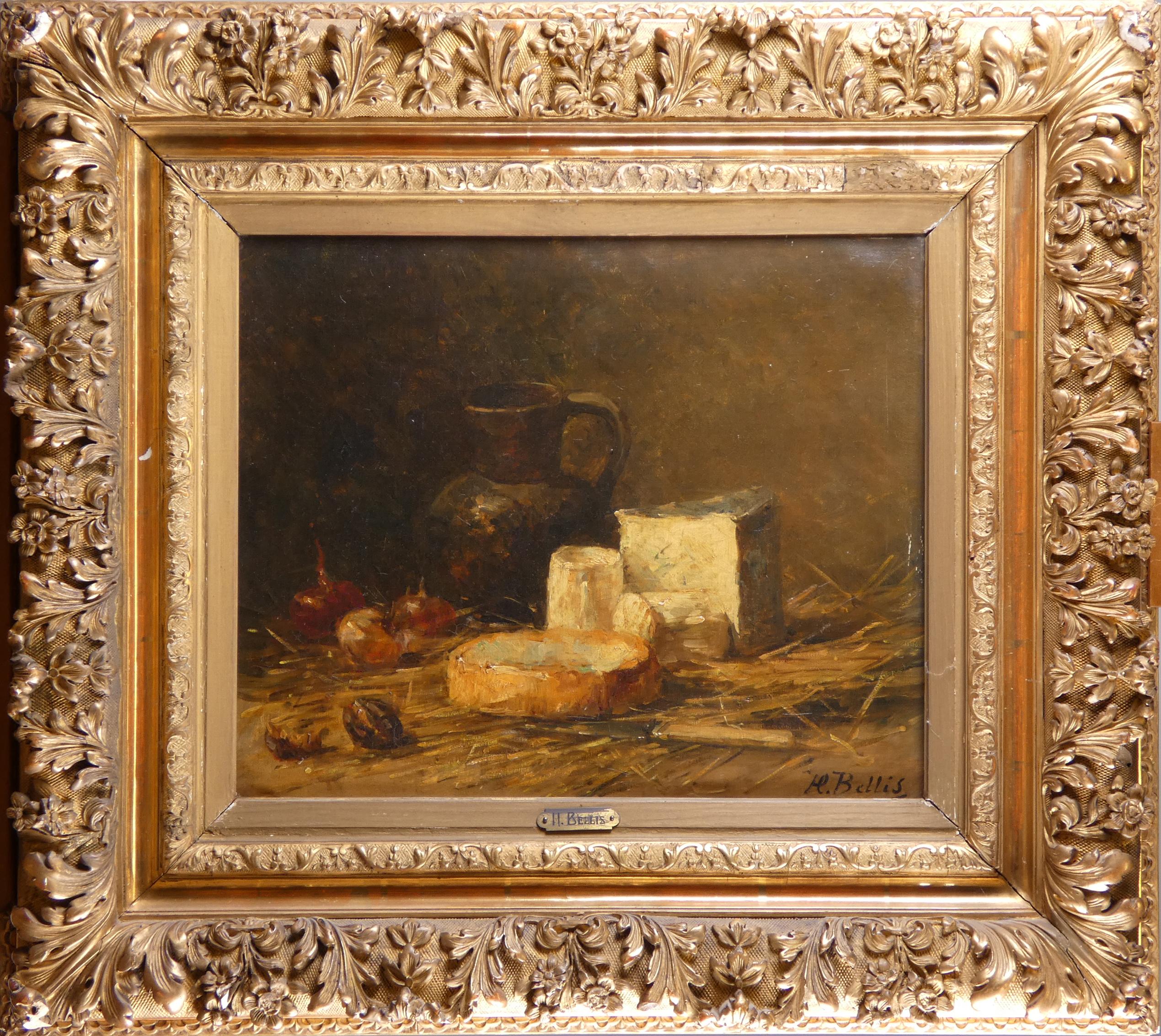 Tableau HST -Nature morte aux fromages- signé *BELLIS H.* (Hubert) (1831, 1902) 38x46,5cm cadre de style doré (lacune)
