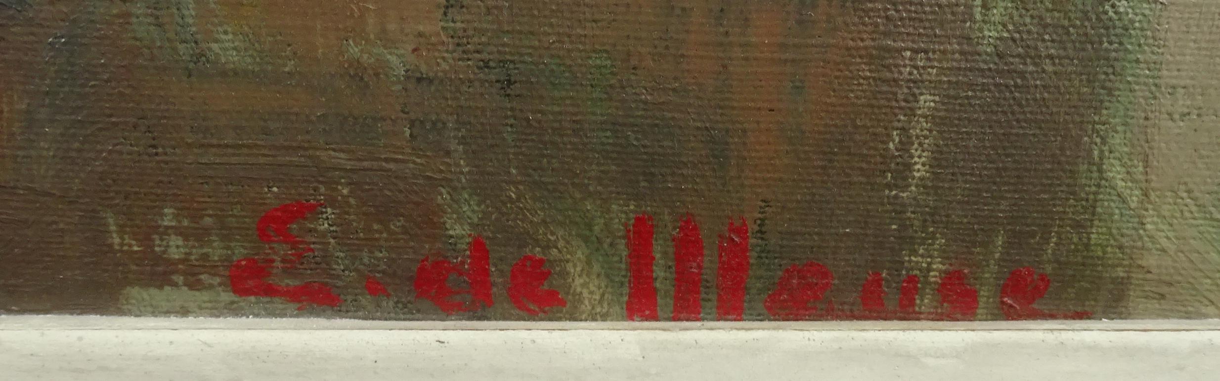 Tableau HST -Sur les Toits- signé *DE MEUSE E.* (Eliane) (1899, 1933) 53x47cm cadre blanc (lacunes)