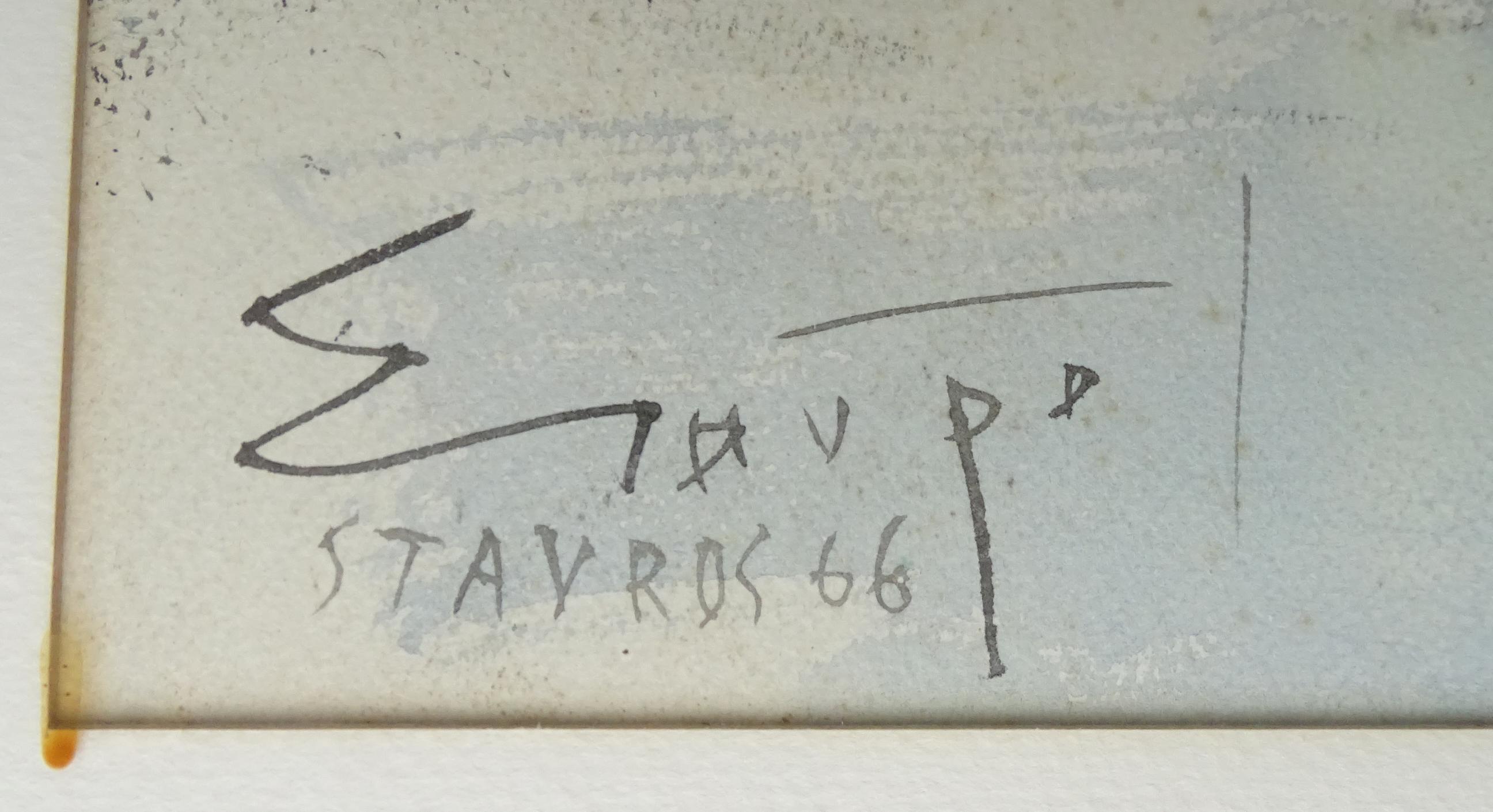 Tableau: dessin aquarelle (taches) -Paysage- daté 66 signé *PAPASSAVAS S.* (Stavros) (1928, ?) 50,5x63,5cm cadre noir sous plexi