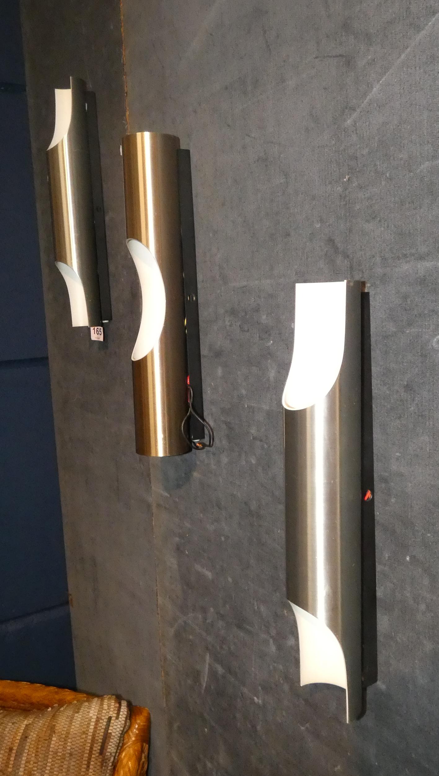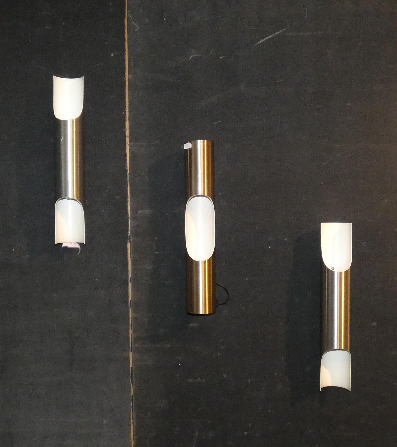 Luminaire: 3 Appliques, forme tuyau -Fugue- (1 cuivrée + 2 alu) éditée par Raak Circa 1970 Diam: 7cm H: 40cm (3pces)