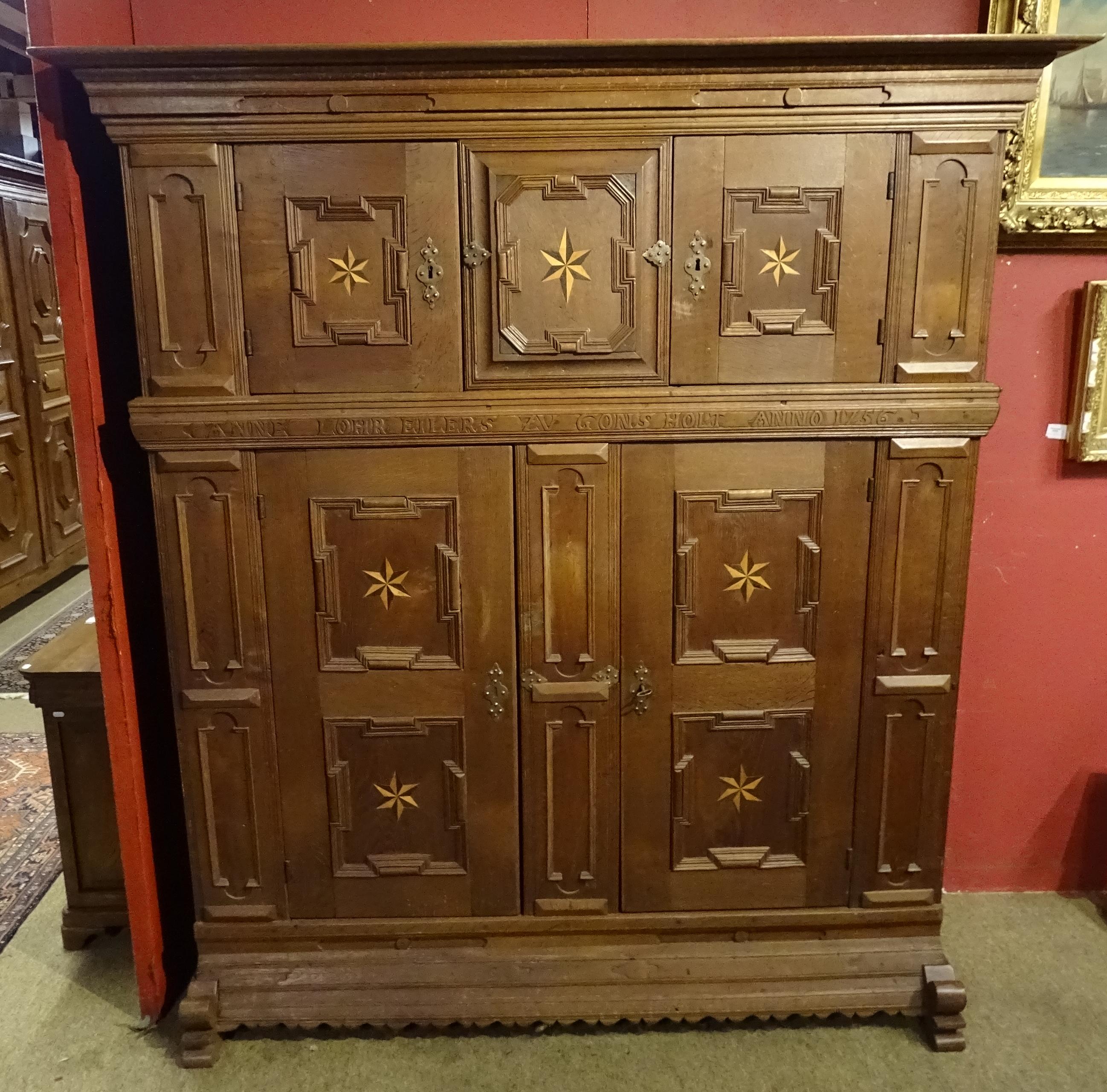 Meuble allemand Renaissance 4 Portes en chene et incrustations d'étoiles marqué Anne Lohr Eilers ZV oons Holt anno 1756 192x168x62cm
