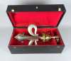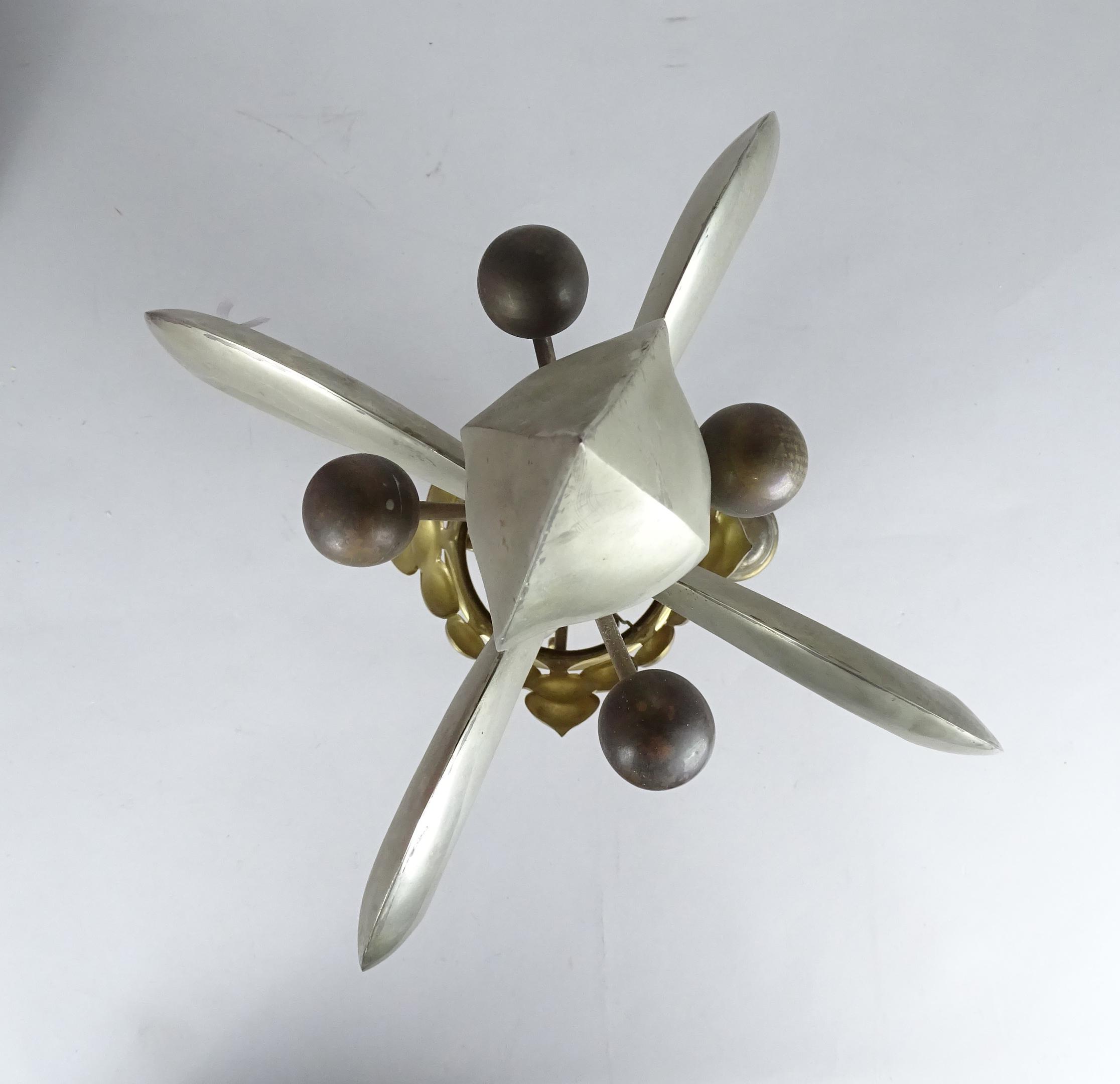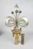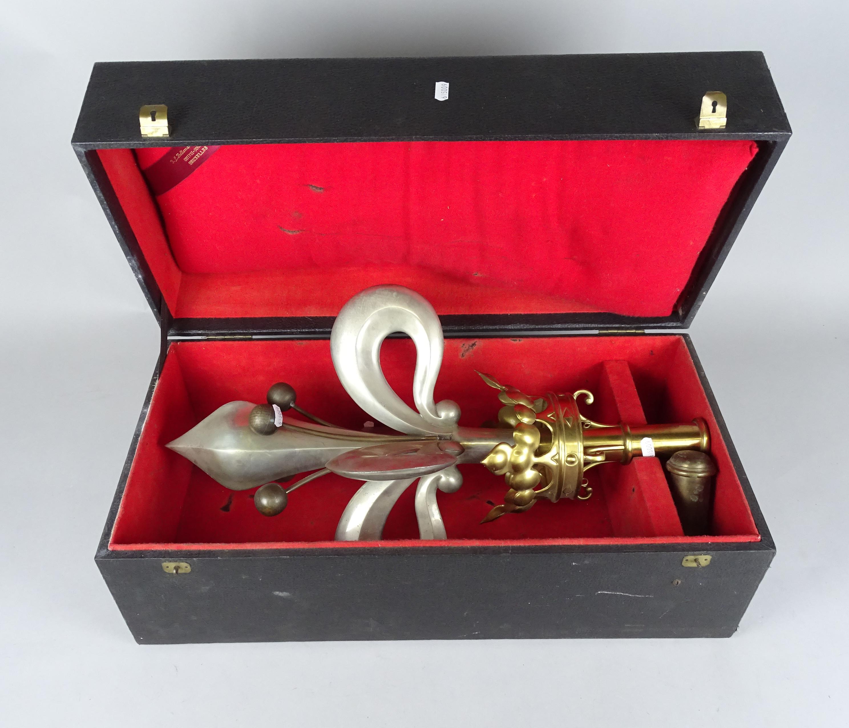 Objet: Grand pique de drapeau en métal doré et argenté (traces d'usage) à décor d'une couronne et d'une fleur de Lys H:60cm dans son écrin