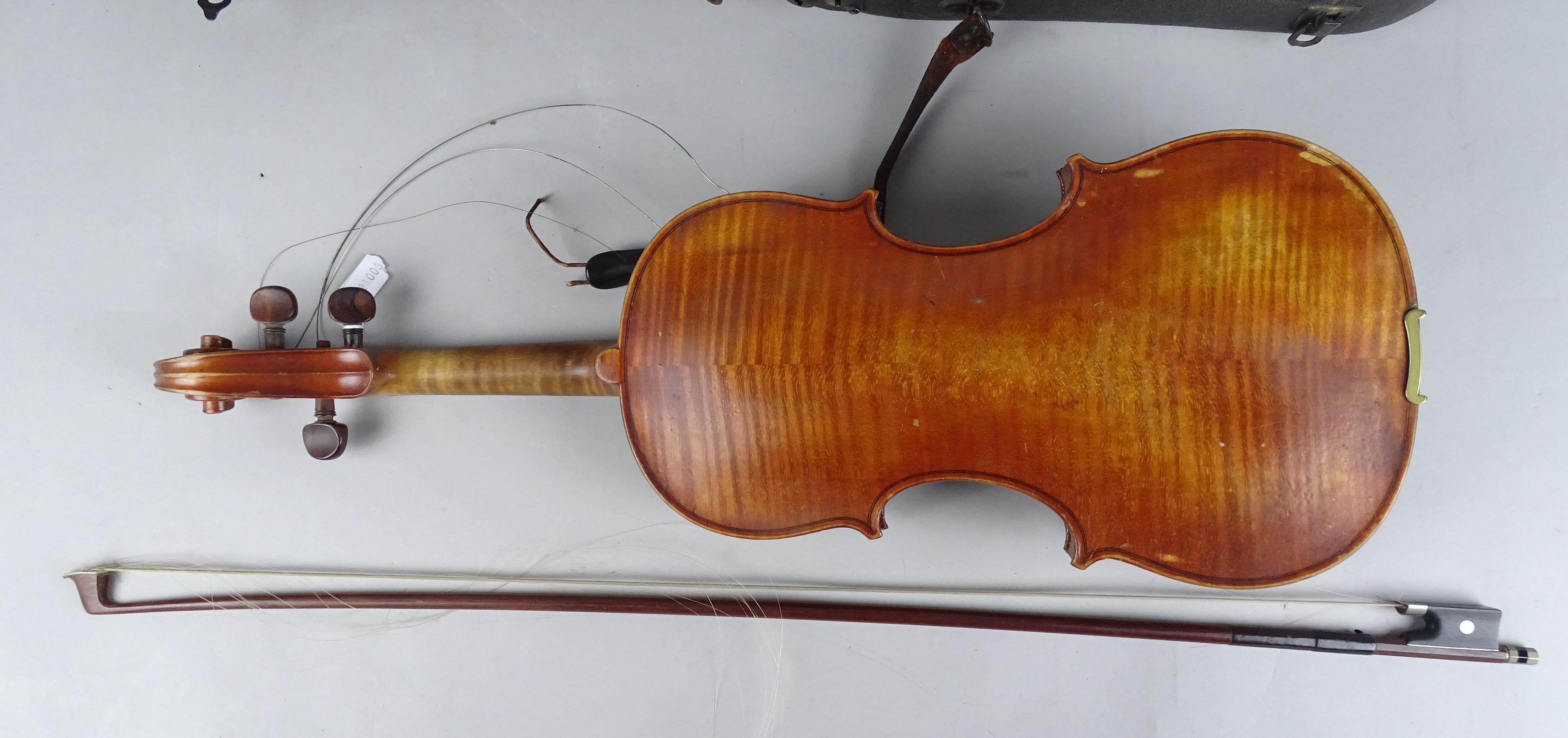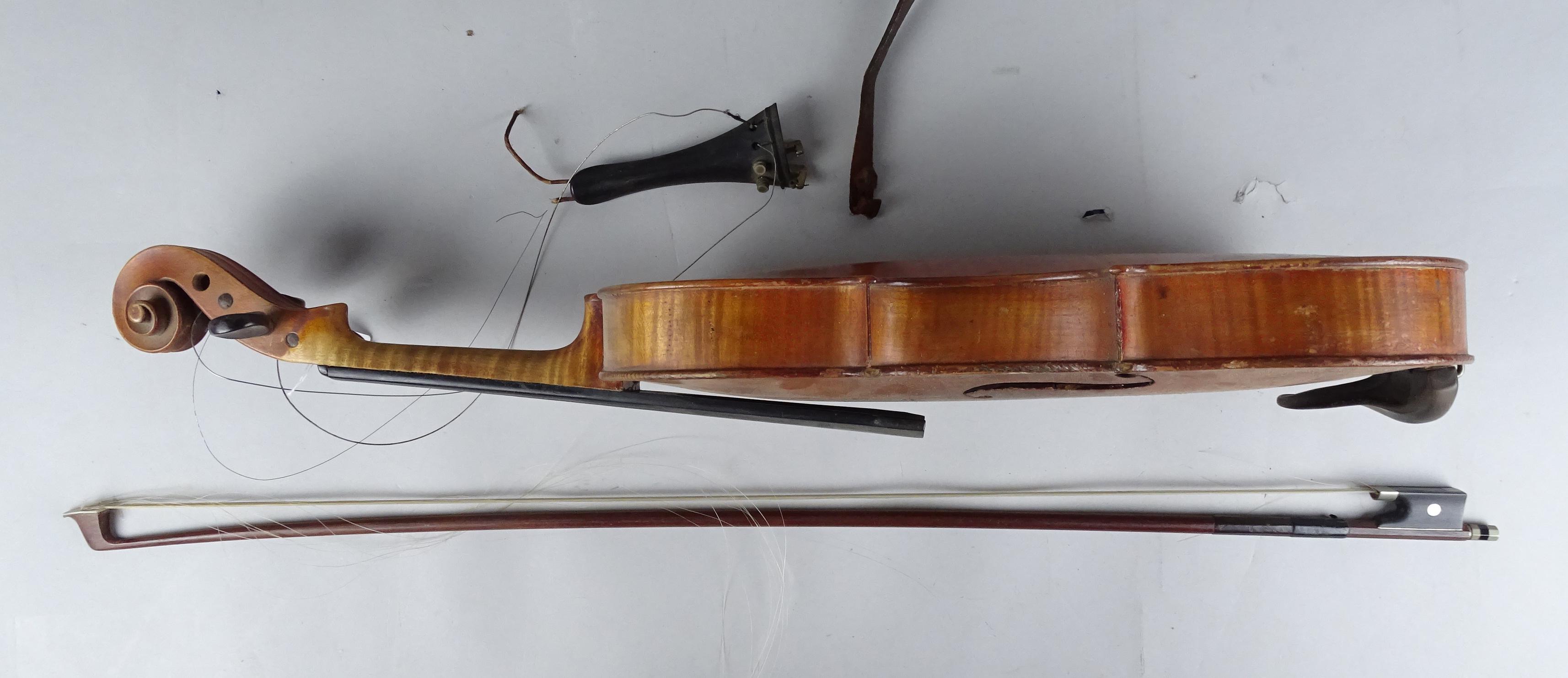 Musique: Violon ancien entier (usure, mq) dos en 2 parties étiquette apocryphe -Joseph GUARNARIUS- avec archet (acc) + étui
