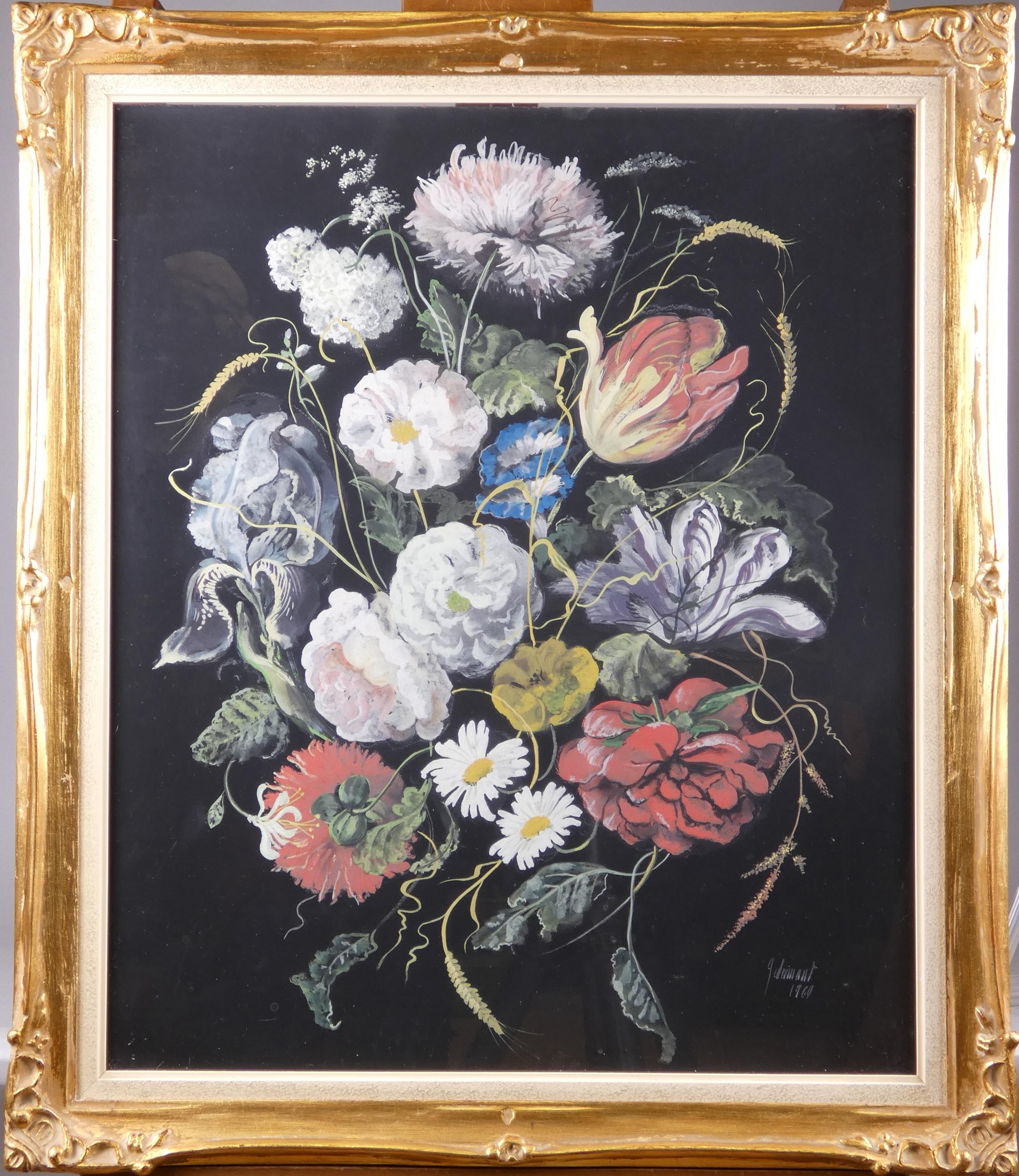 Tableau Gouache -Fleurs- daté 1960 signé *DUMONT G.* (Gilberte) (1911, 1989) 60x45cm cadre doré de style sous verre