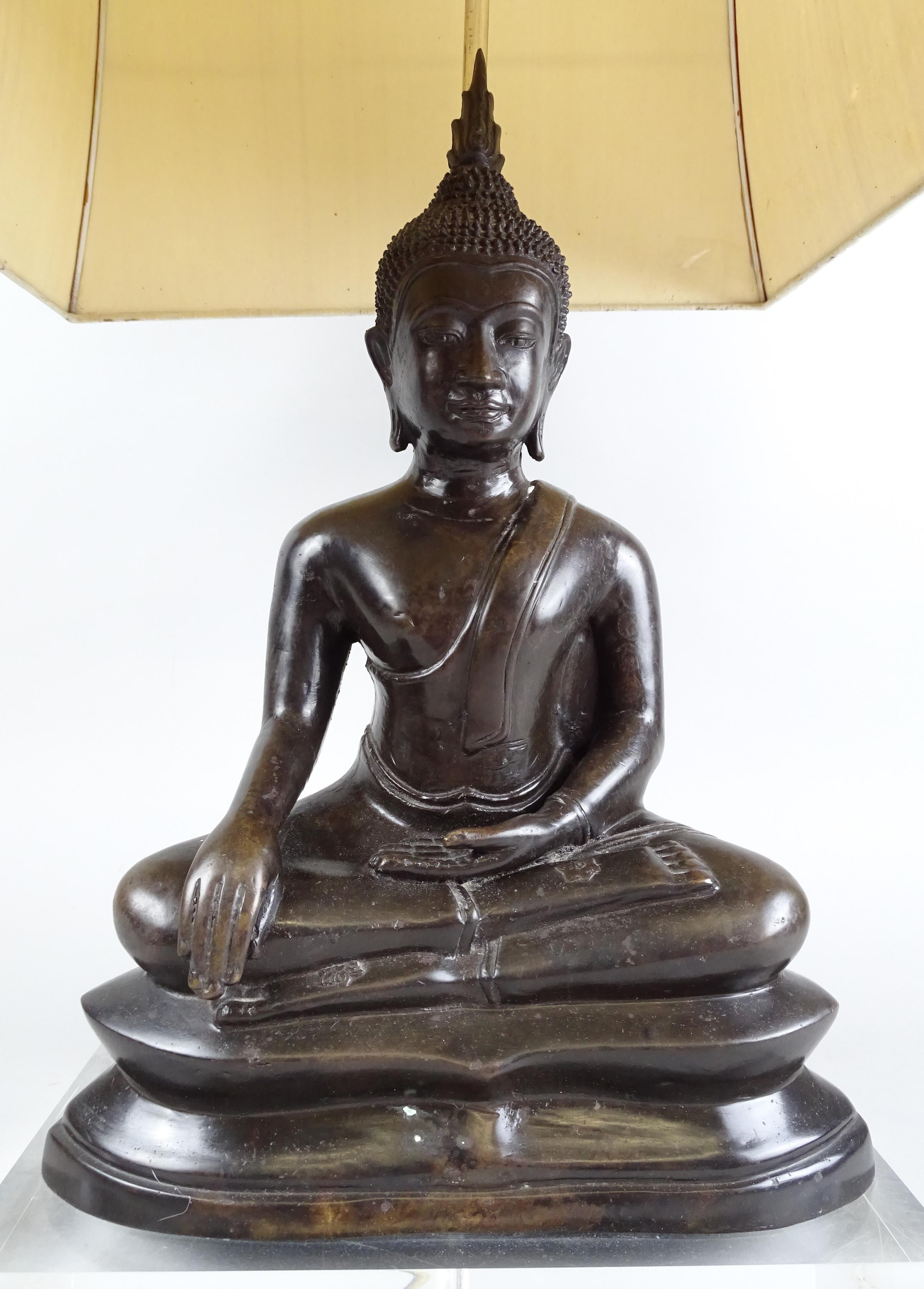 Luminaire : Bouddha assis en bronze monté en lampe sur socle en plexiglas