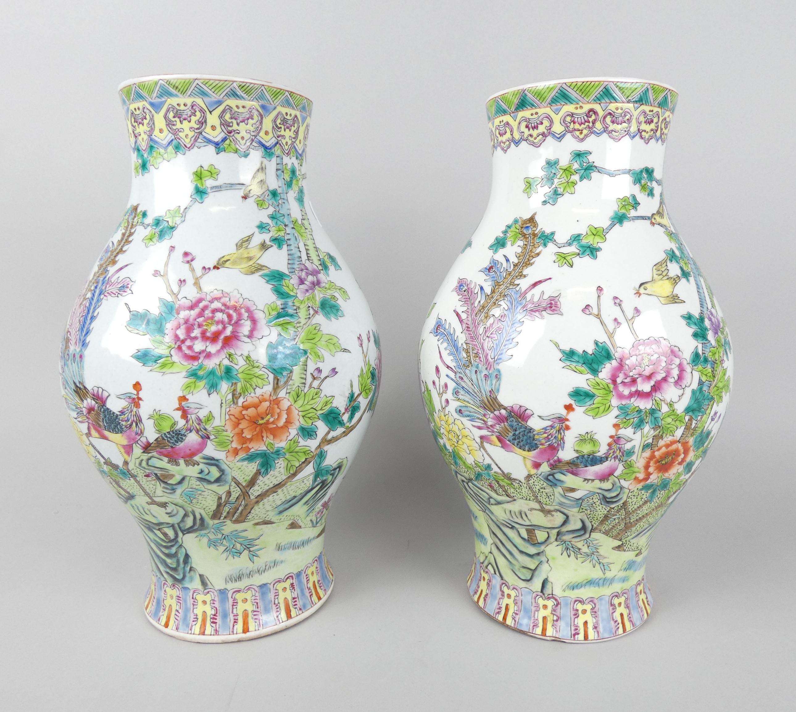 Asiatique: Paire de vases en porcelaine chinoise décor de fleurs et d'oiseaux marque apocryphe Da Qing Tongzhi Nian Zhi 3e quart XXe Siècle H:31cm
