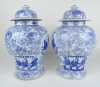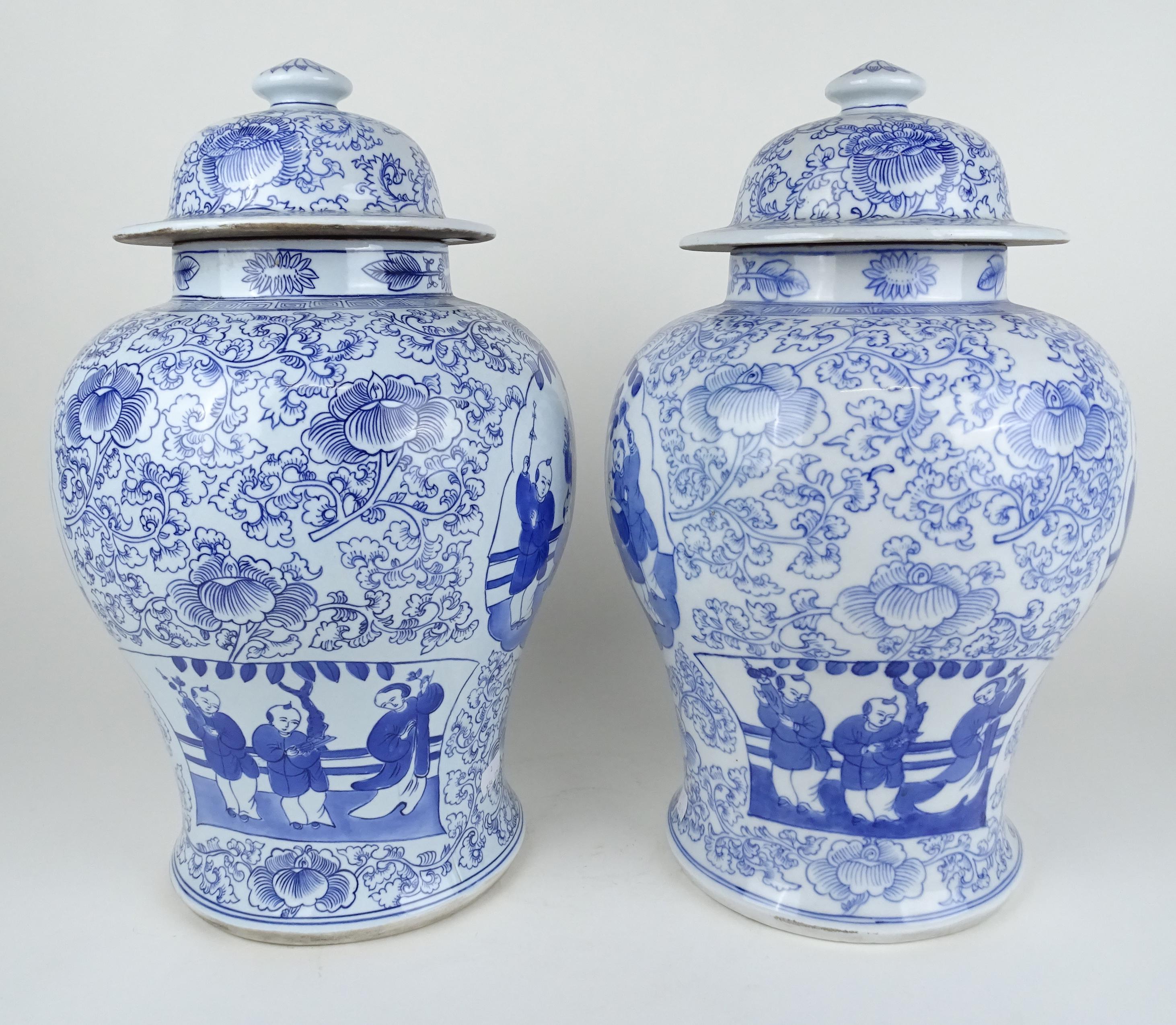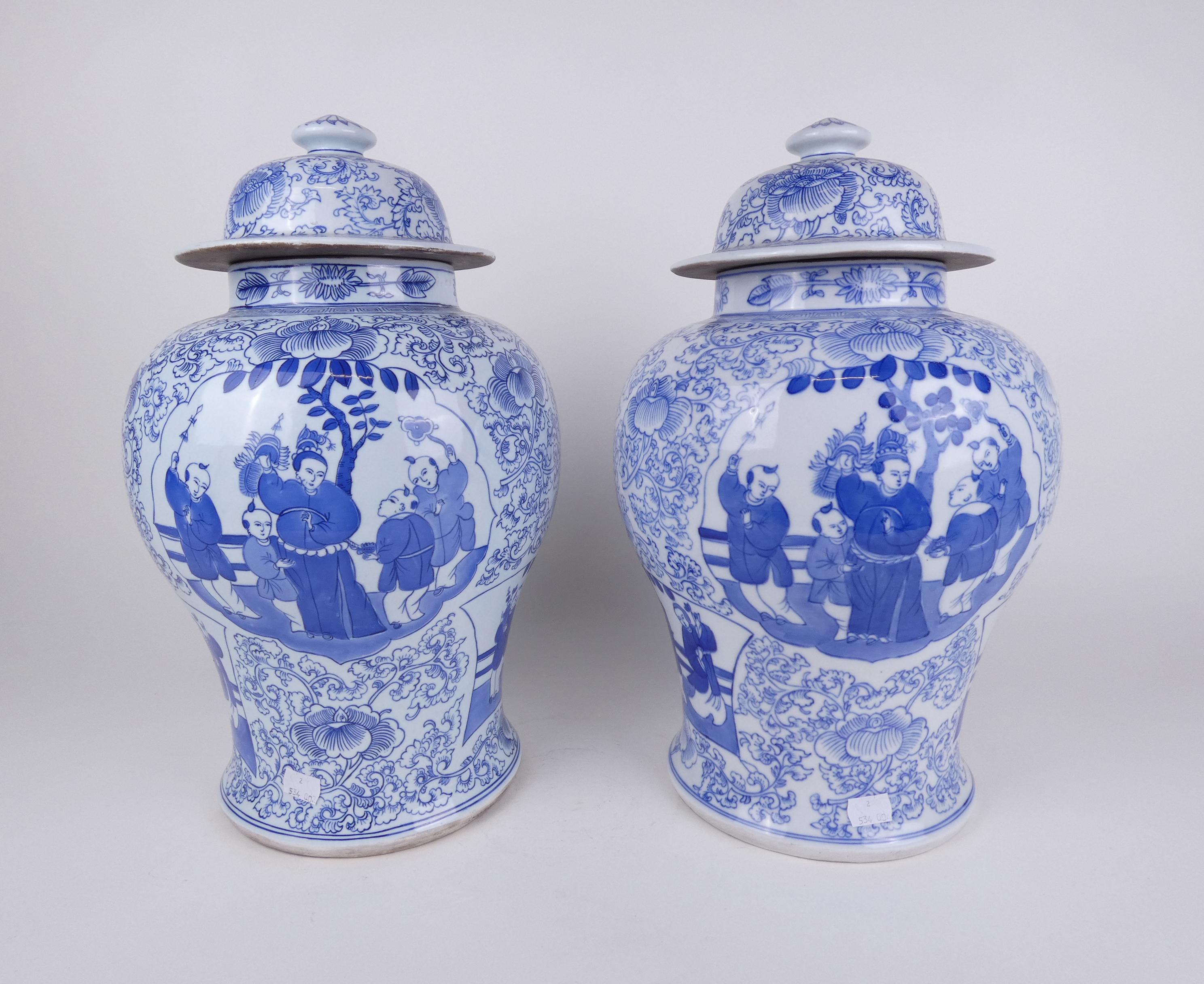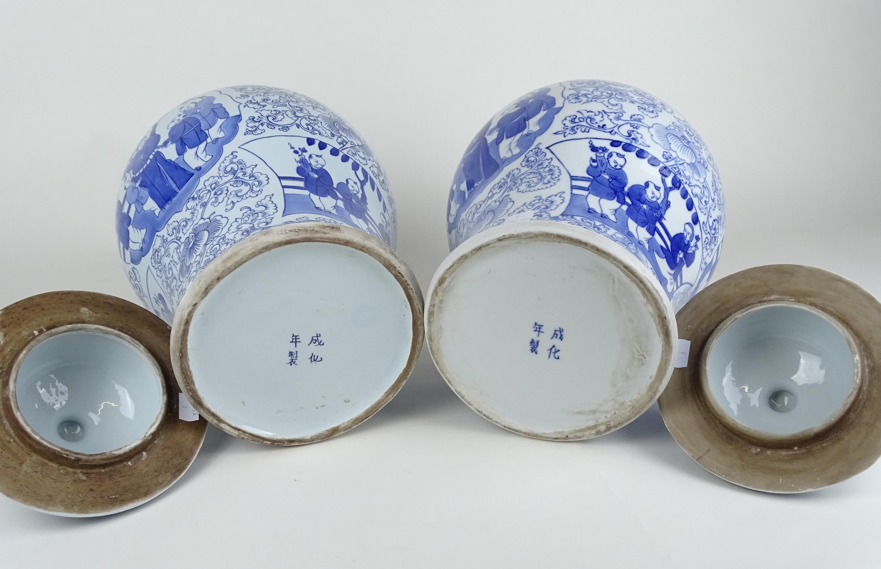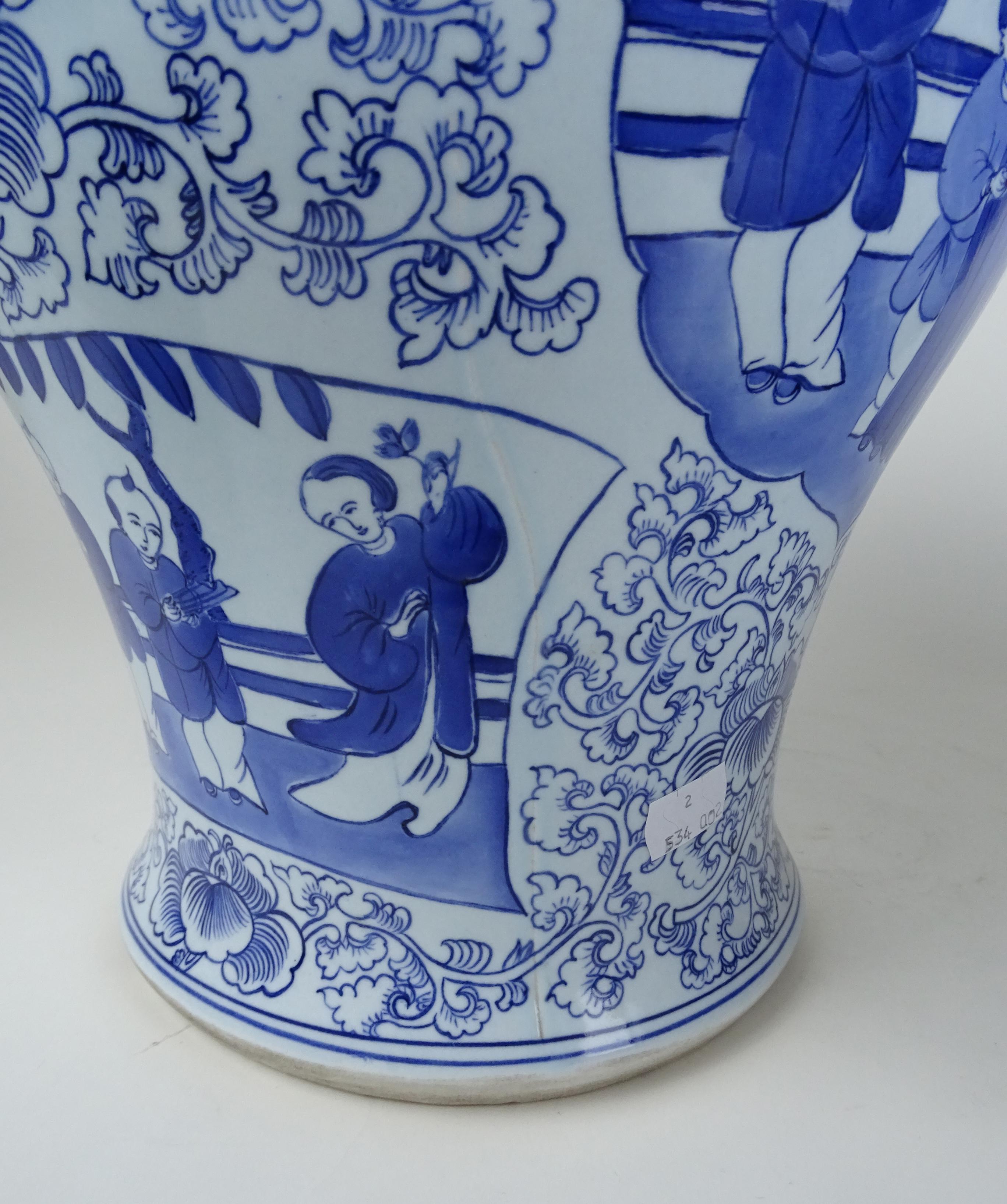 Asiatique: 2 potiches (dont 1 ancienne) couvertes en porcelaine Chinoise camaïeu bleu réserves de personnages marque apocryphe Chenghua nianzhi H:44,5cm