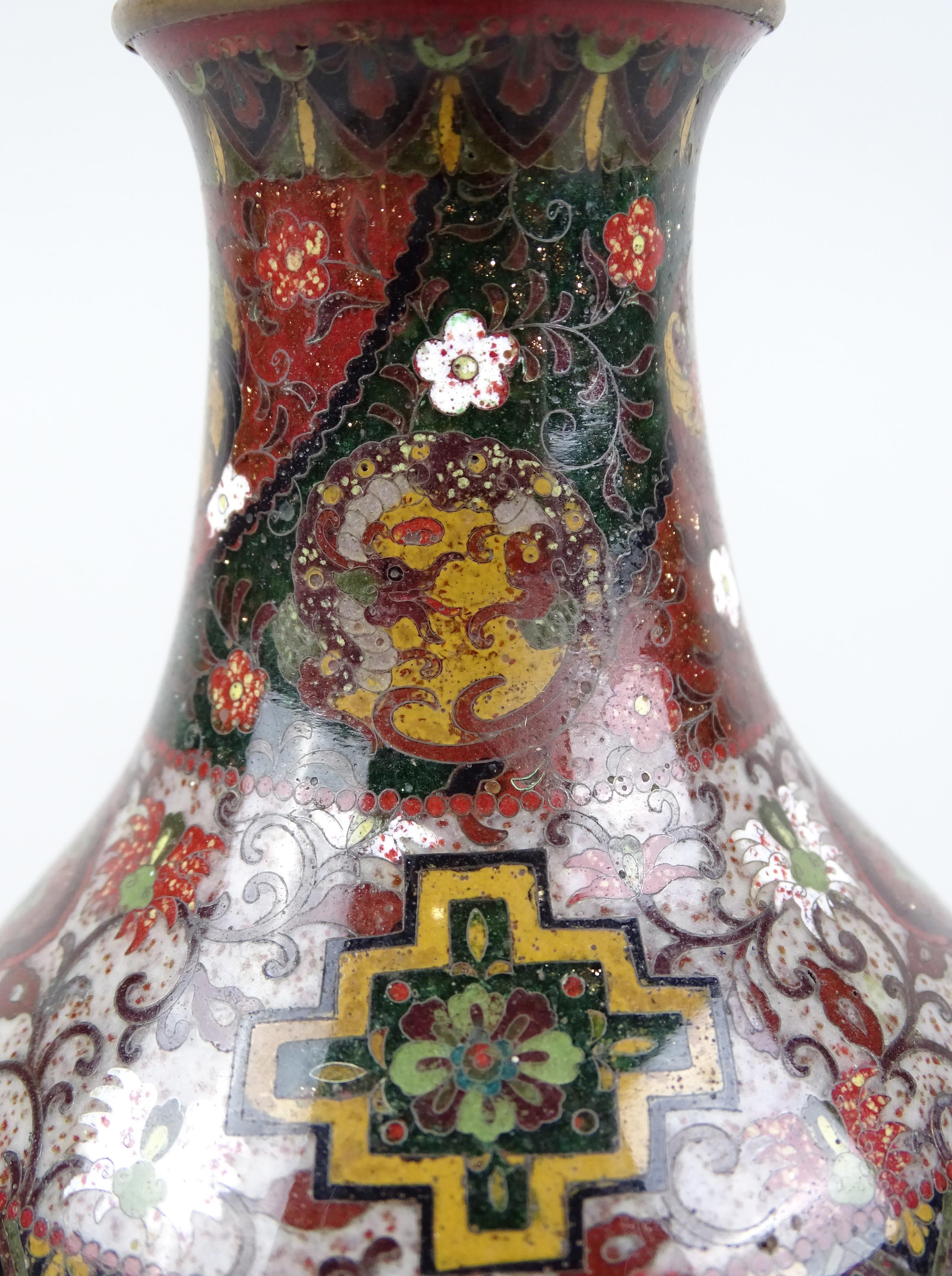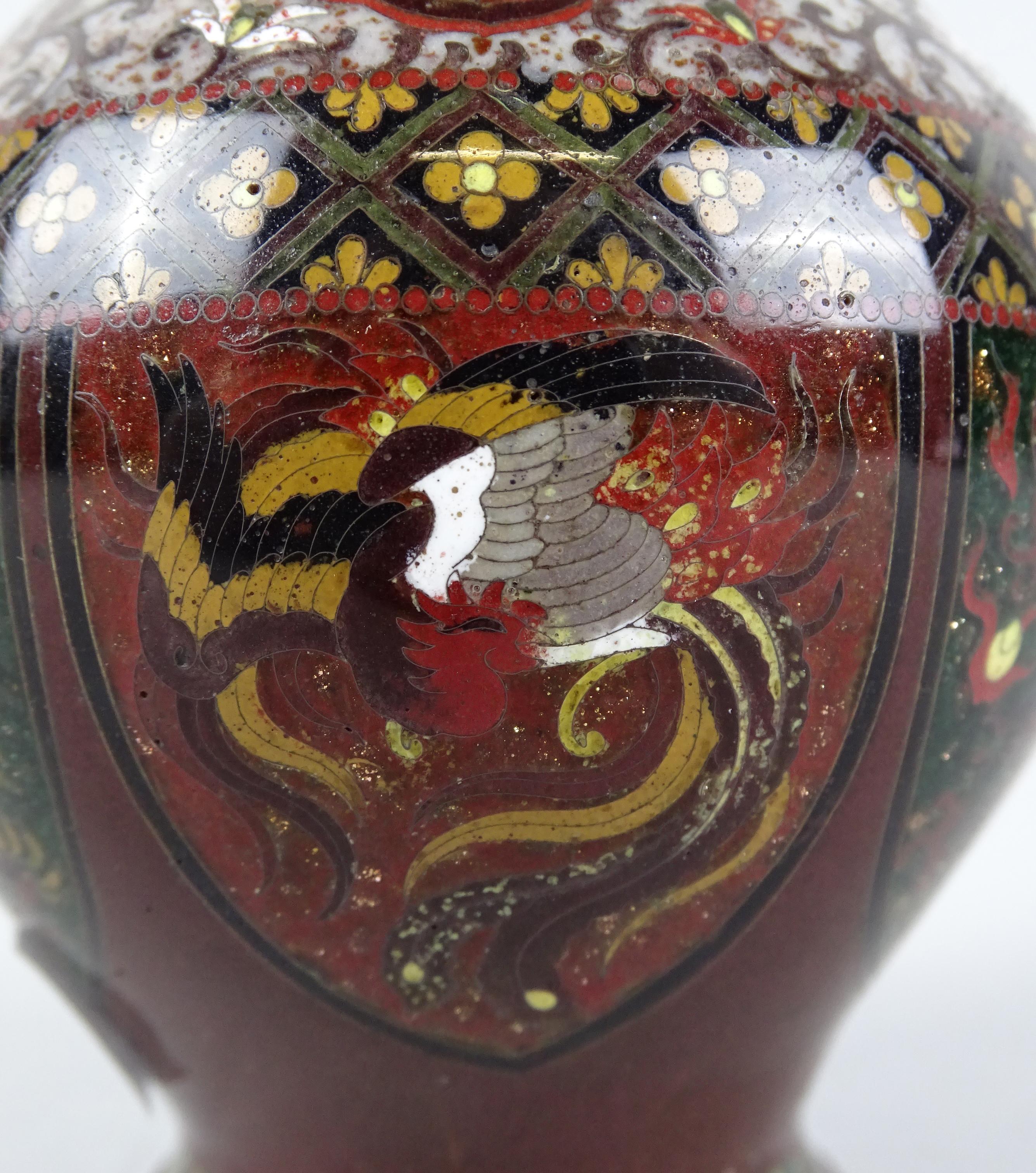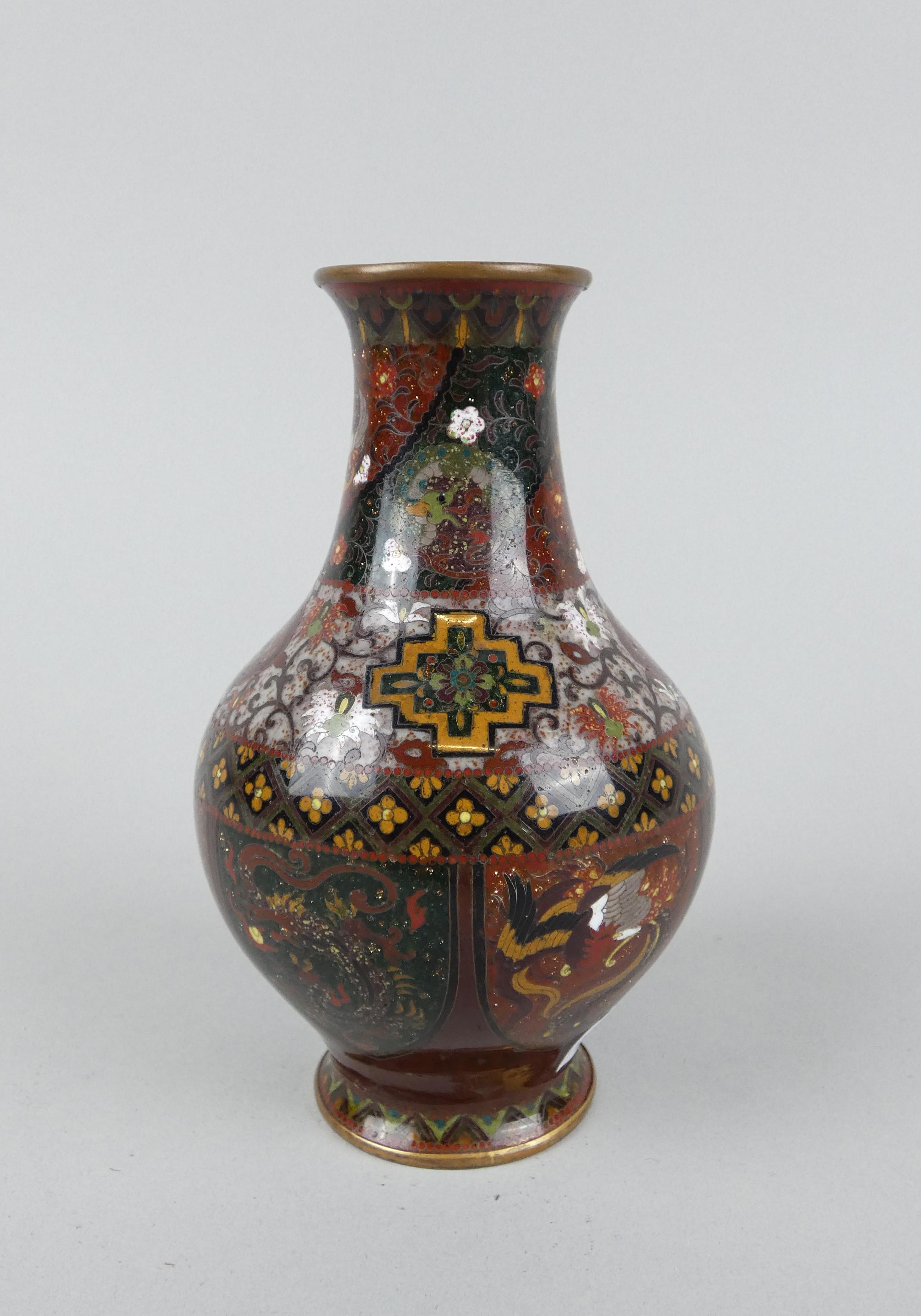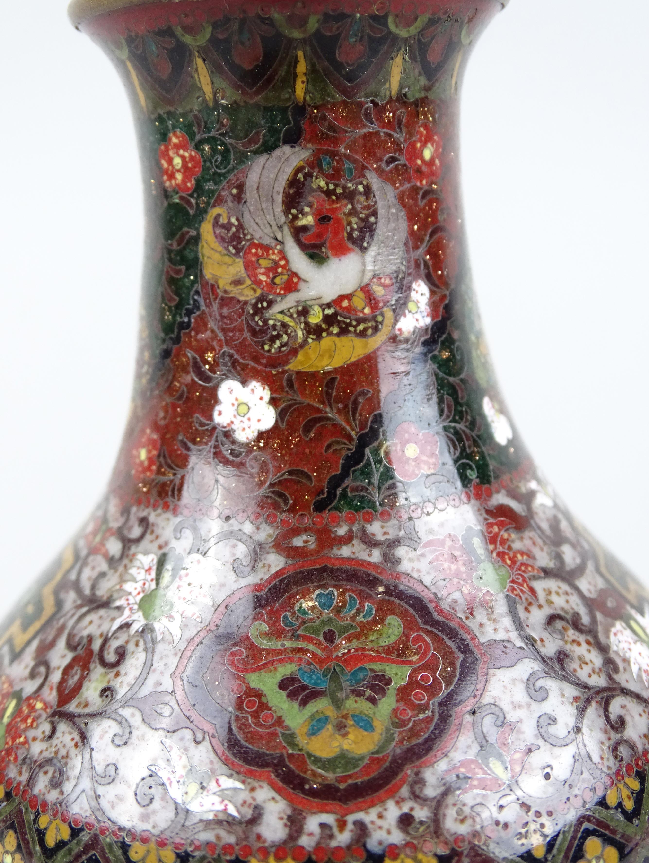 Asiatique : Vase en cuivre en émaux cloisonnés à décor de dragons et coqs