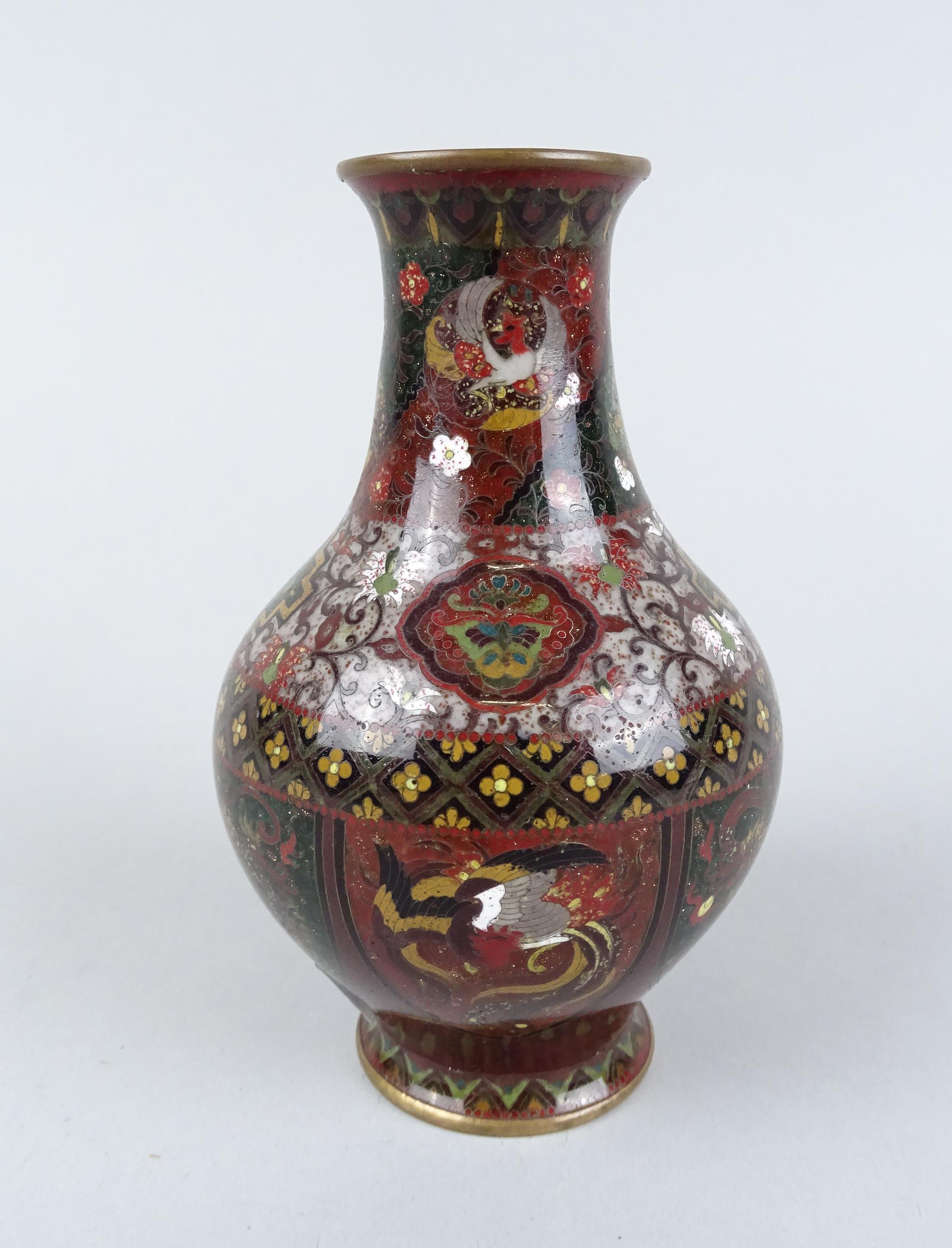 Asiatique: Vase en cuivre en émaux cloisonnés à décor de dragons et coqs 12,5cm
