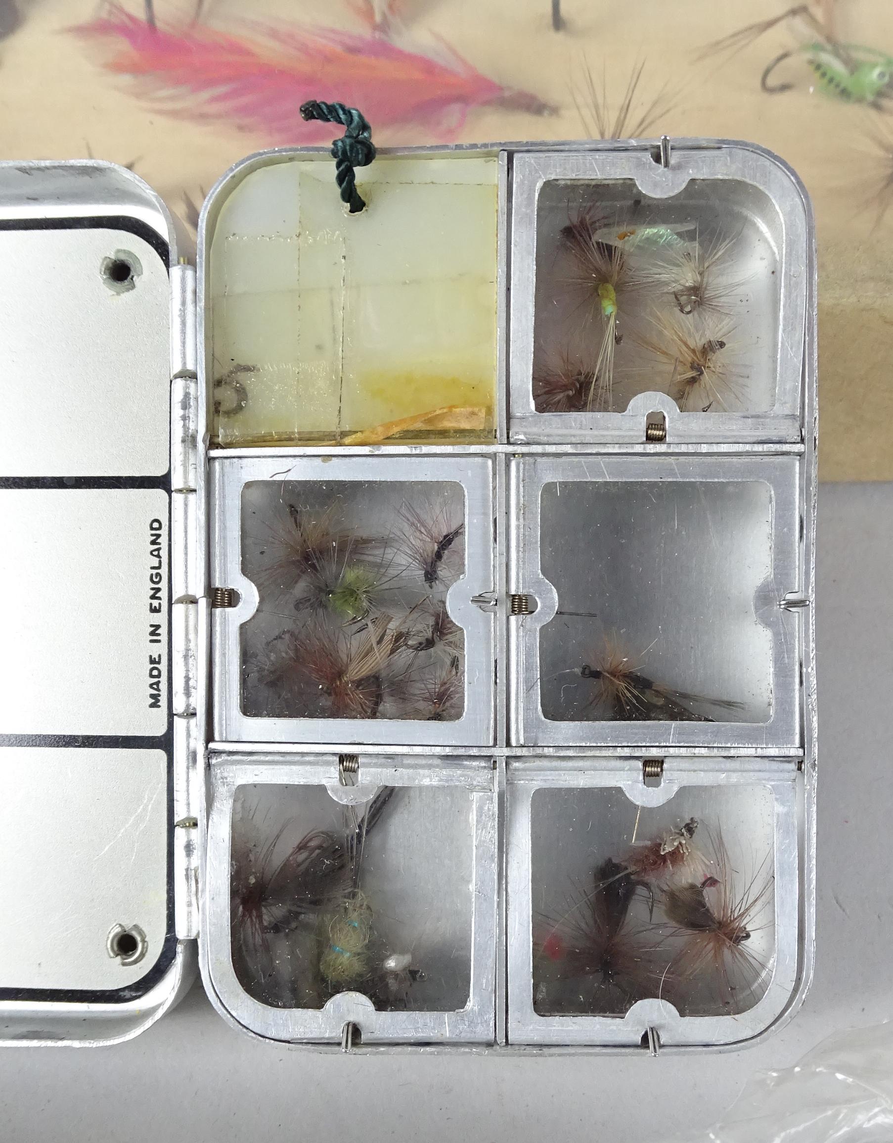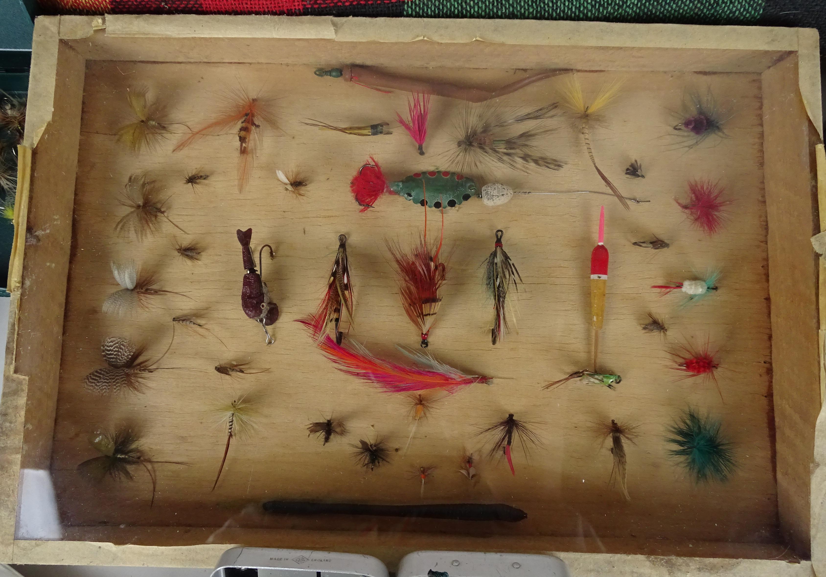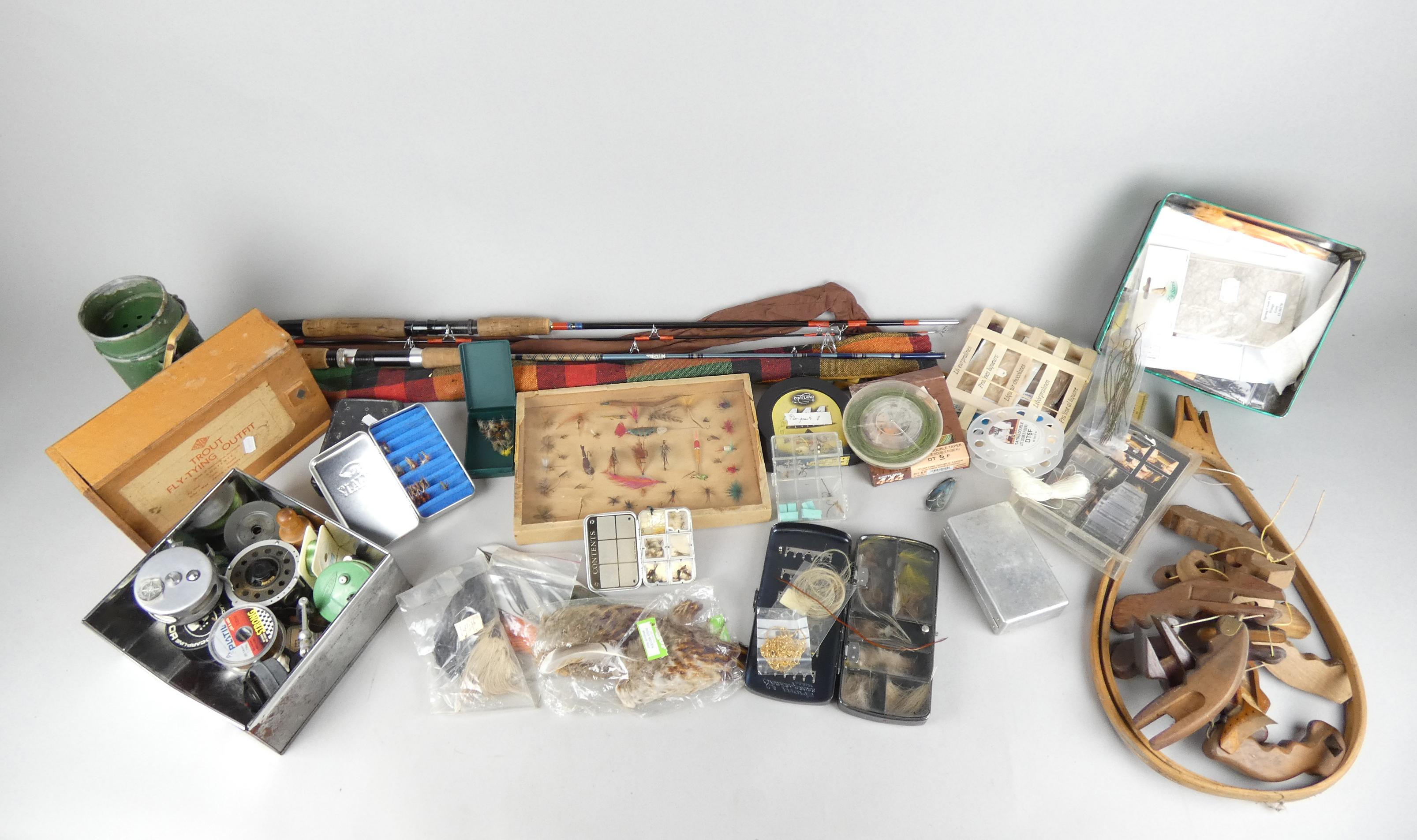 Objets : matériel ancien de pêche à la mouche dont : mouches , plumes , 2 cannes , moulinets , boites...