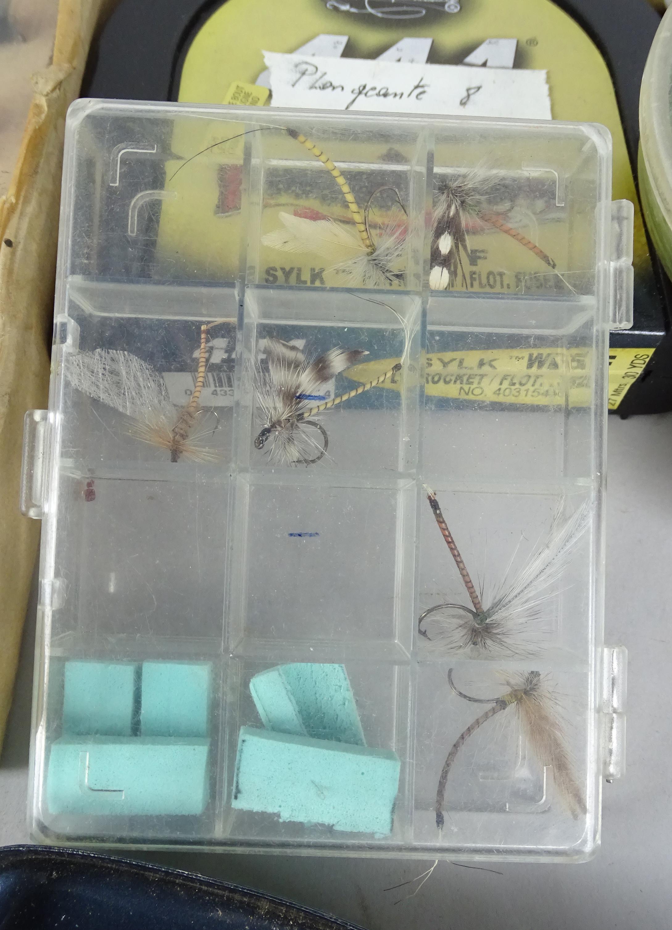 Objets: matériel ancien de pêche à la mouche dont: mouches, plumes, 2 cannes, moulinets, boites...