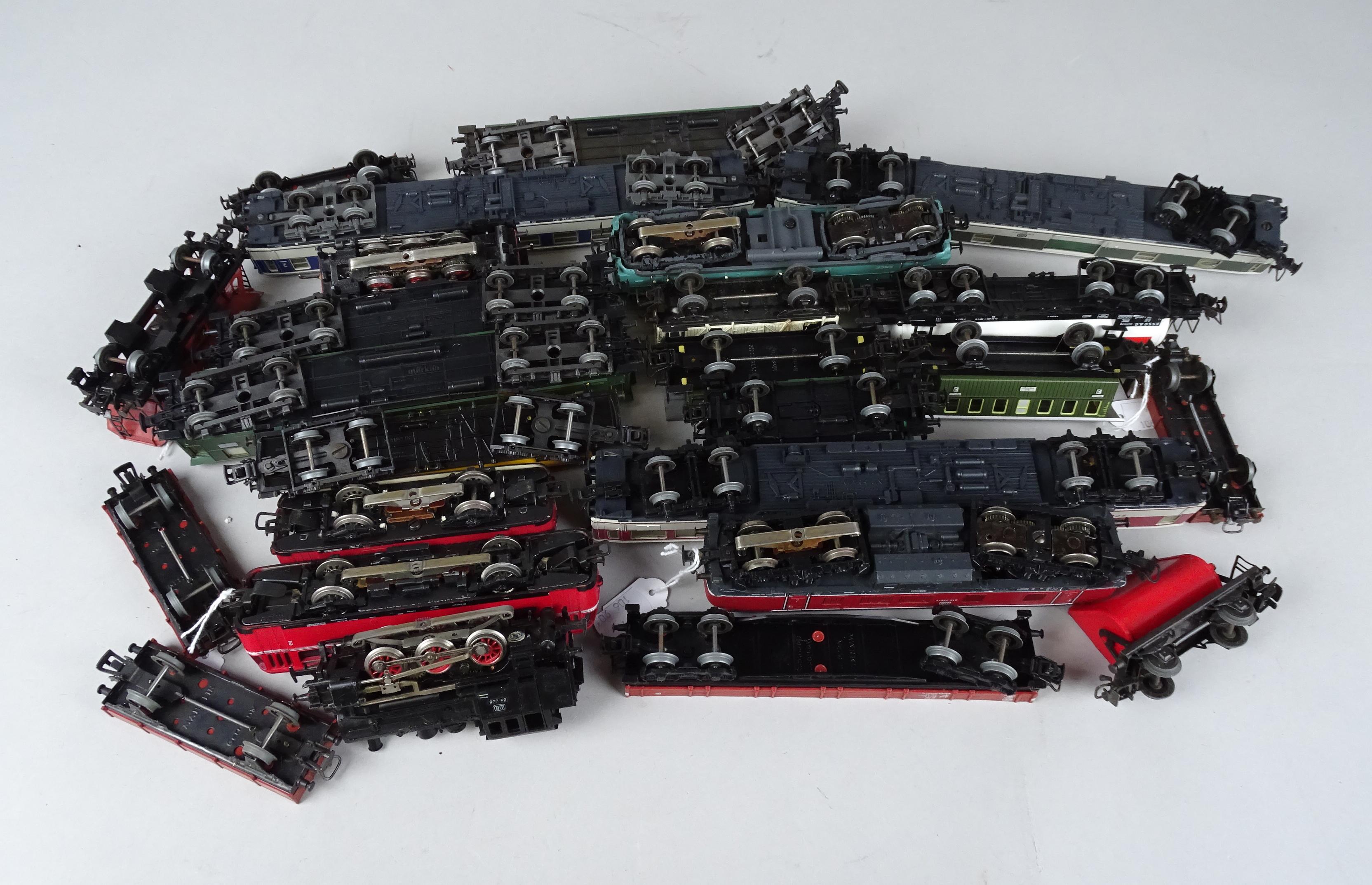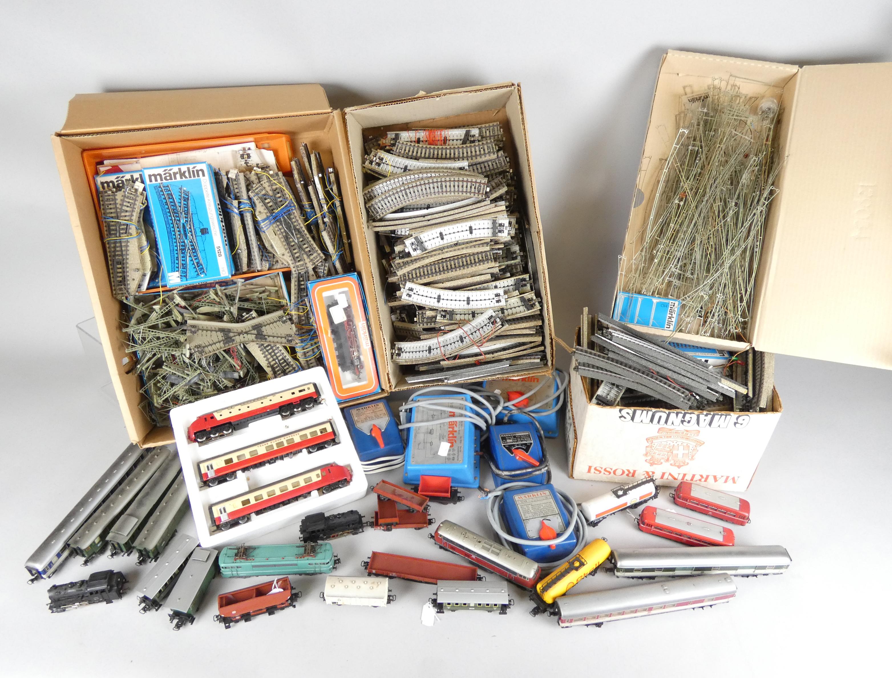 Jouet: Trains H0 MARKLIN (traces d'usages)): locomotive diesel Trans Europ Express + 6 locomotives + 19 wagons + transfos + rails + aiguillages + divers