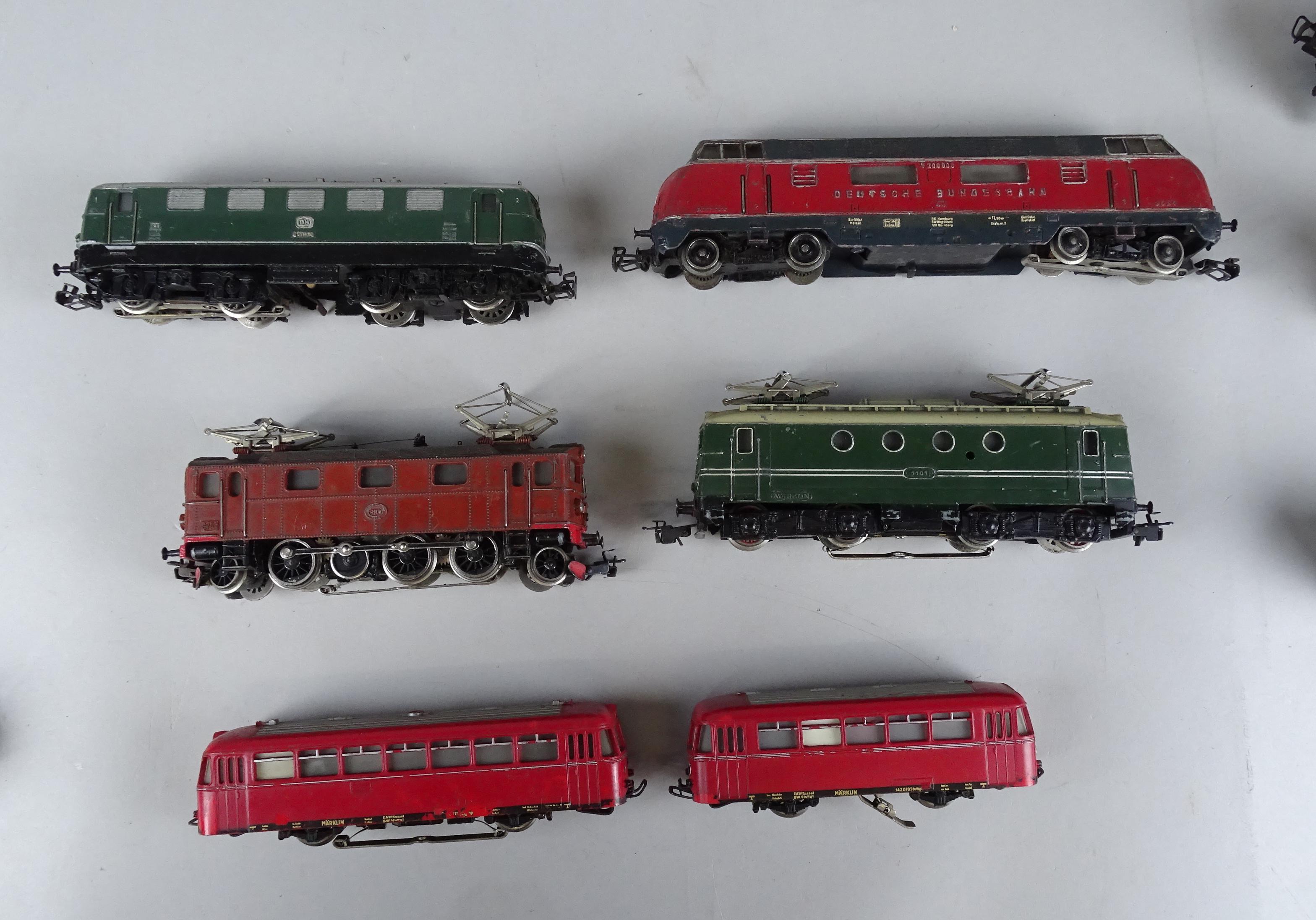 Jouet : Train MARKLIN H0 (traces d'usages) : locomotive (5) dont micheline avec wagon , motrice électrique(2) + voitures passagers (6) + wagons(12)