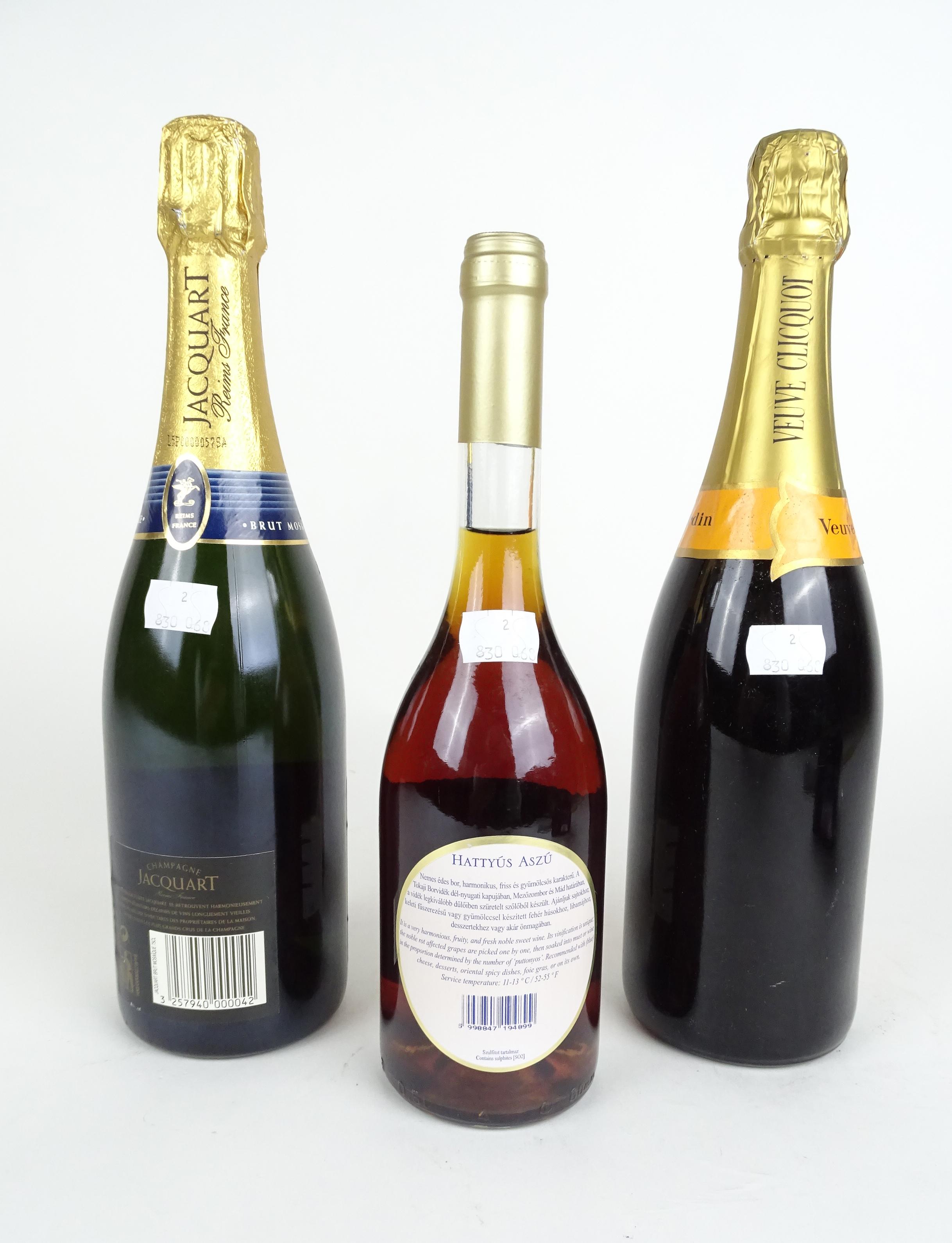 Vin: (3pcs) Champagne Veuve Clicquot Ponsardin + Vin blanc Tokaji Aszu 4 puttonyos 2001 50cl + Champagne Jacquart