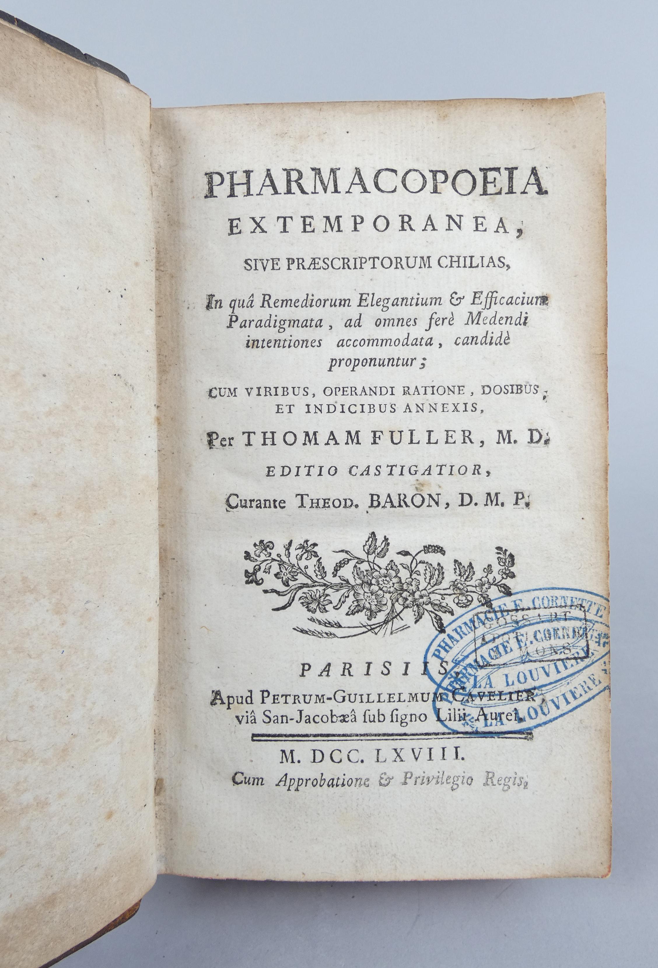 Livre: PHARMACOPOEIA (usure ext) par Thomas FULLER, in-12, veau brun dos à nerfs orné de 1768