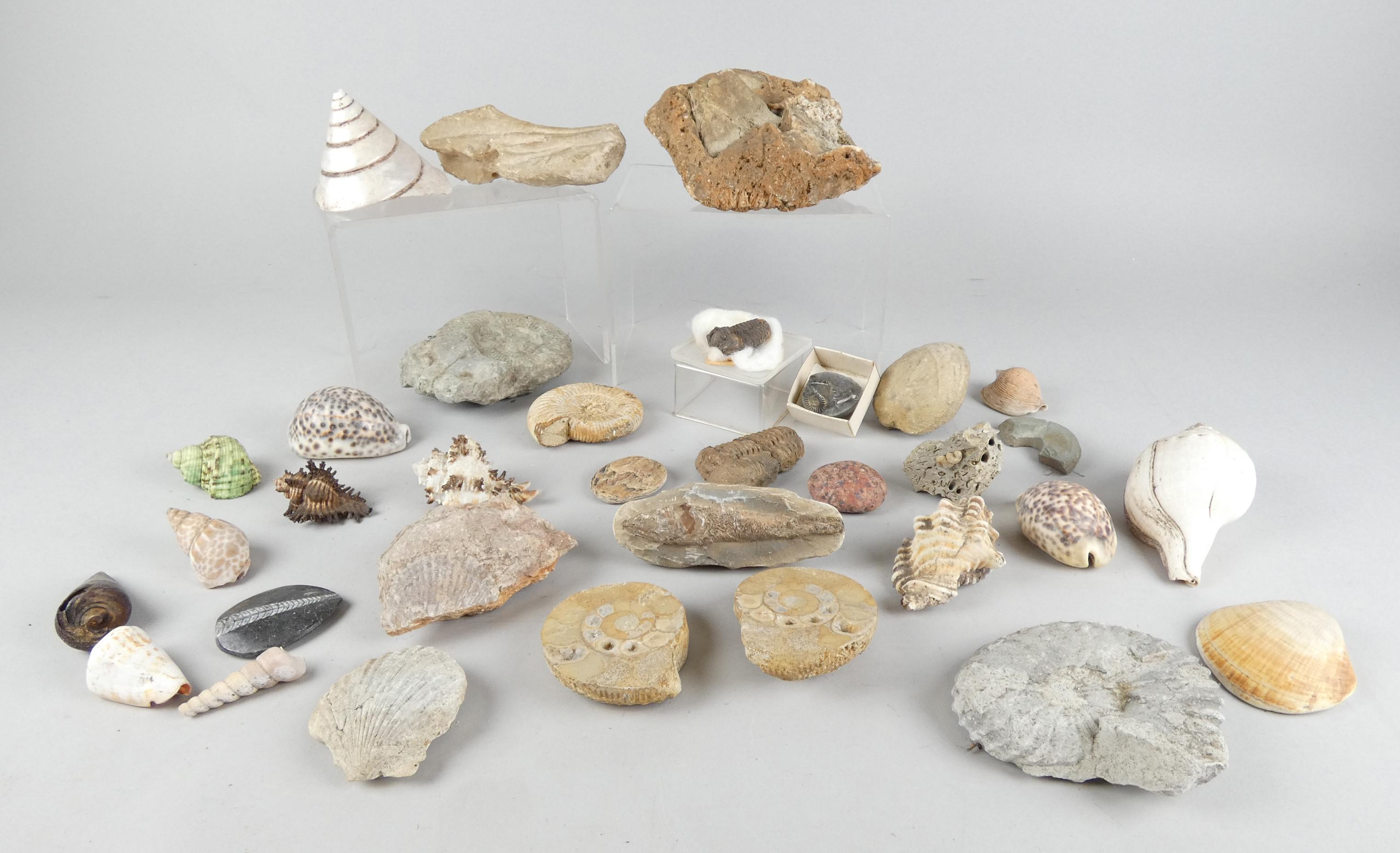 Collection: Fossiles dont trilobites, poisson, ammonite, bivalve et de coquillages dont trochus niloticus, laevistrombus canarium, turbo marmoratus, cypraea tigris