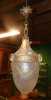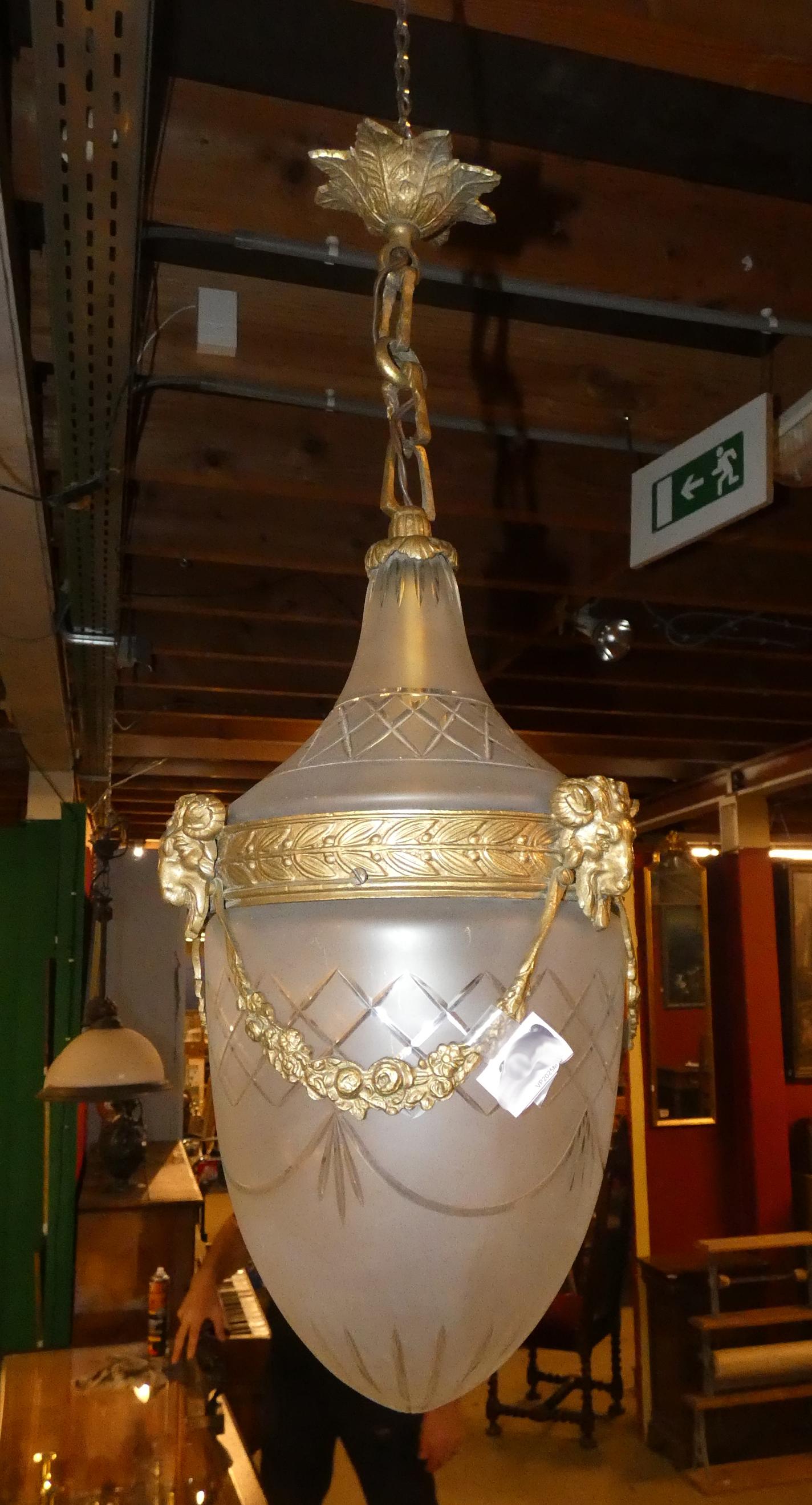 Luminaire: Lanterne goutte d'eau fin 19e début 20eS en bronze doré et cristal taillé mat têtes de bélier H:55cm