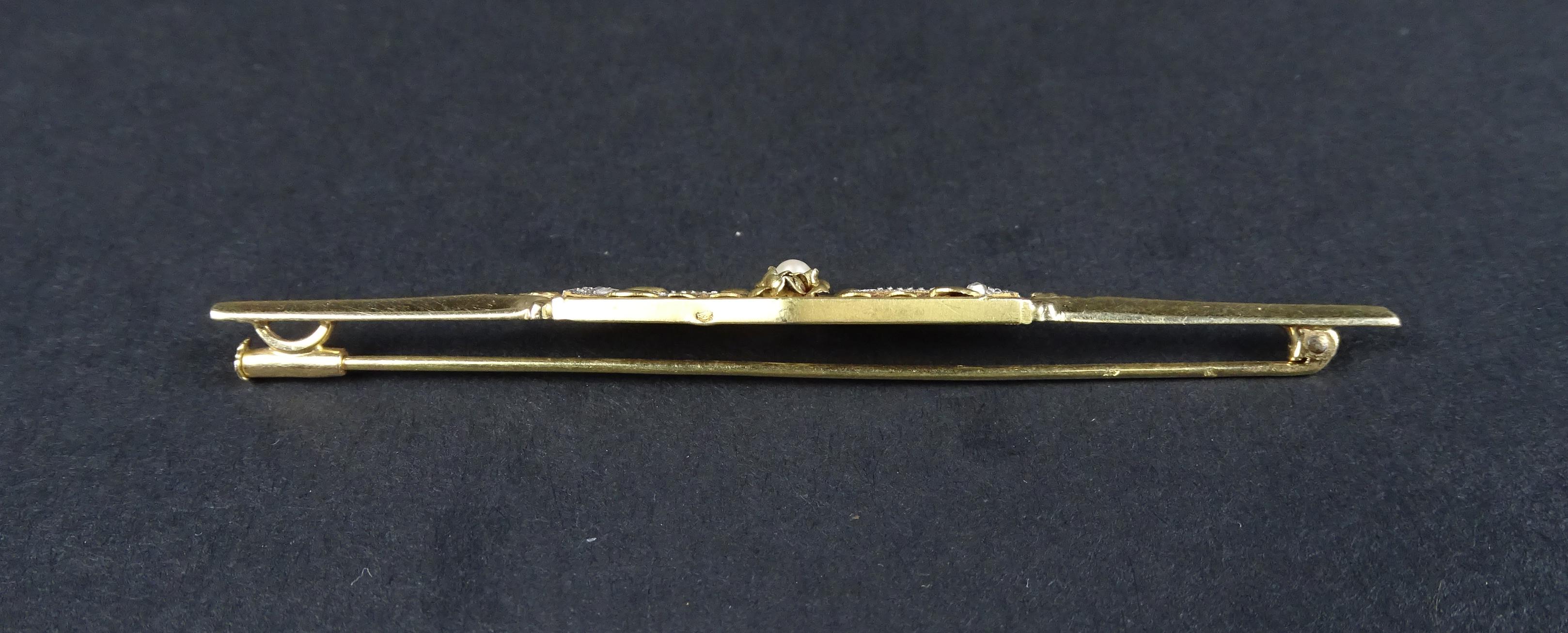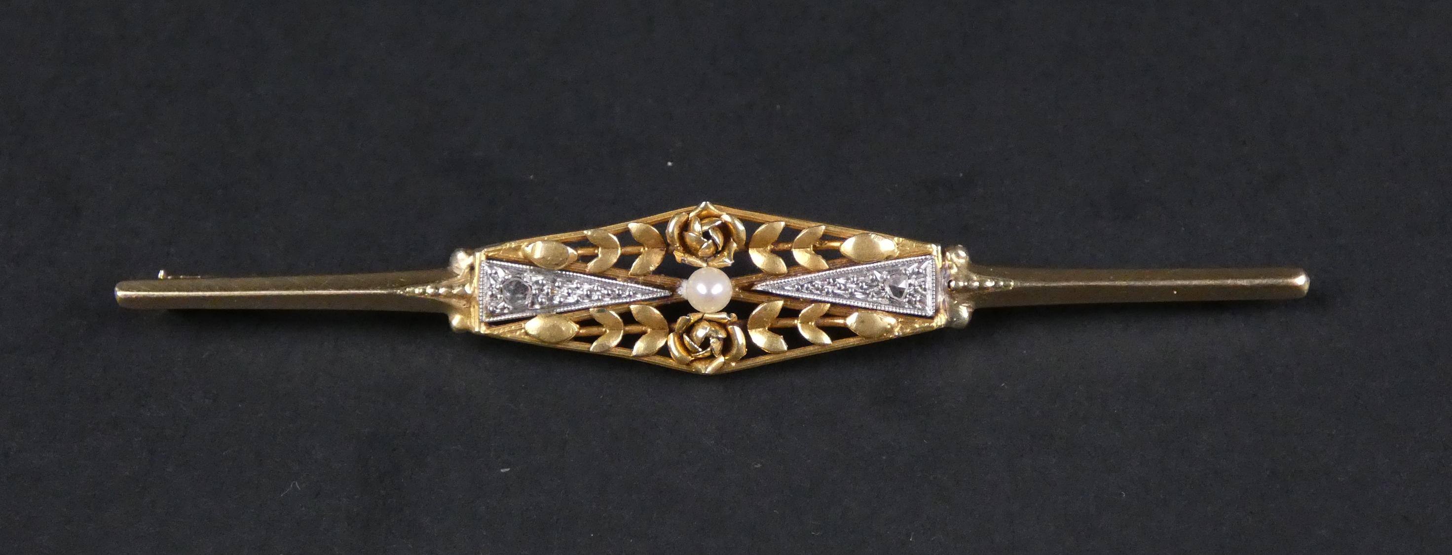 Bijou: Broche barrette en or jaune 18K sertie d'éclats de dimants et d'une petite perle P: 5,6g L: 8cm