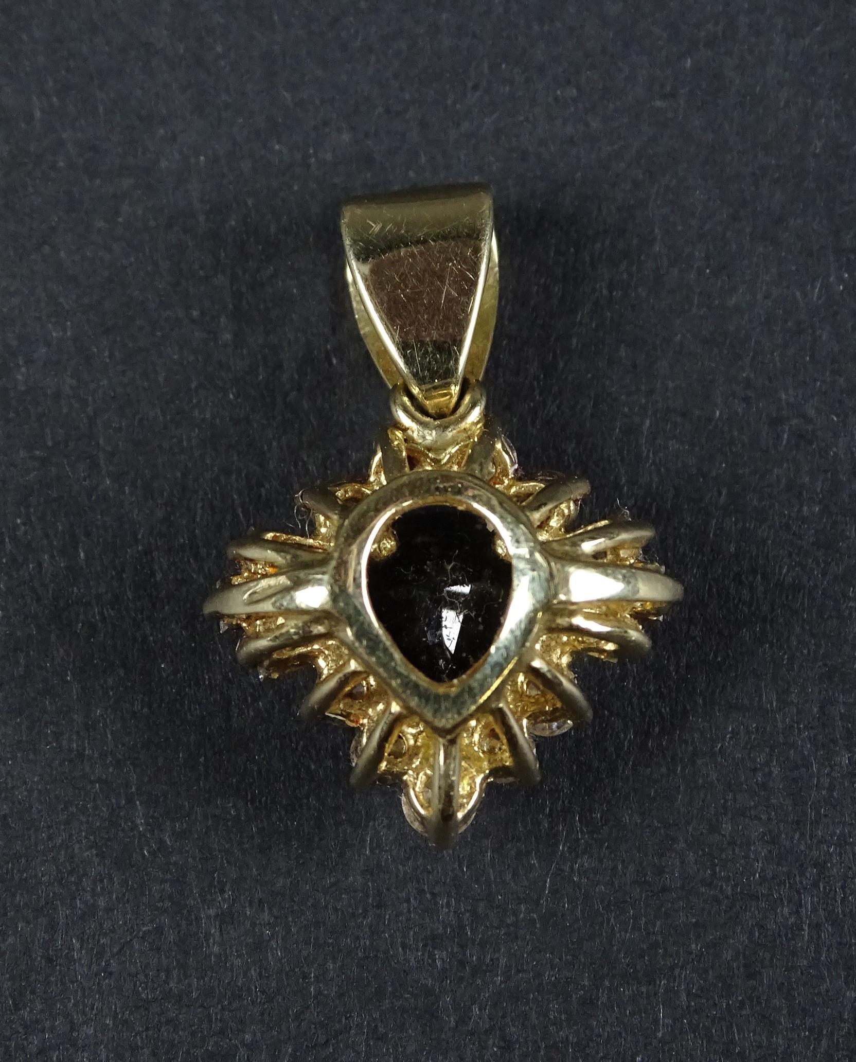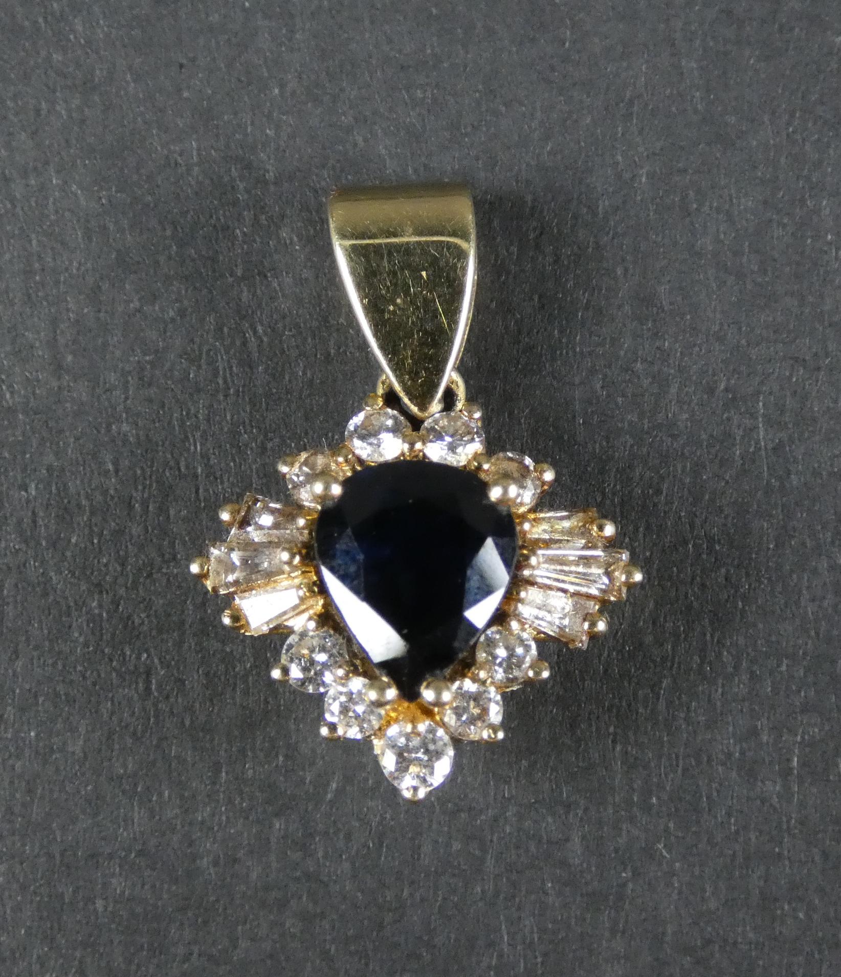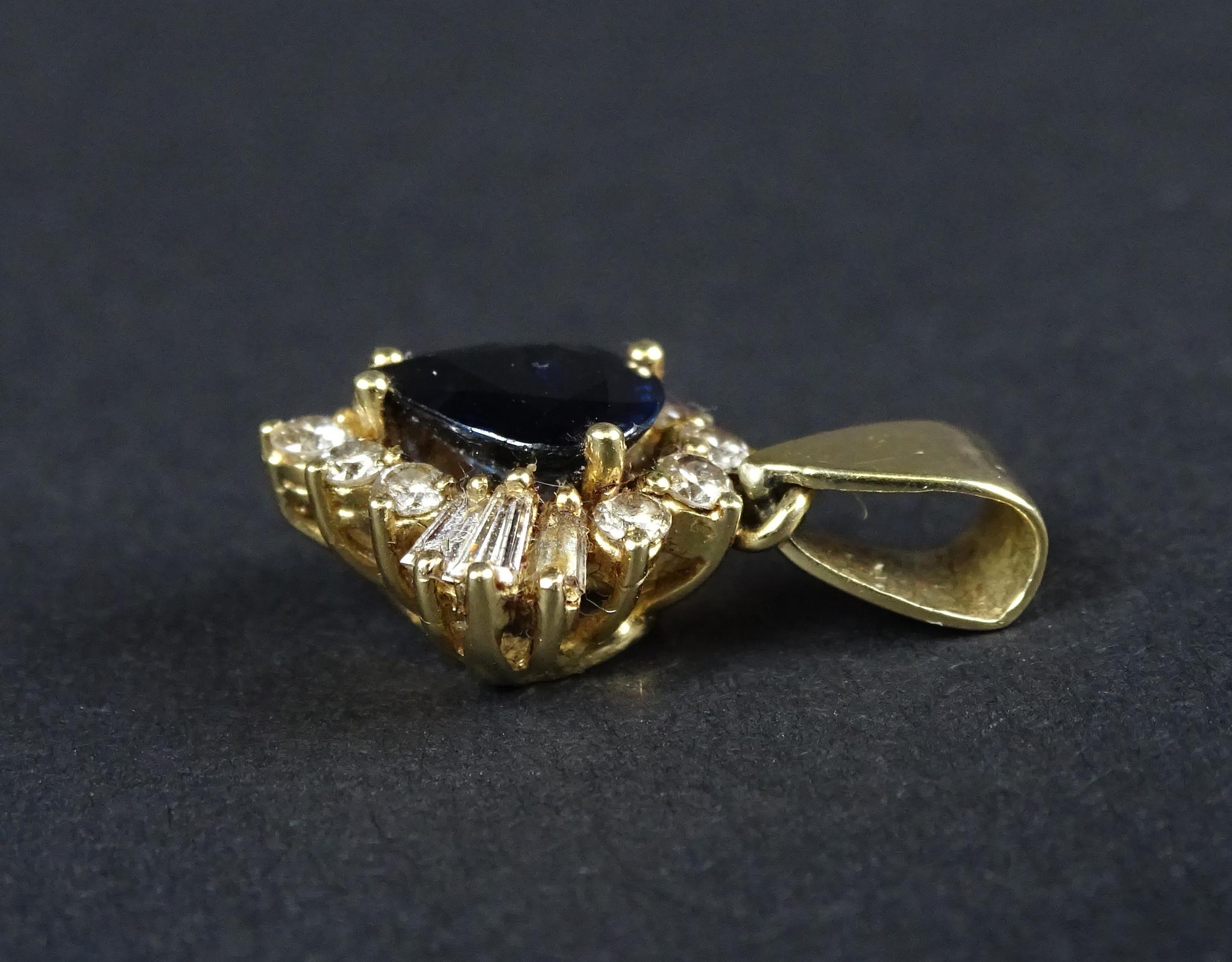 Bijou: Pendentif en or jaune 18K serti en son centre d'un saphir d'env. 1cts entouré de 9 diamants ronds et 6 baguettes P: 3,3g