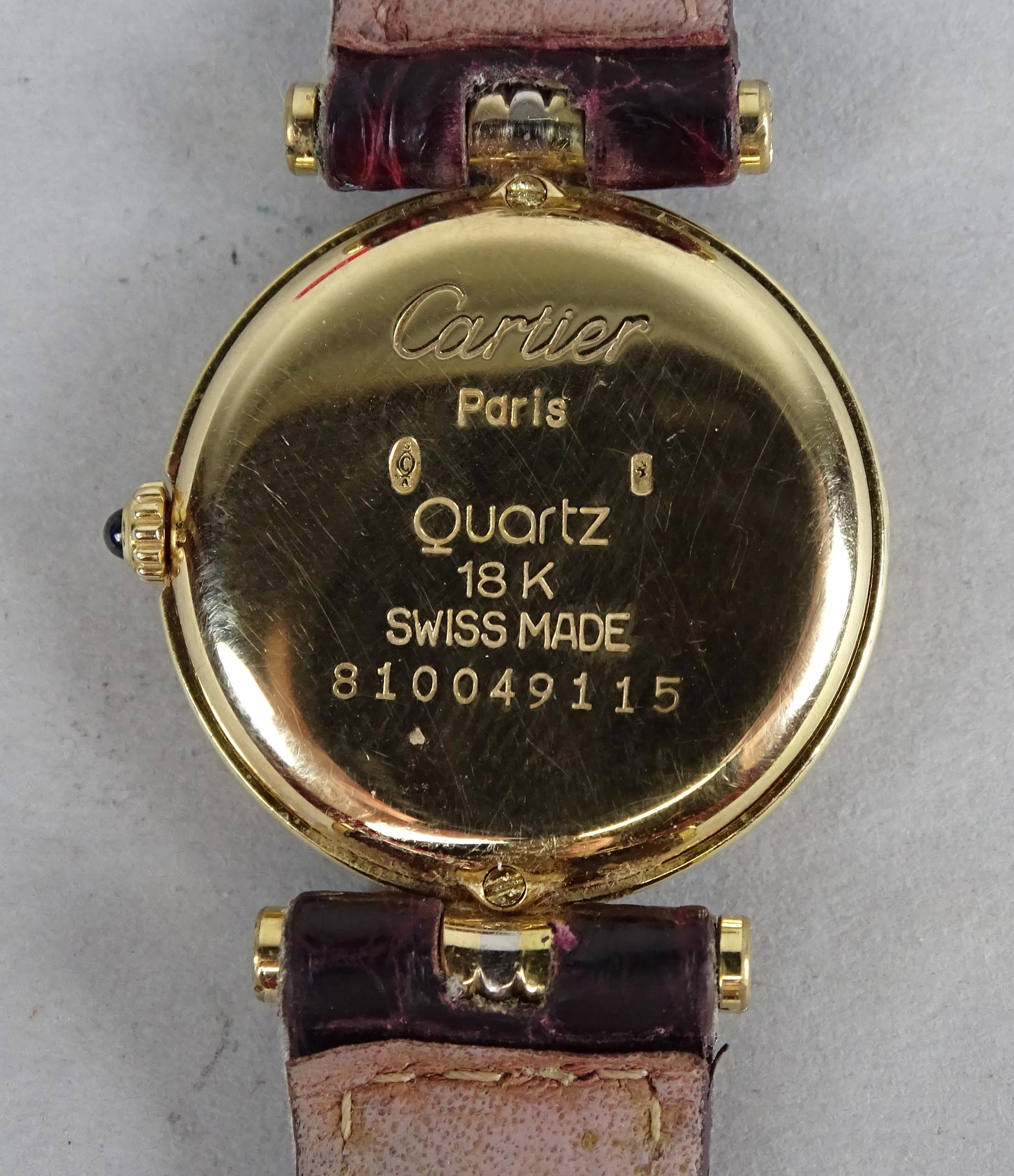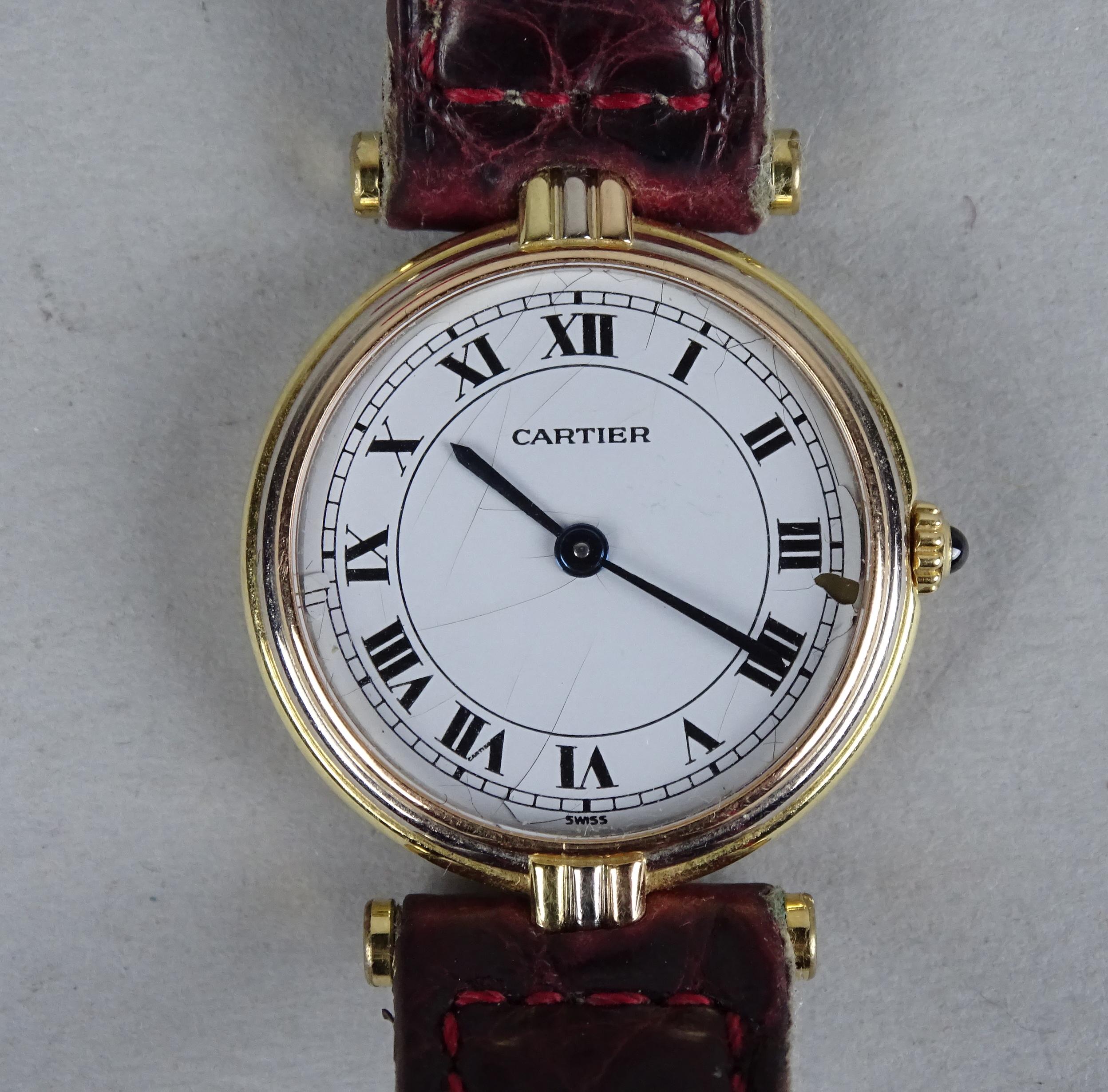 Bijou: Montre bracelet de dame CARTIER modèle Vendôme boitier en or 3tons 18K mvt à quartz (ds l'état, cadran acc) boucle en métal doré D:25mm Pbrut:18,7g bracelet (usures)