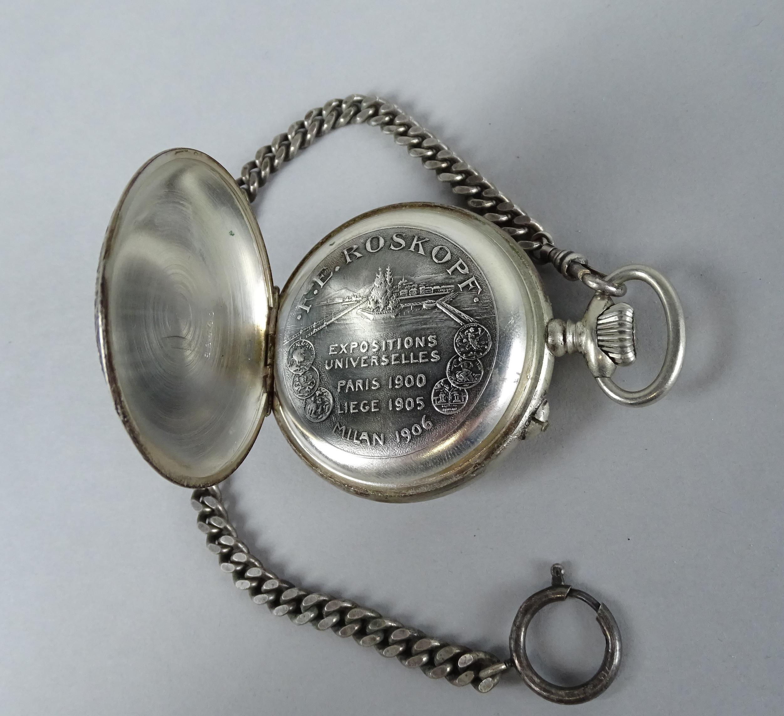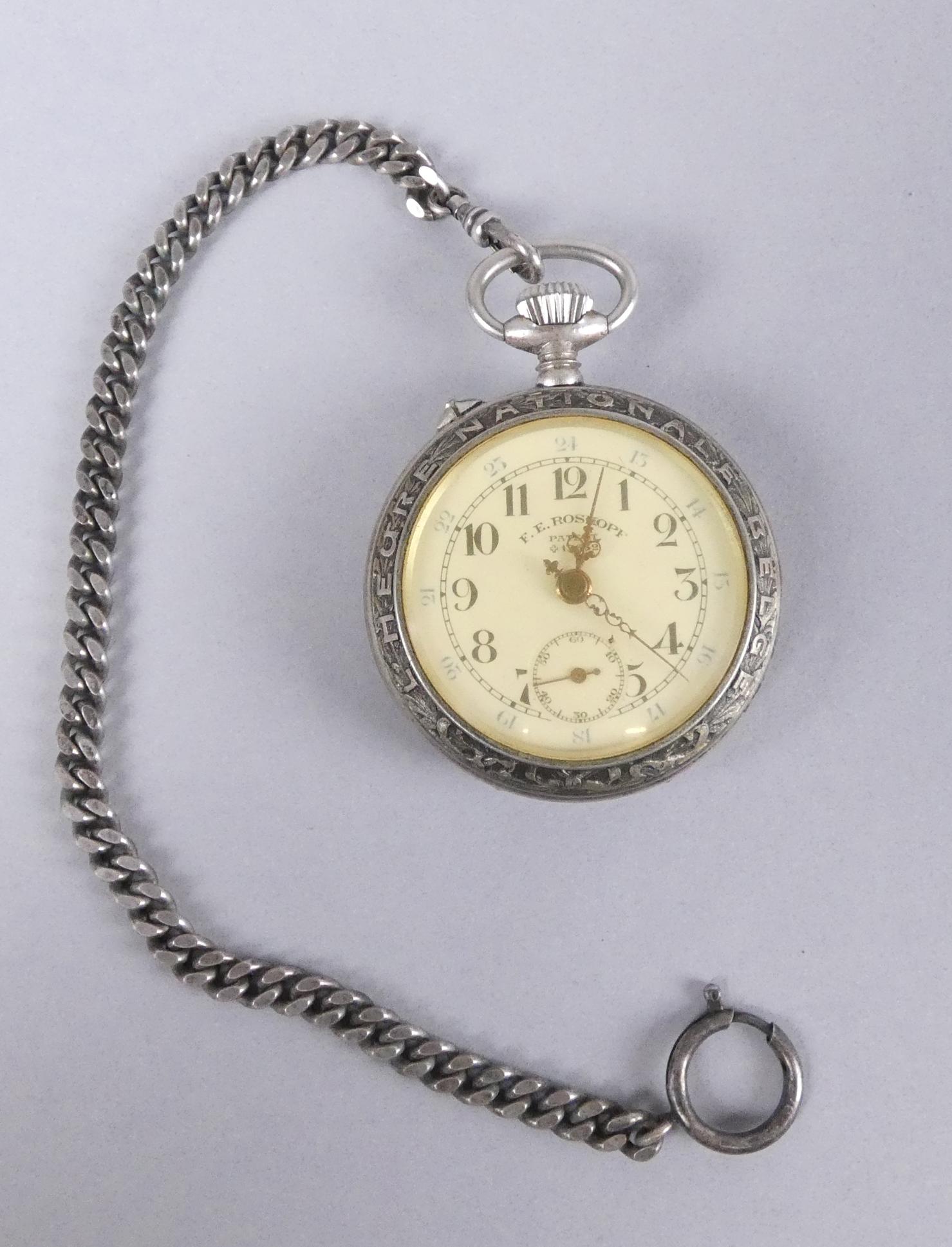 Bijou: Montre de gousset -L'heure nationale Belge- cuvette ext aux 9 provinces F.E. ROSKOPF en métal argenté mvt à remontoir (En état) D: 54mm