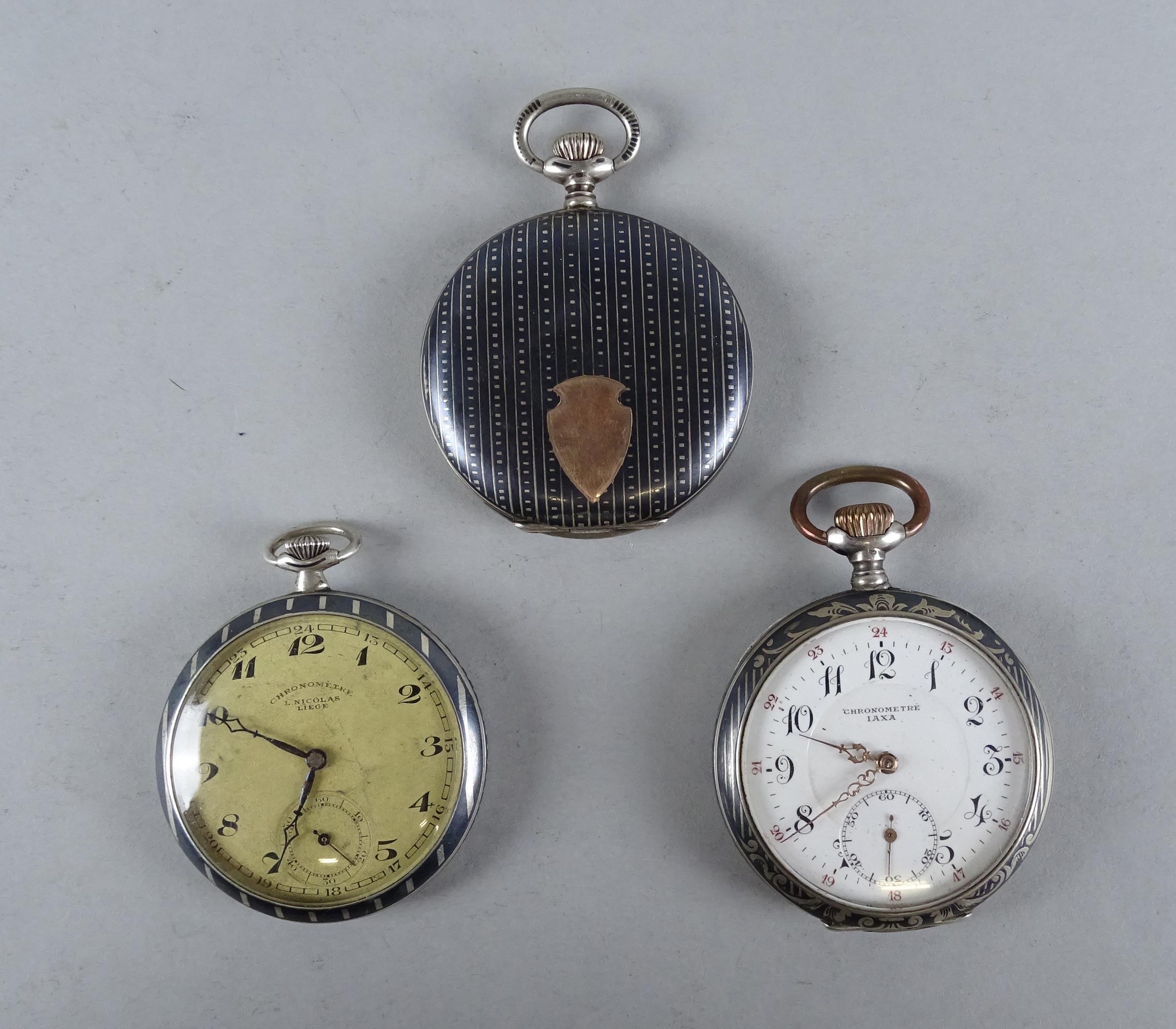 Bijou : Montre de gousset en argent niellé mouvement à remontoir (3) (En état) : Savonnette Tavannes Watch (mqe) , IAXA , Chronomètre L.Nicolas Liège