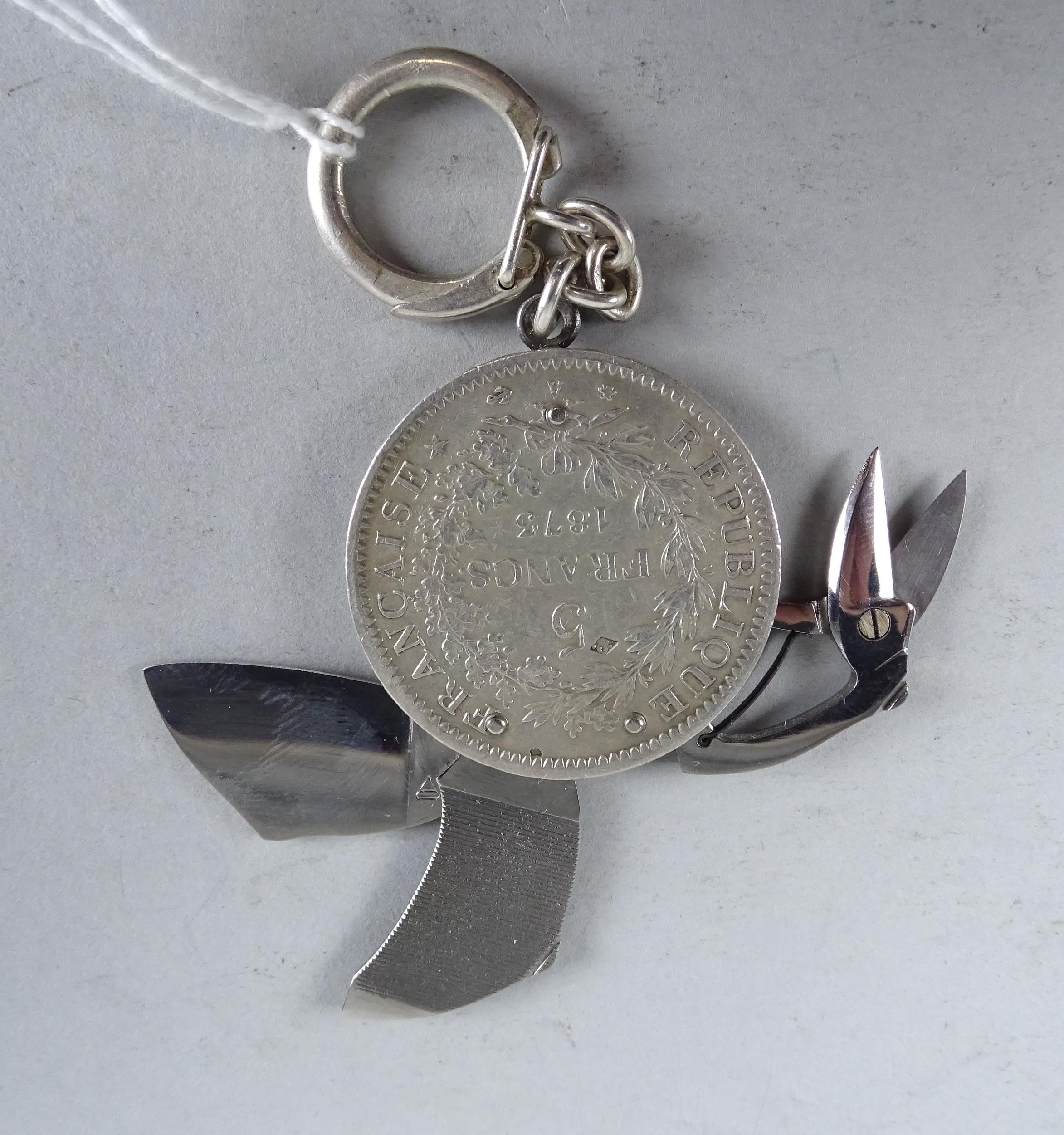 Bijou: Pièce de 5F en argent Hercule 1873 à système ELOI PERNET pour HERMES Paris kit manucure, ciseau, canif et lime total 33,2g diam: 3,7cm