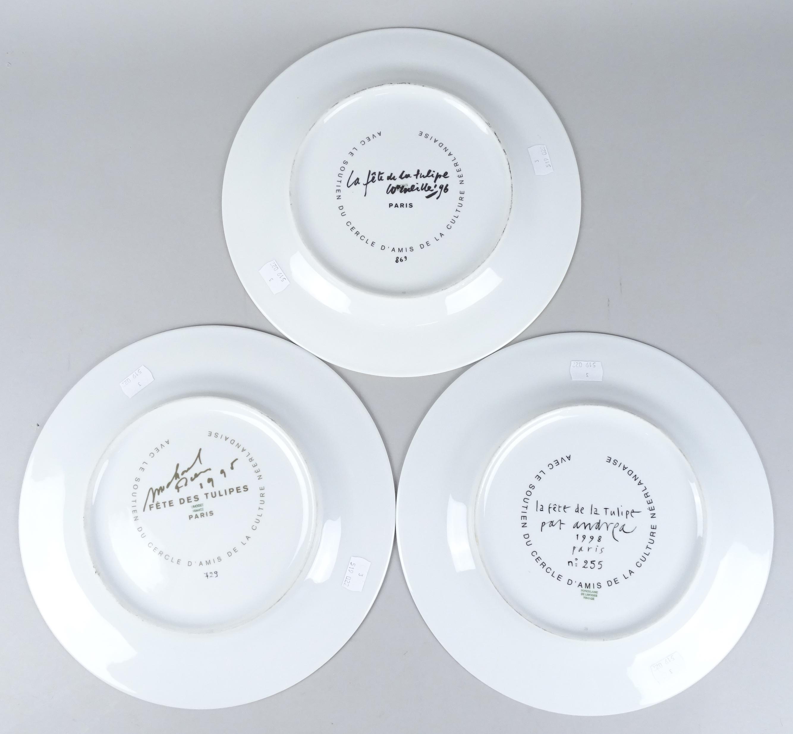 Céramique: assiettes en porcelaine de Limoges -La fête de la tulipe Paris-(3): 1 marquée Corneille 96 n°869 + 1 Andréa 1998 N°255 + 1 de 1995 N°729