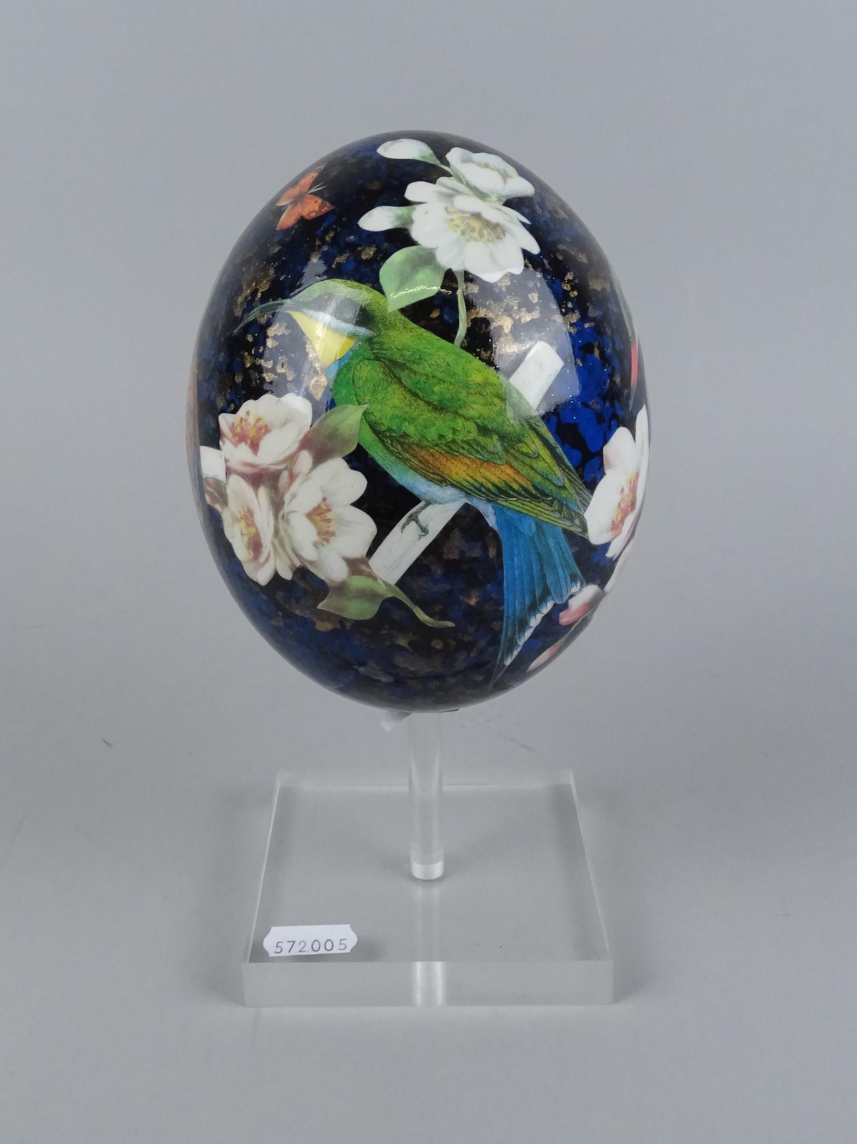Objet: Oeuf d'autruche décor d'oiseau et de fleurs signé ROWE Sherry H:11cm sur socle en plexi