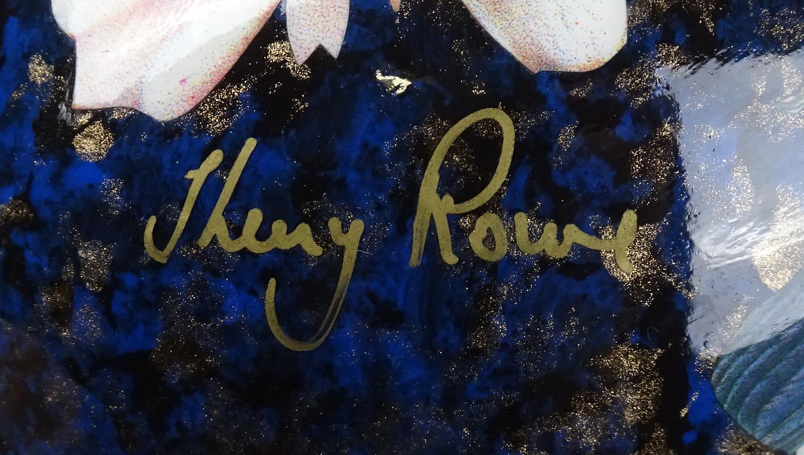 Objet: Oeuf d'autruche décor d'oiseau et de fleurs signé ROWE Sherry H:11cm sur