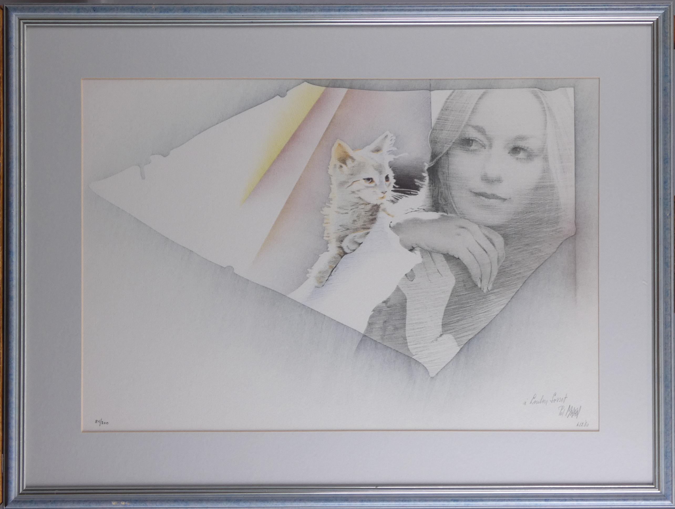 Estampe: Lithographie couleur -Femme au chat- daté 80 N°84/200 signé *MARA P.* (Pol) (1820, 1998) dédicacé 36x52cm cadre moderne sous plexiglas