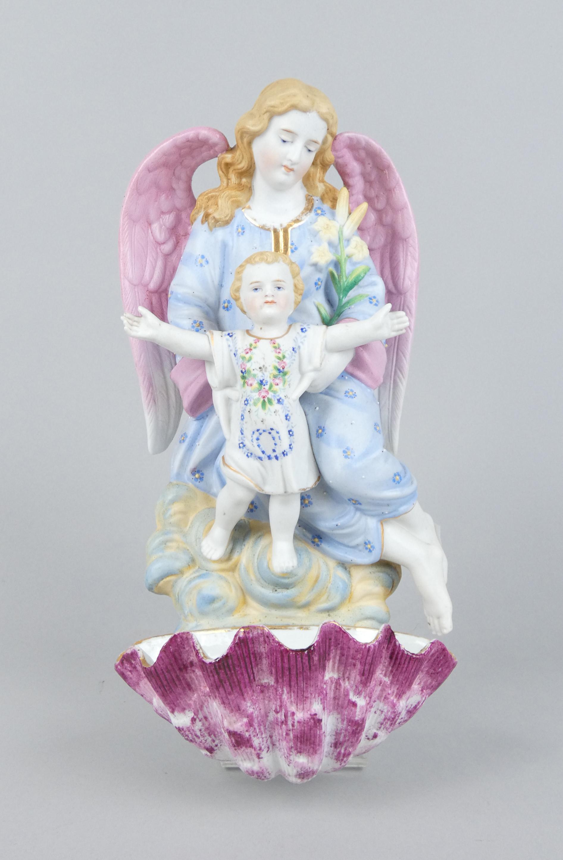 Céramique: Bénitier biscuit polychrome -Jésus et ange- début 20èS H:30cm
