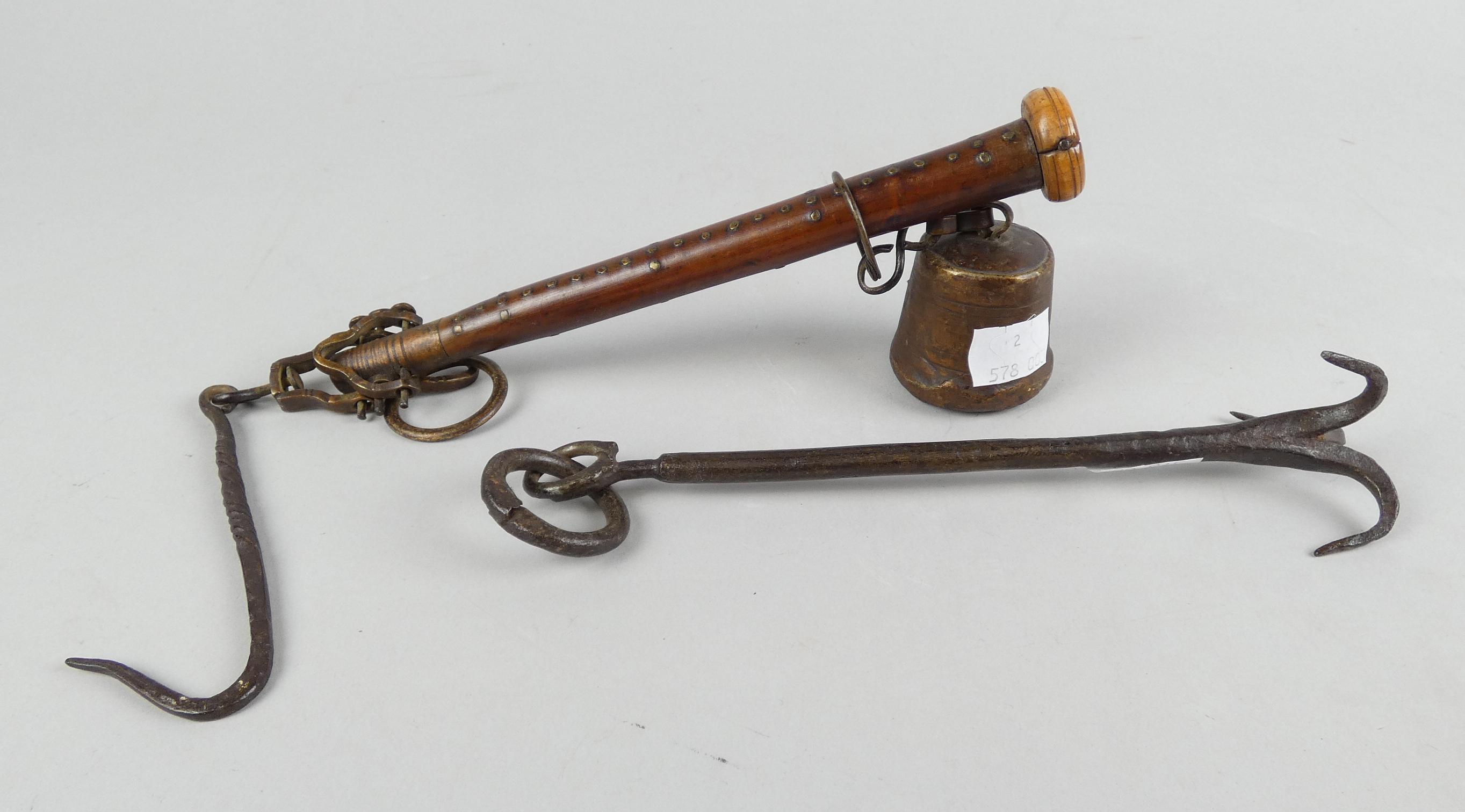 Objet: Balance romaine en bois et fer forgé + grappin en fer forgé