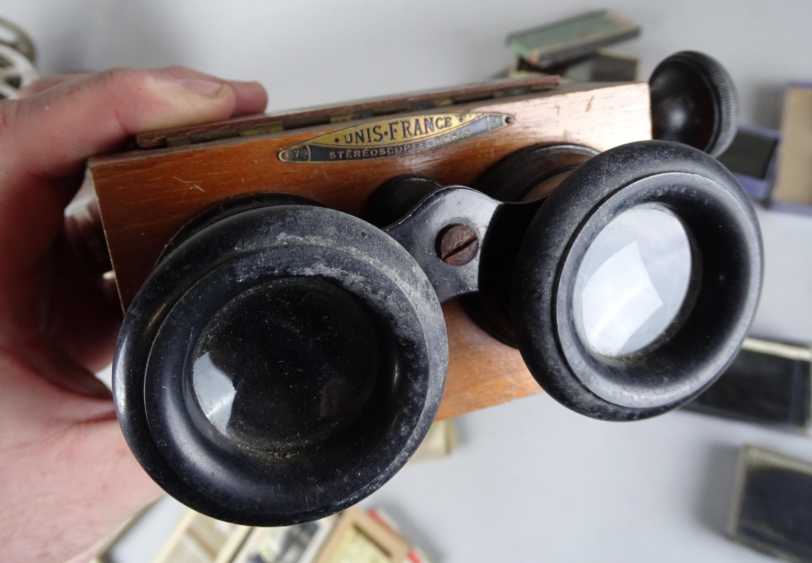 Objets: Stéréoscope en bois avec important lot de photos sur carton et plaques de verre + 1 projecteur / lanterne magique (ds l'état) avec 2 bobines