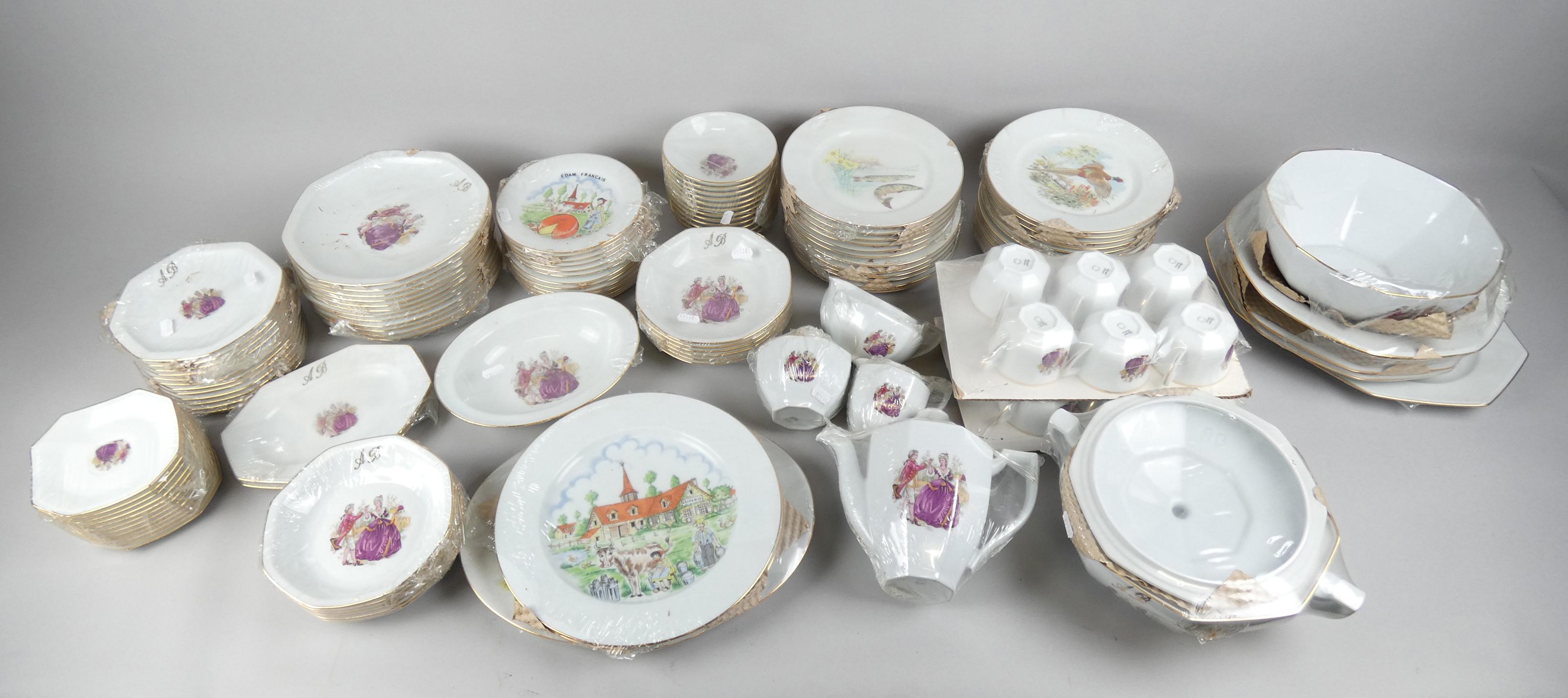 Céramique: Service à diner et à café en porcelaine de LIMOGES (+/-120pcs) neuf sous blister scène galante dont: 12 ass plates, 12 ass creuses, soupière, 7 plats.