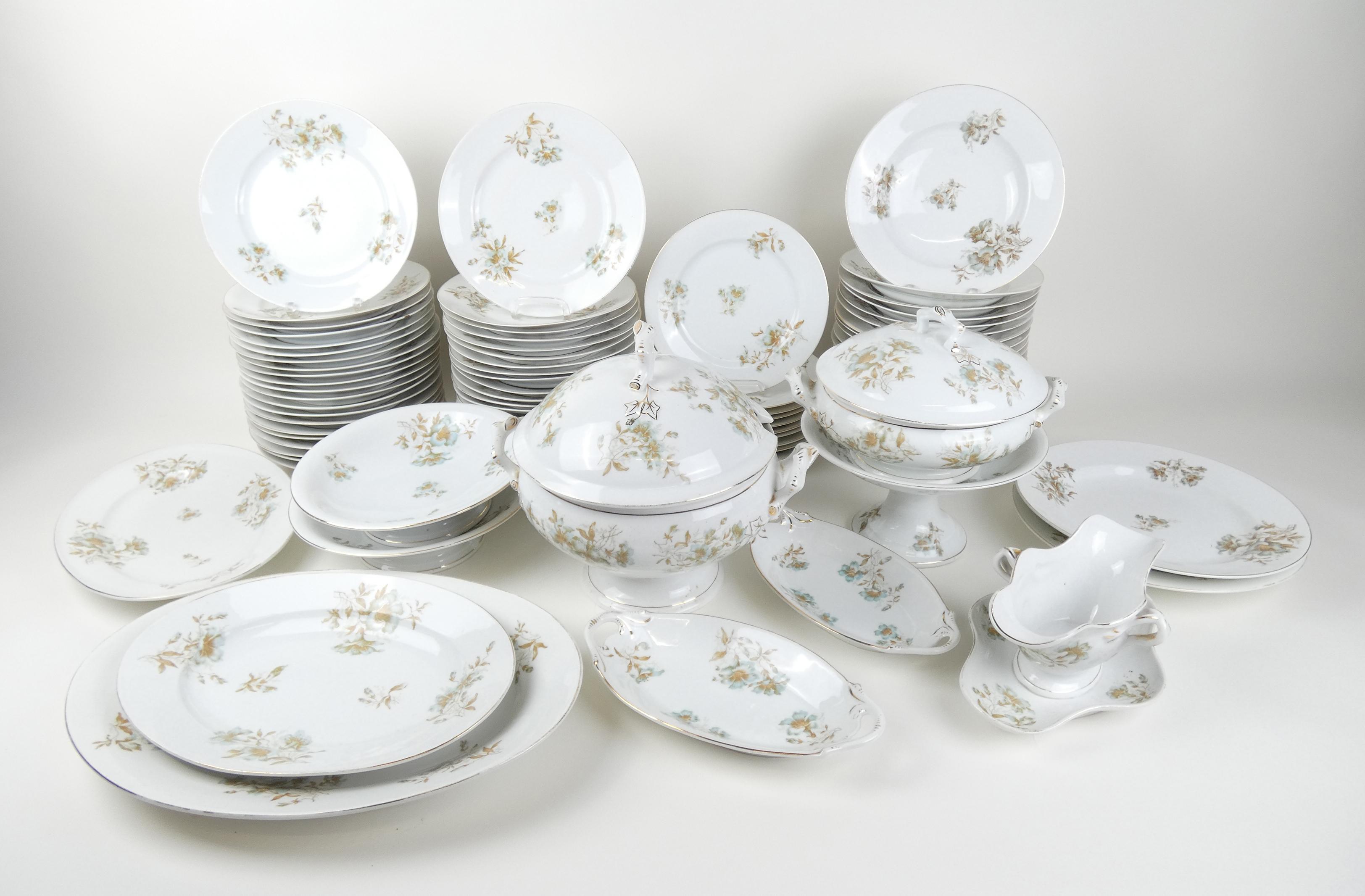 Céramique: Service à dîner à décor de fleurs (+/-80pcs): dont: soupière, légumier, coupes, 41 assiettes plates...