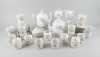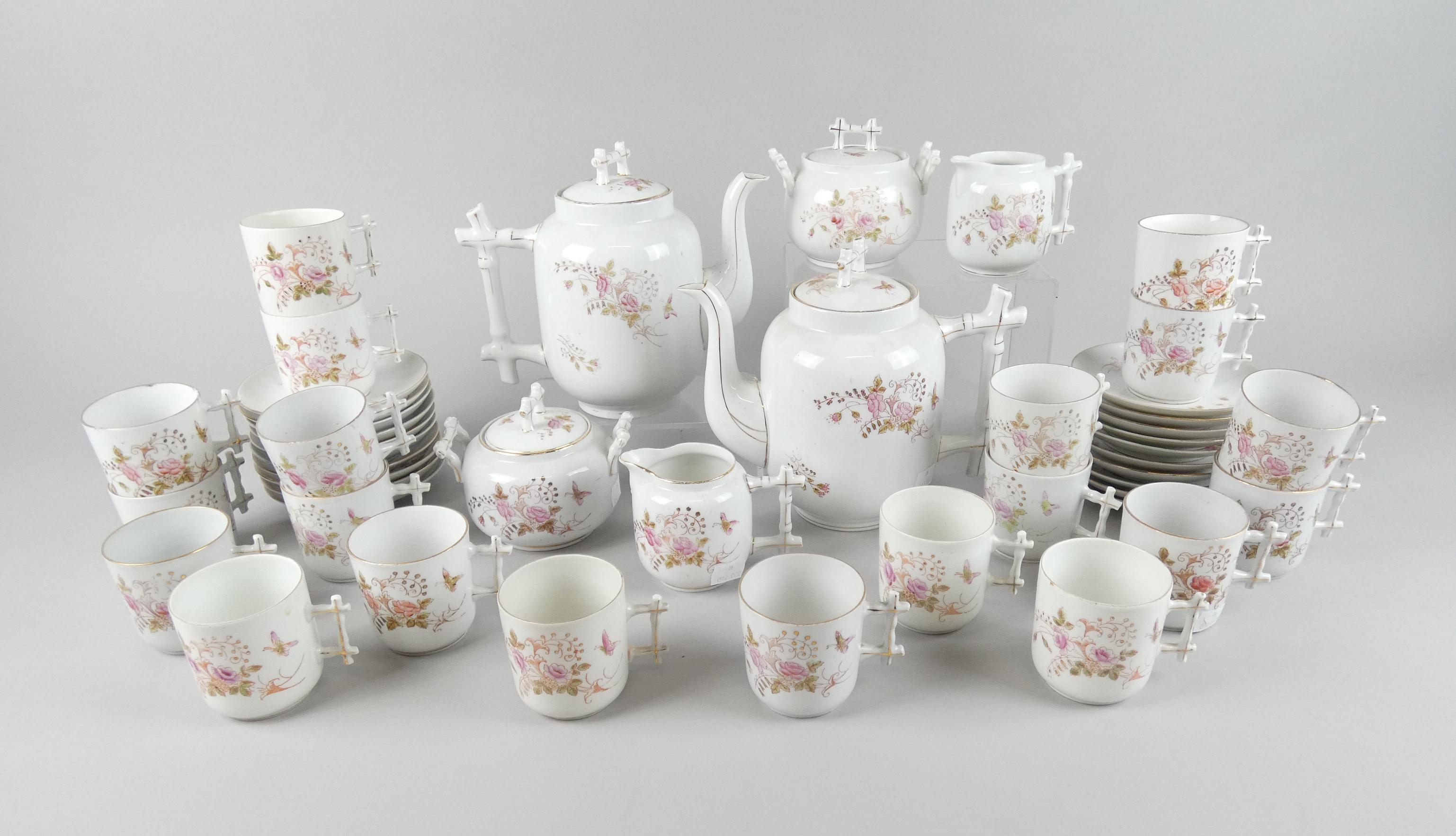 Céramique: 2 services à café à décor de fleurs et anse -bambous- (26pcs)