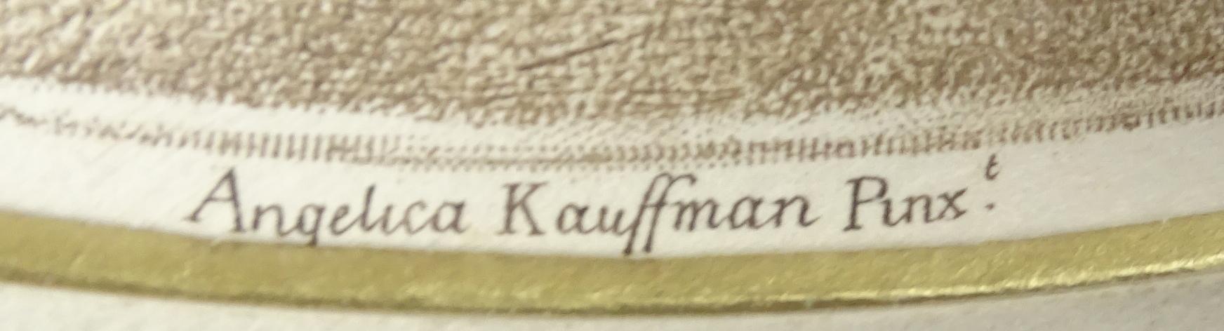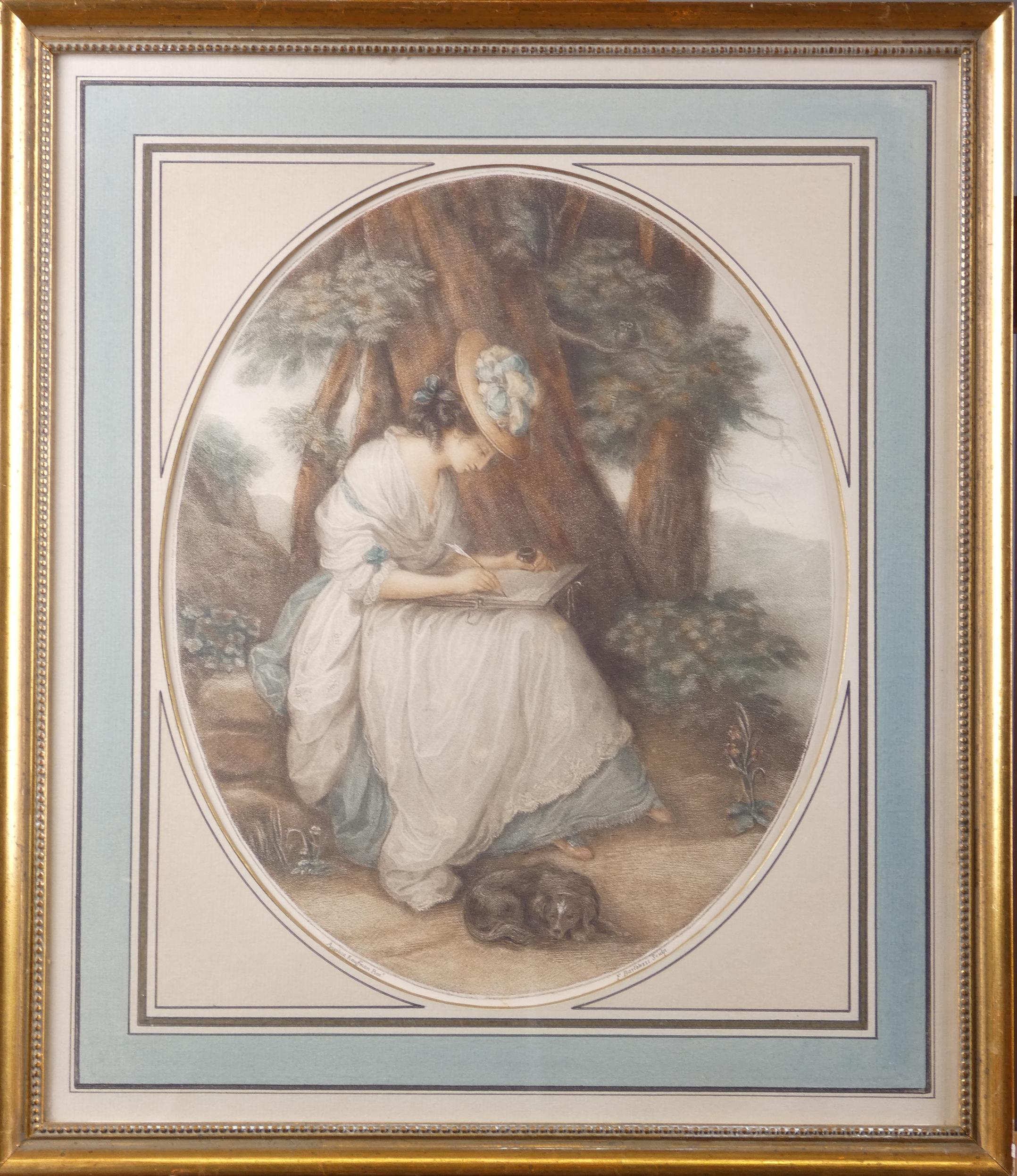 Estampe: Eau-forte polychrome -Dame au chien- *KAUFFMAN A.* (Angelica) (1741, 1807) sculpté par BARTOLOZZI Francesco (1728, 1815) 33x26cm cadre doré s-v