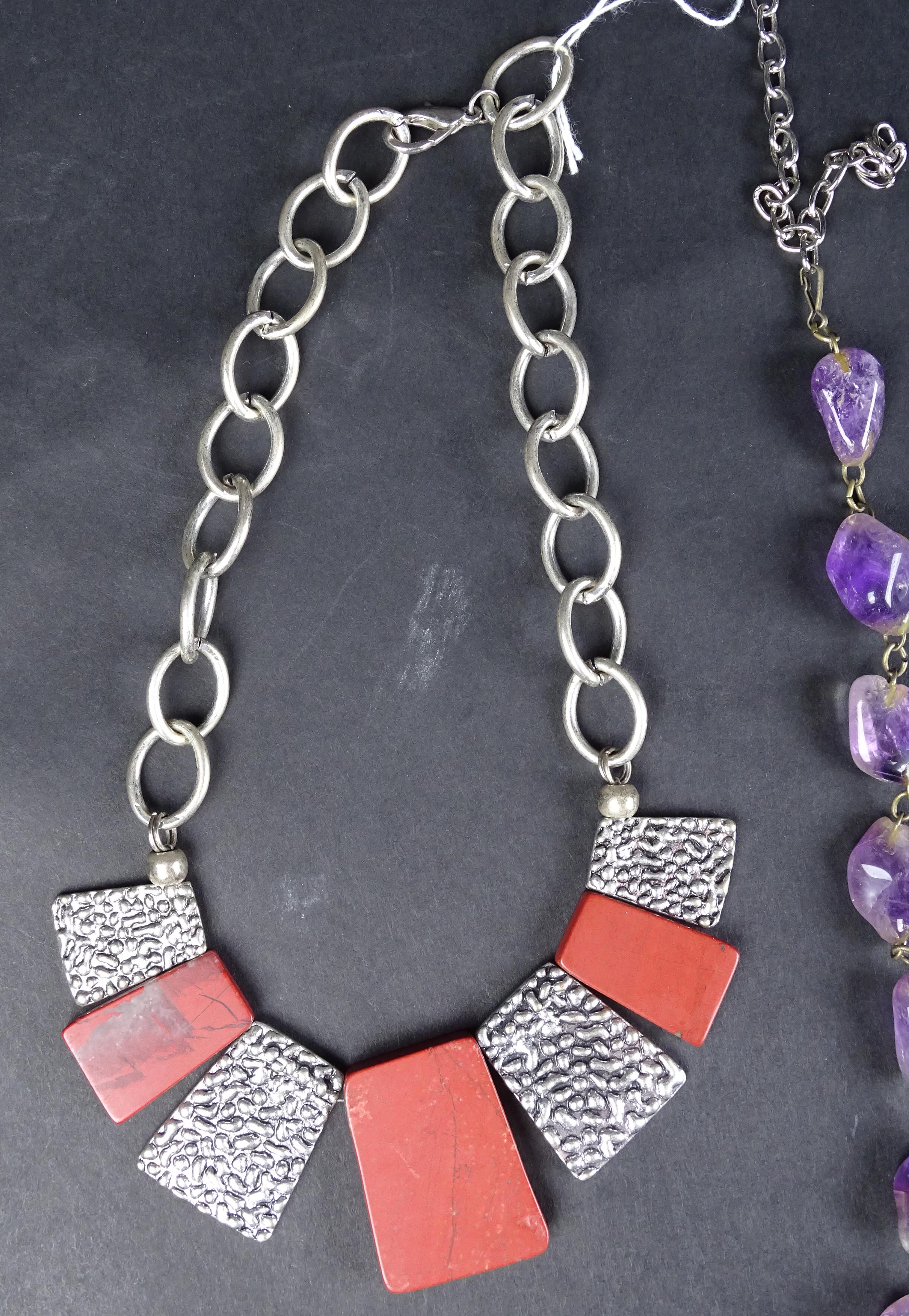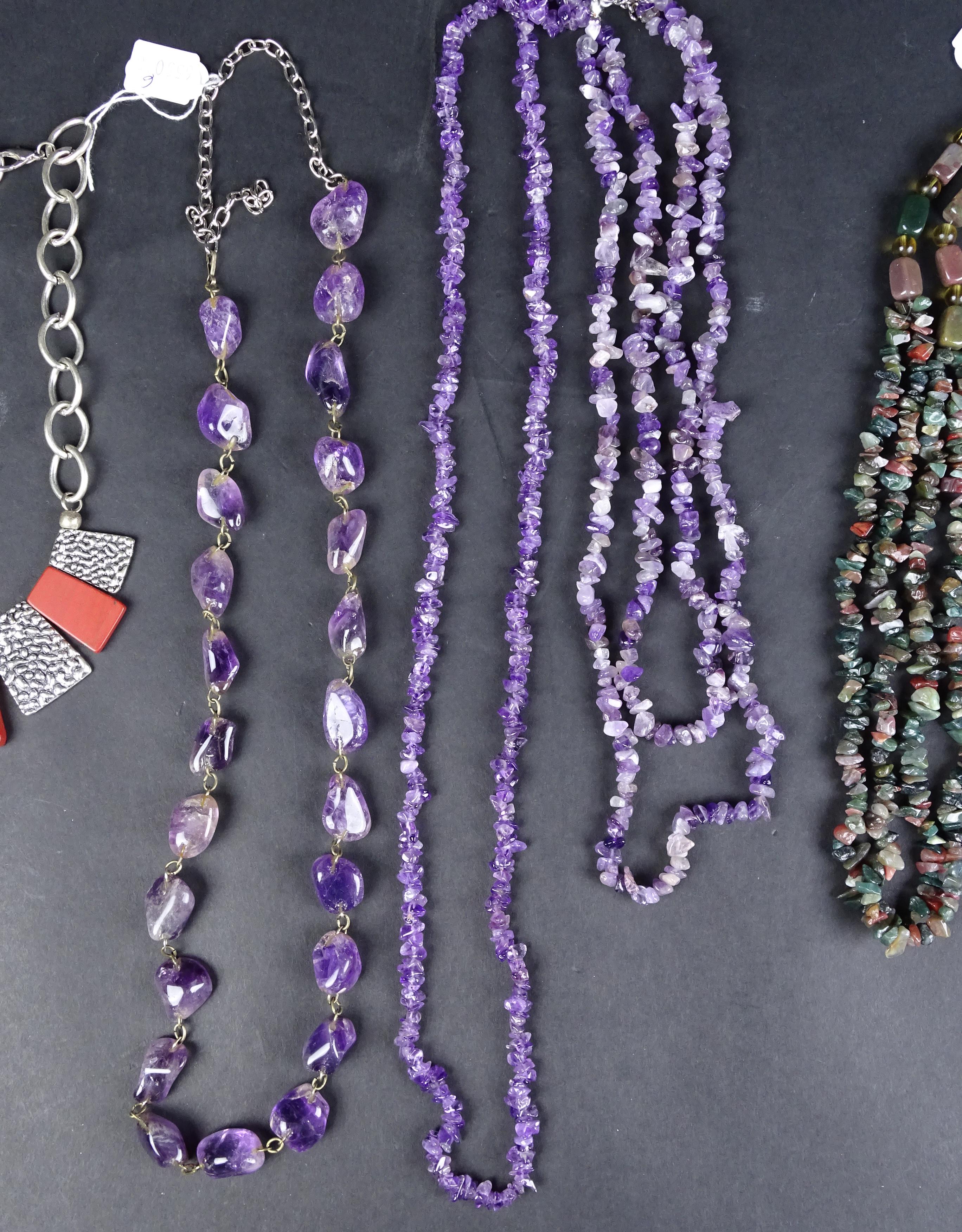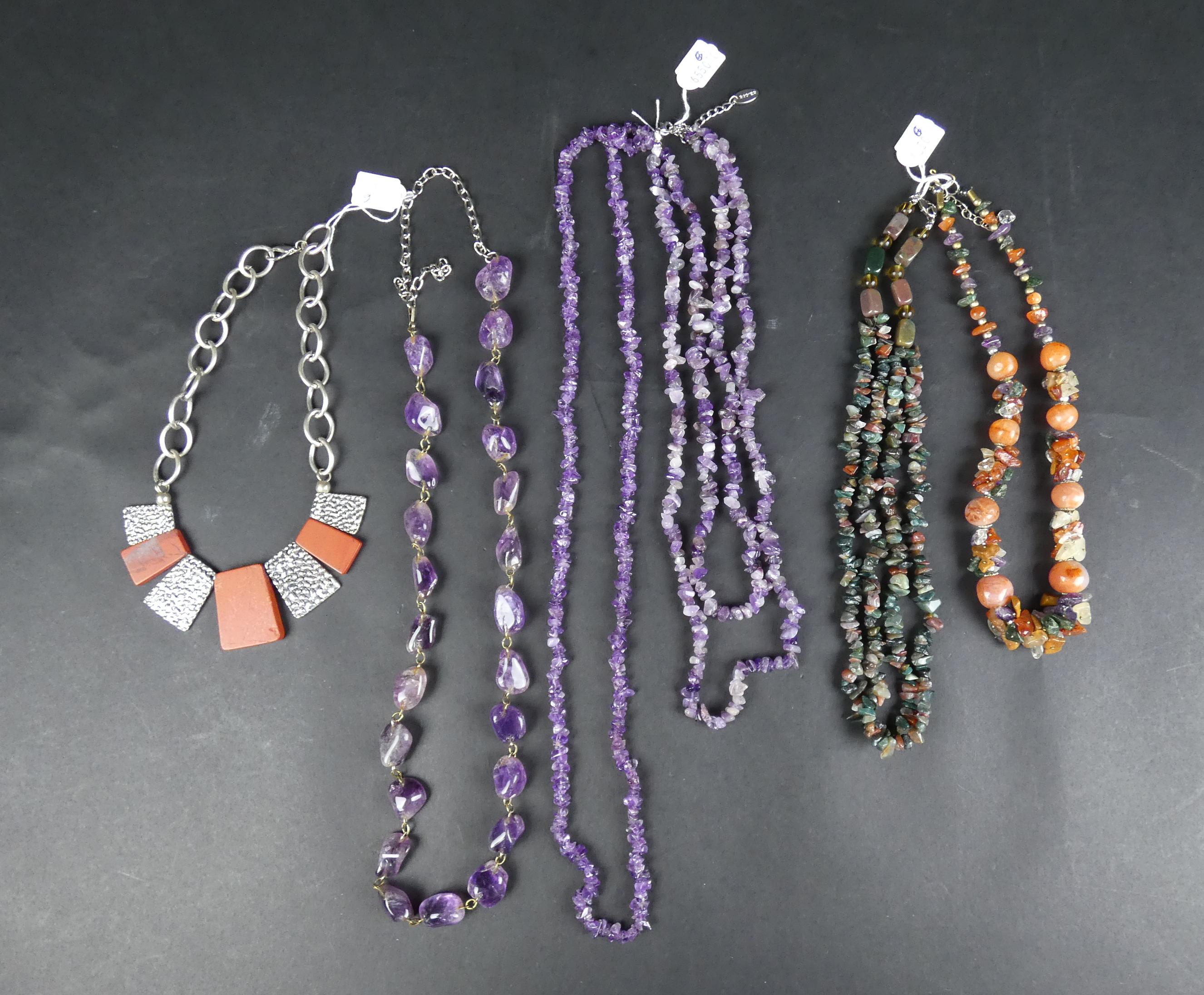 Bijou: 4 colliers de perles / chips en pierre (améthyste, agate indienne, cornaline) + collier améthyste + collier métal et jaspe rouge (6pcs)