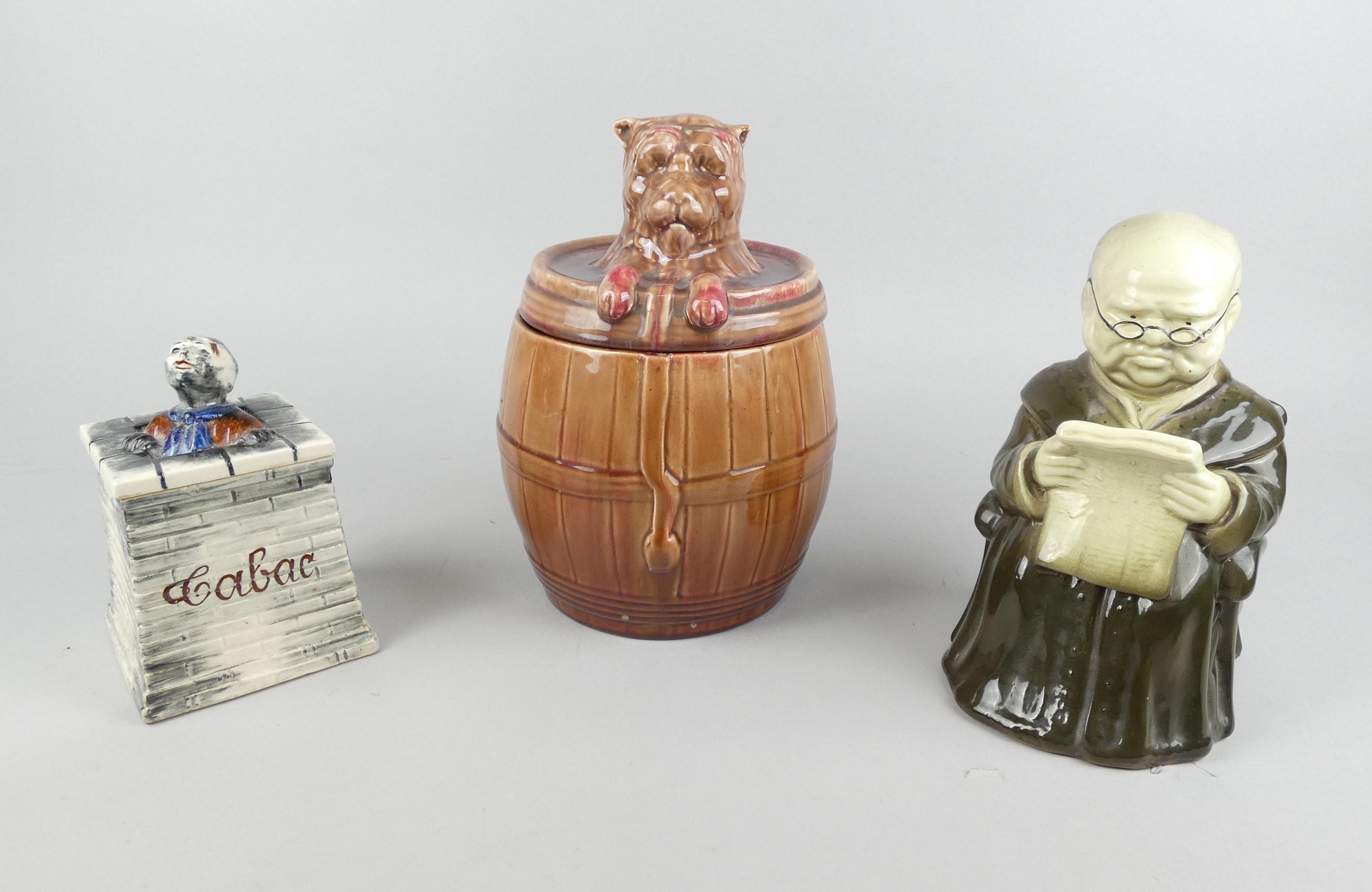 Céramique: Pot à tabac en faïence(3): Nimy Lecteur de journal H23 + Hasselt Chien dans tonneau (Ecl) H27 + ramoneur H16 (3pcs)
